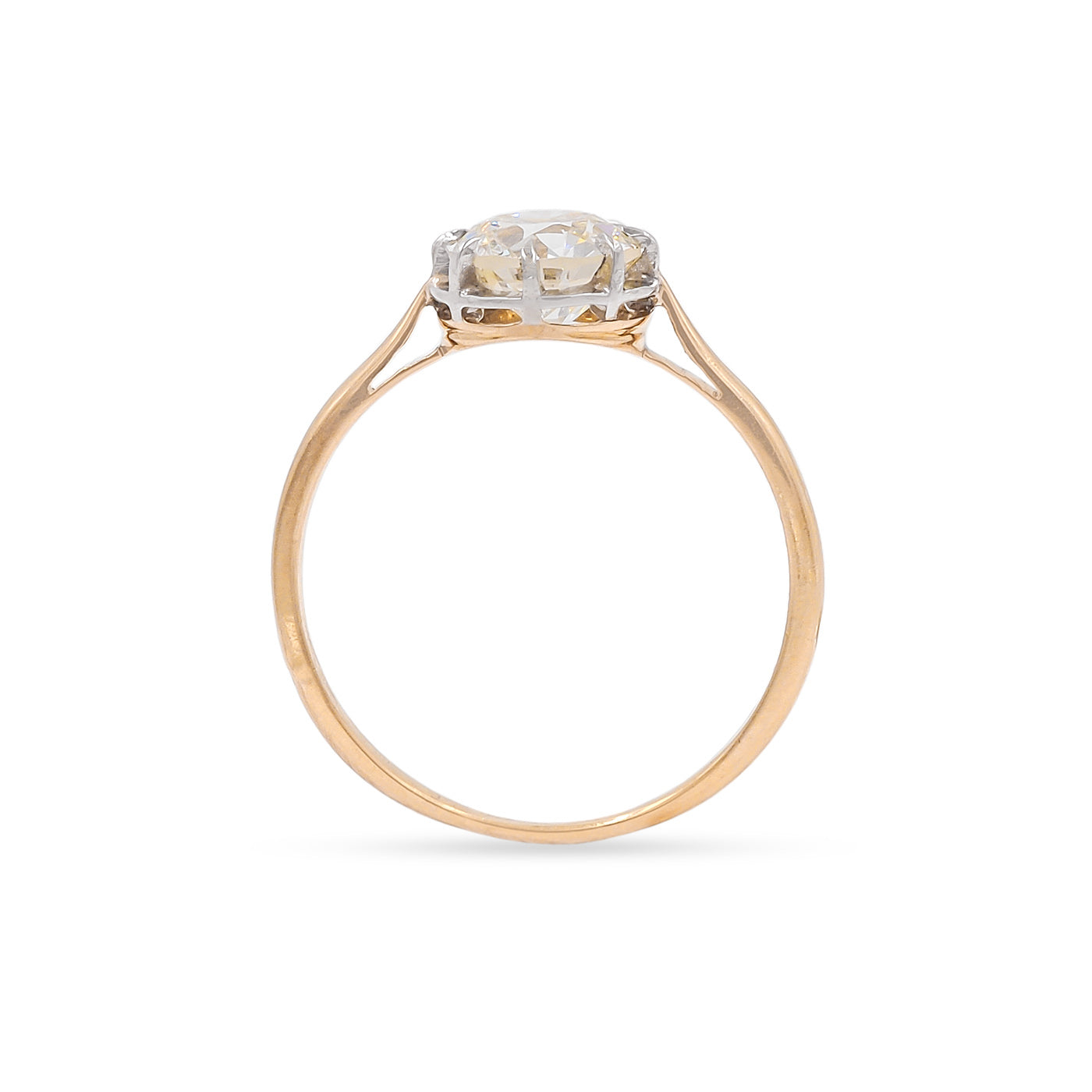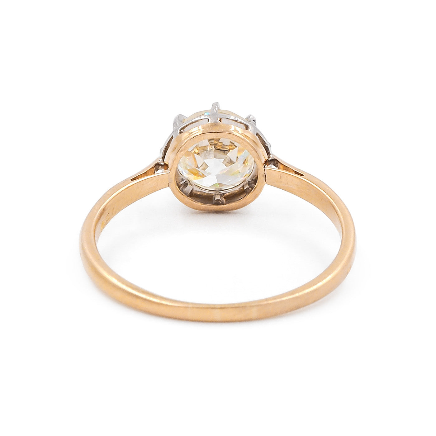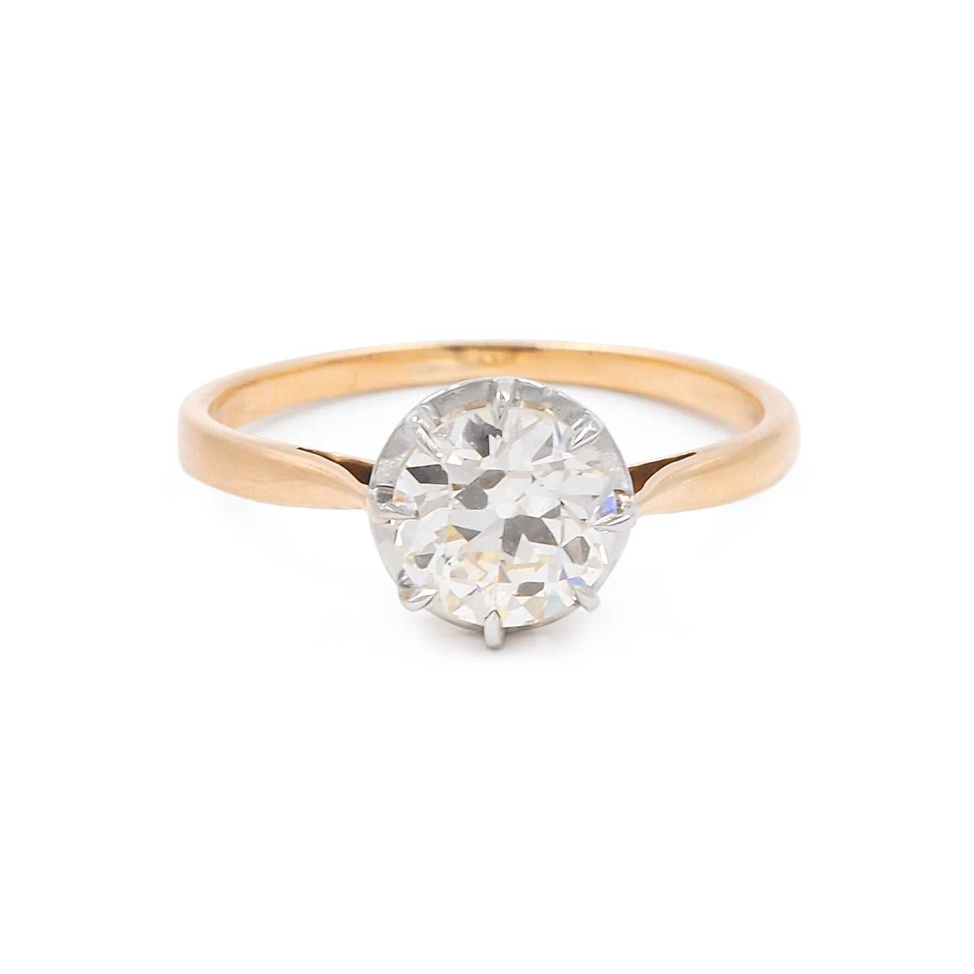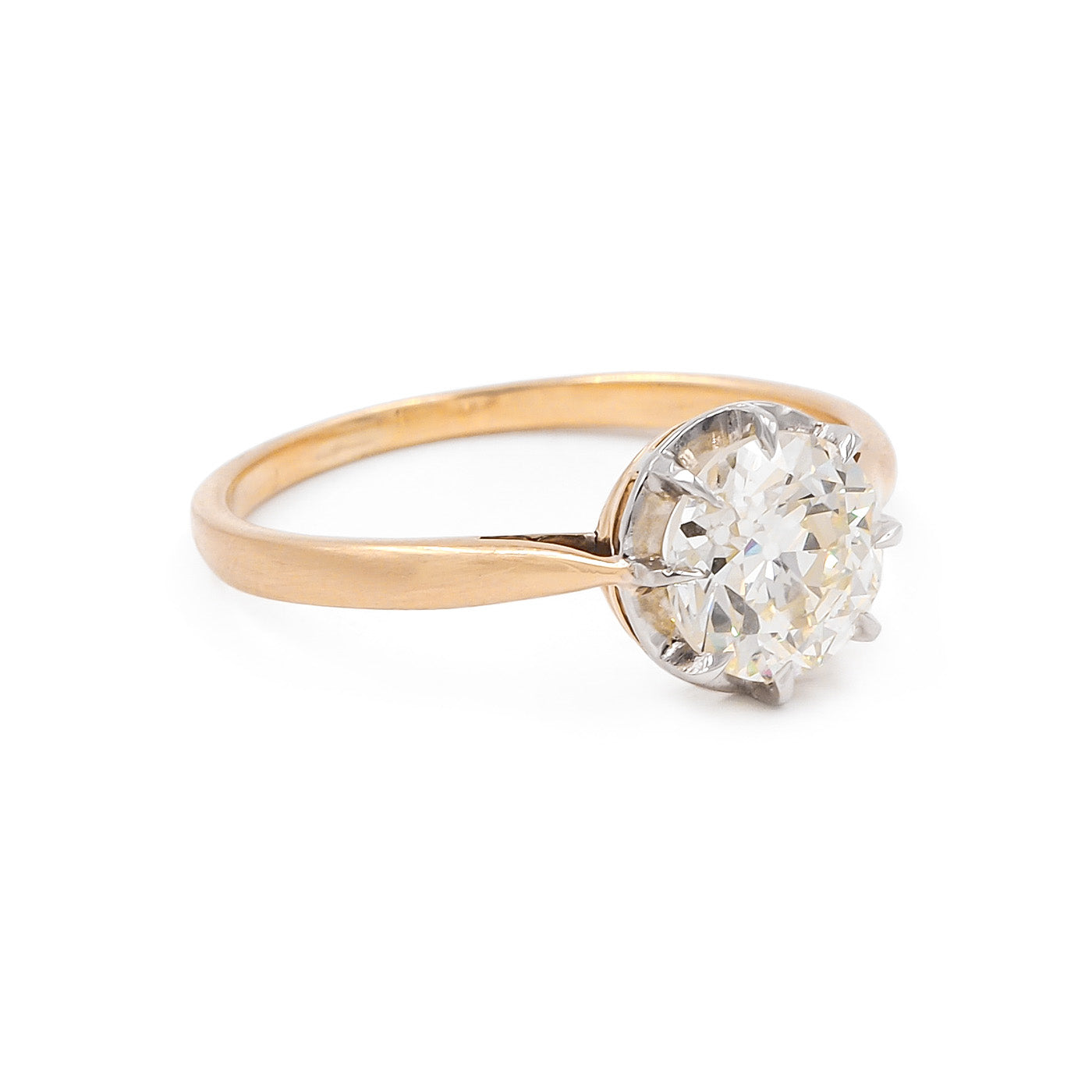 French Edwardian era 1.46 Carat Old European Cut Diamond Solitaire Engagement Ring composed of composed of 18k yellow gold and platinum. The 1.46 carat Old European Cut diamond is GIA certified O-P color/SI1 clarity. The diamond is set in a platinum multiple-claw prong setting, upon a 18k yellow gold shank with tapered shoulders. Circa 1910.