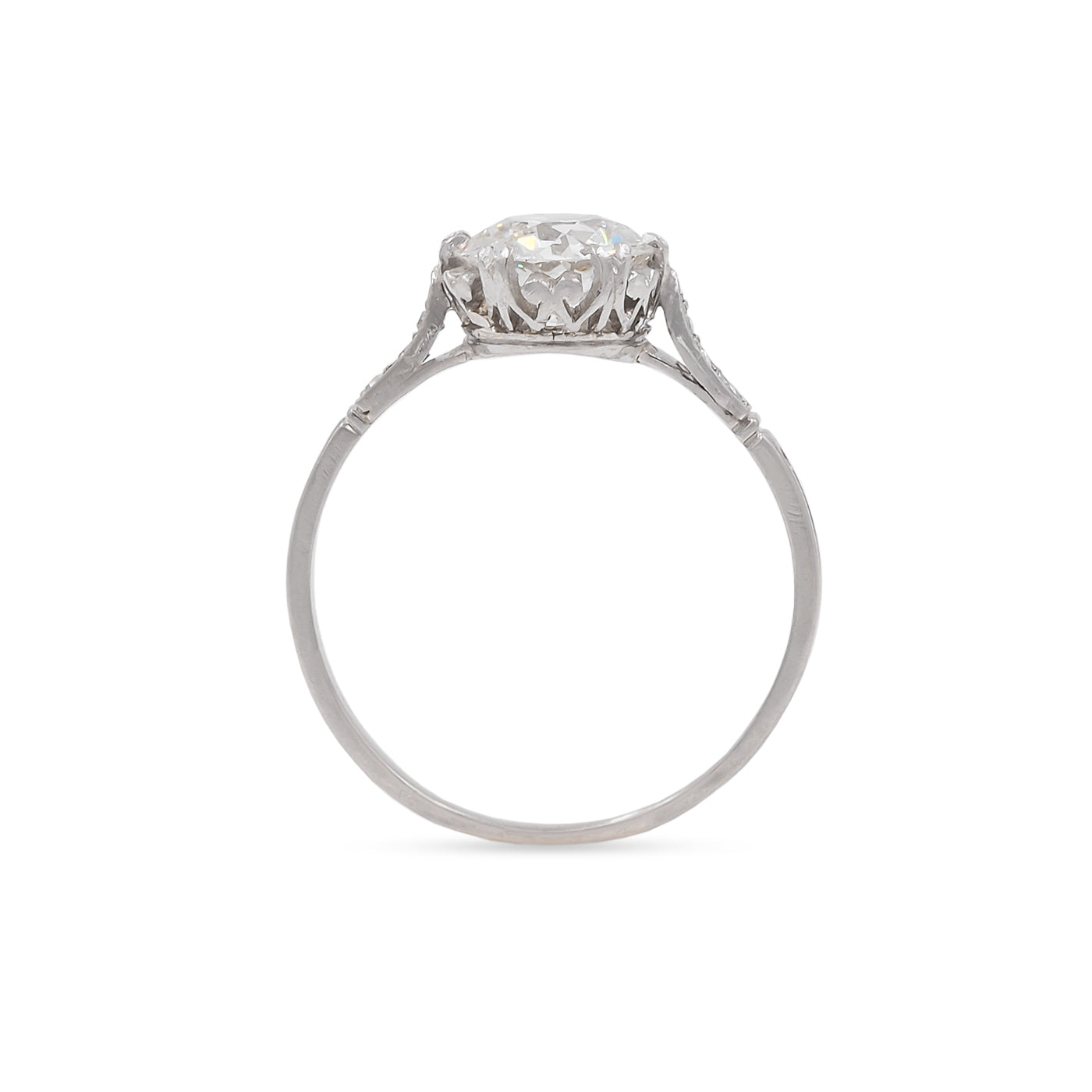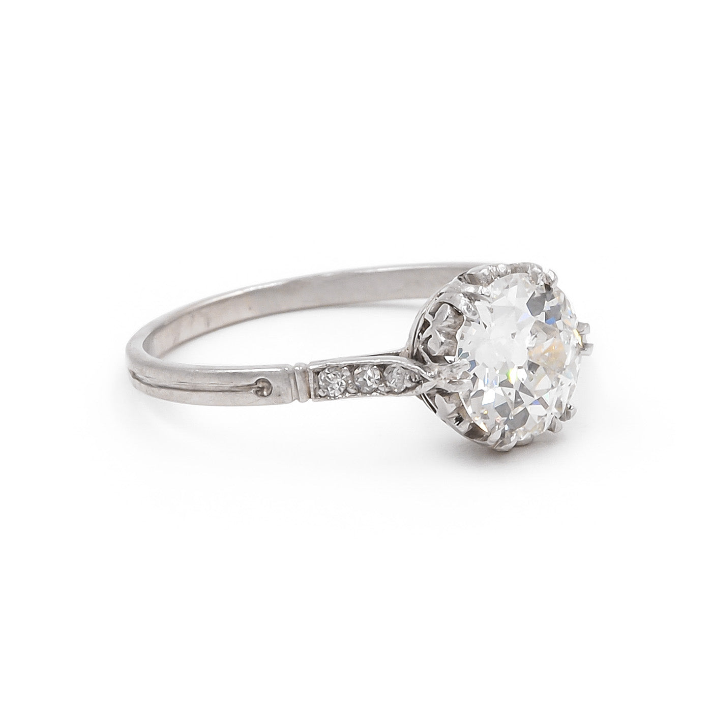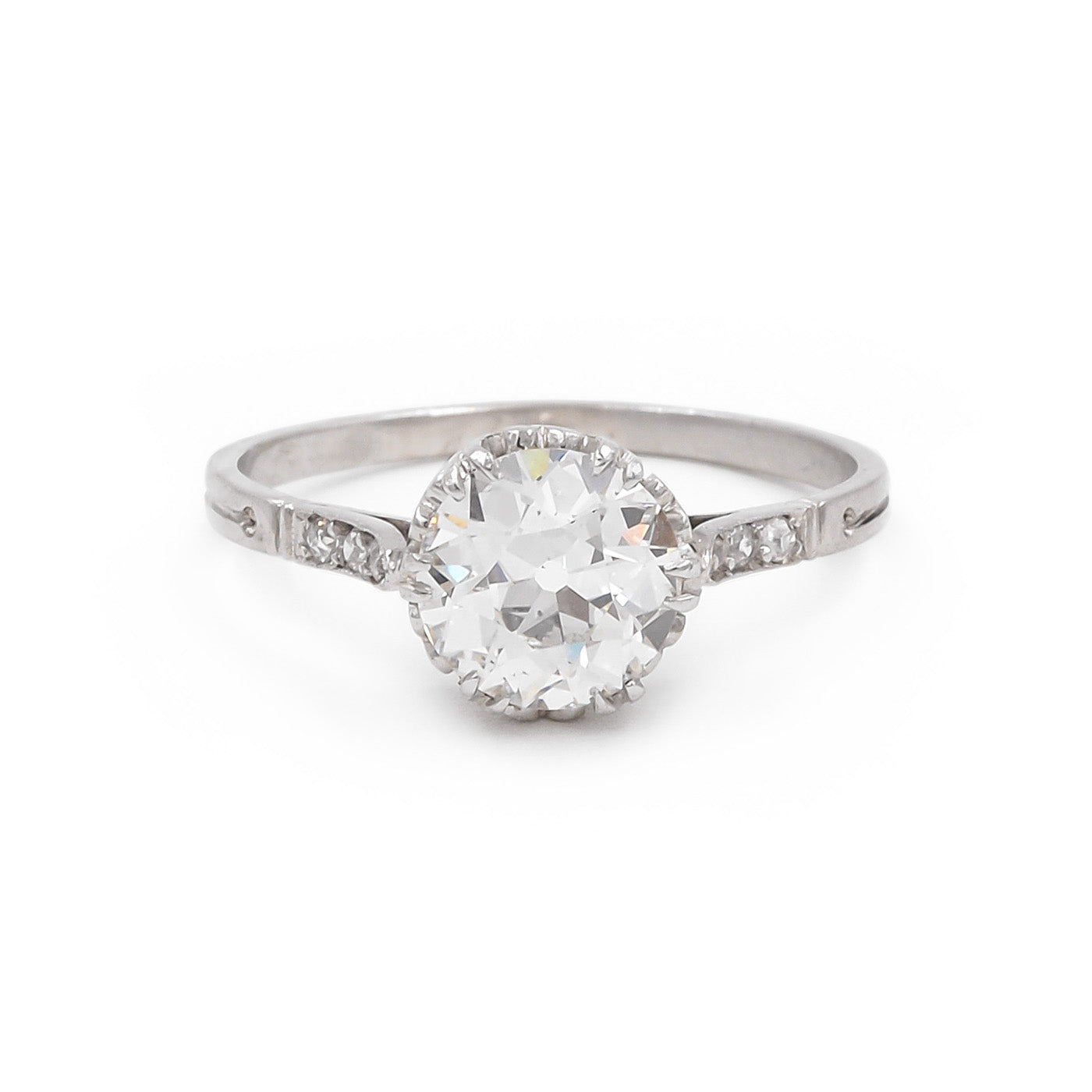 French Edwardian 1.50 Ct. Old European Cut Diamond Engagement Ring composed of platinum. Centering on a 1.50 carat Old European Cut diamond that is GIA certified to have J color/SI2 clarity. The center diamond is set within a multi double-claw prong mounting With 6 Old European Cut diamonds set into the shoulders that weigh approximately 0.08 carats in total. With fine milgrain and engraved details to the setting. Hallmarked for French origin. Circa 1920.