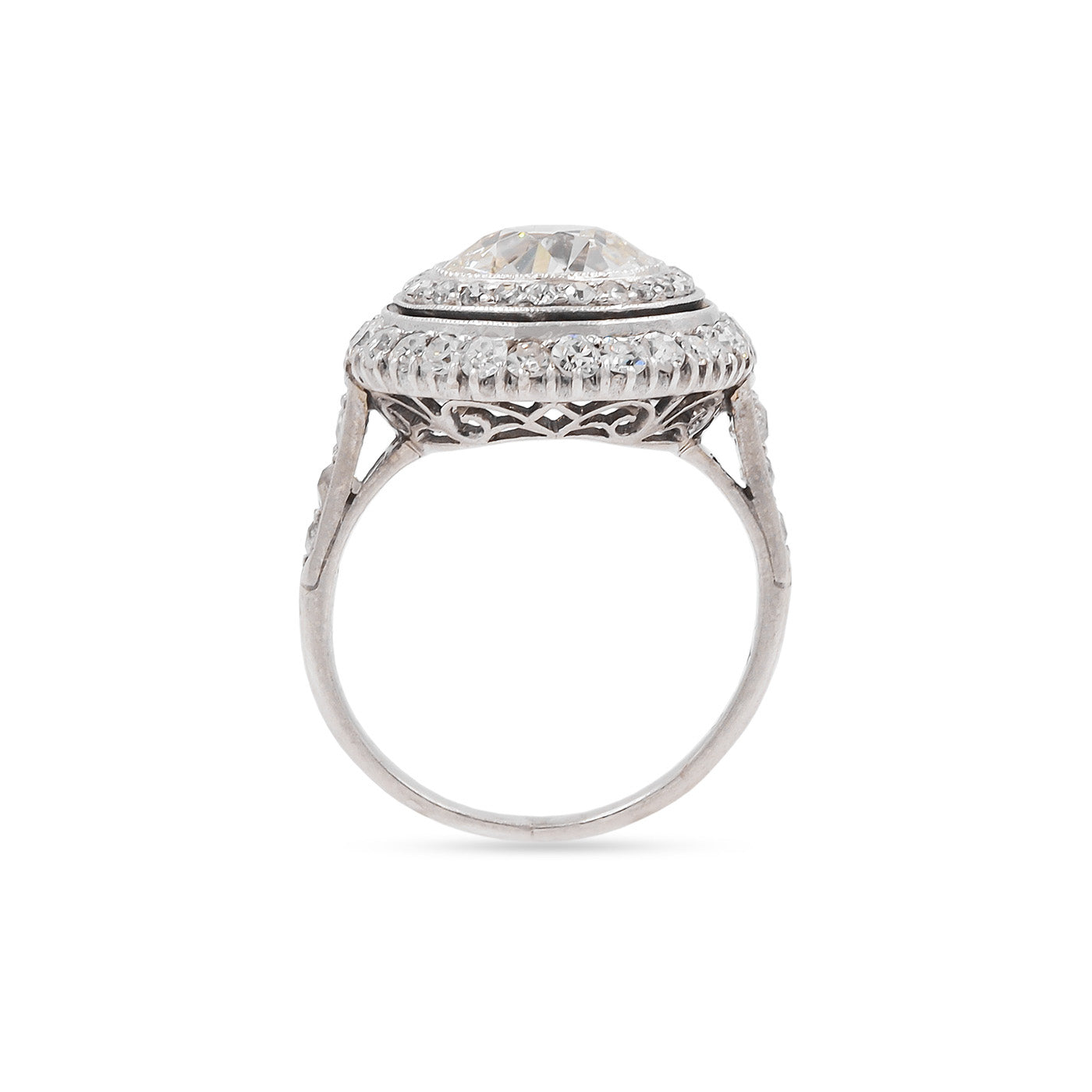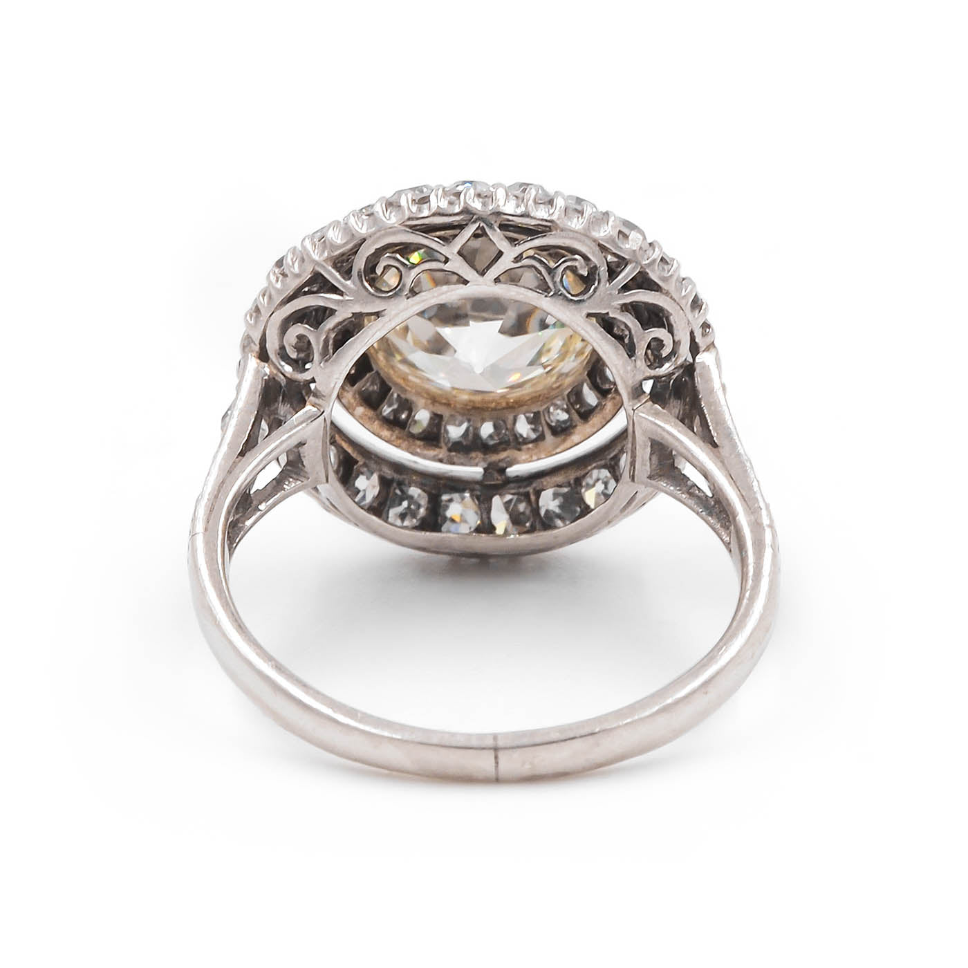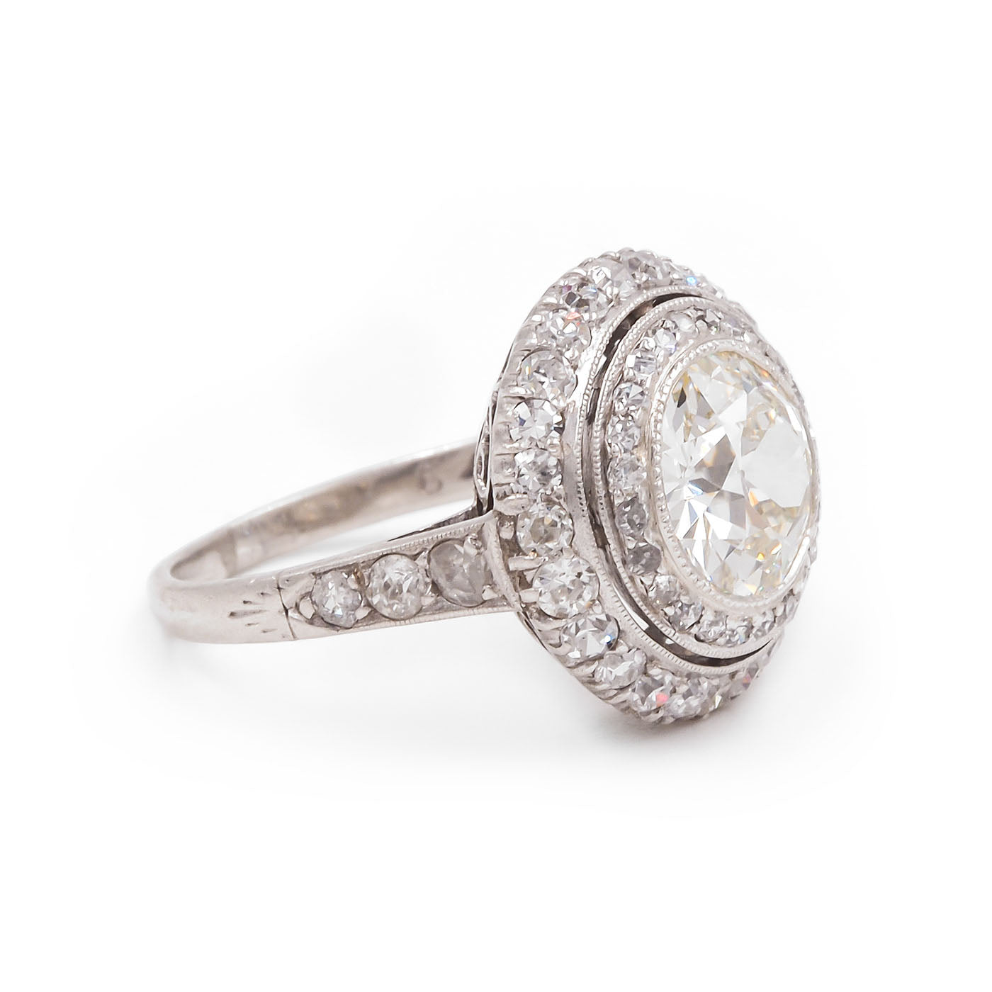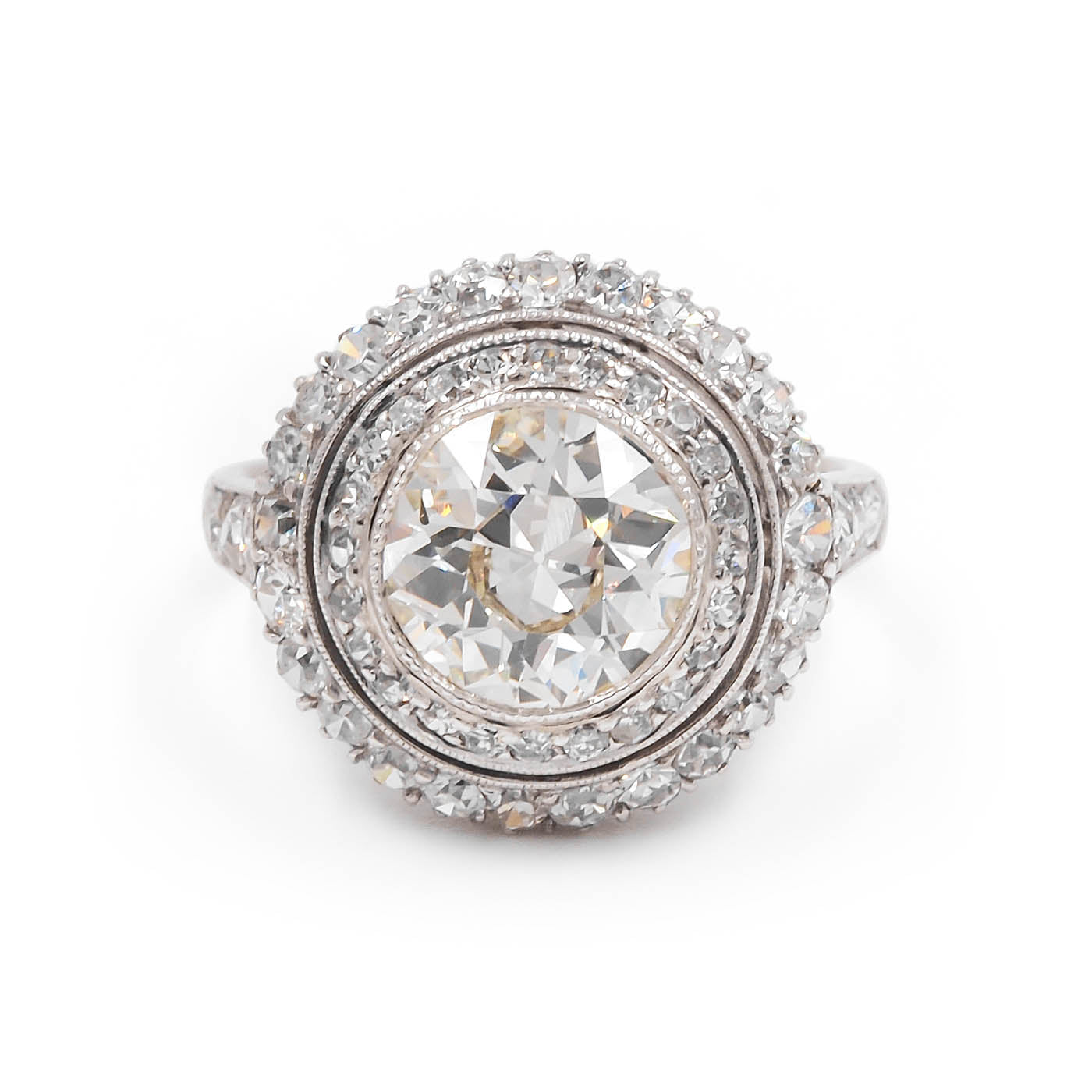 French Edwardian era 2.07 Carat Old European Cut Diamond Engagement Ring composed of platinum. Featuring a 2.07 carat Old European Cut diamond at the center that is GIA certified M color/VS2 clarity, framed within two rows of diamonds, 56 diamonds in total -- a combination of Old European Cut and Single Cut diamonds -- weighing approximately 1.00 carat in total. With fine milgrain throughout, an ornately detailed basket, and details down the shoulders. The front of the ring measures approximately 16 mm in diameter. Hallmarked for French origin. Circa 1915-1920.