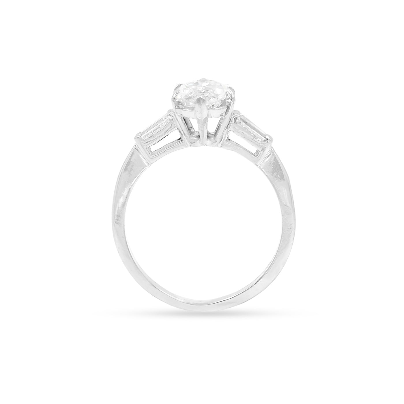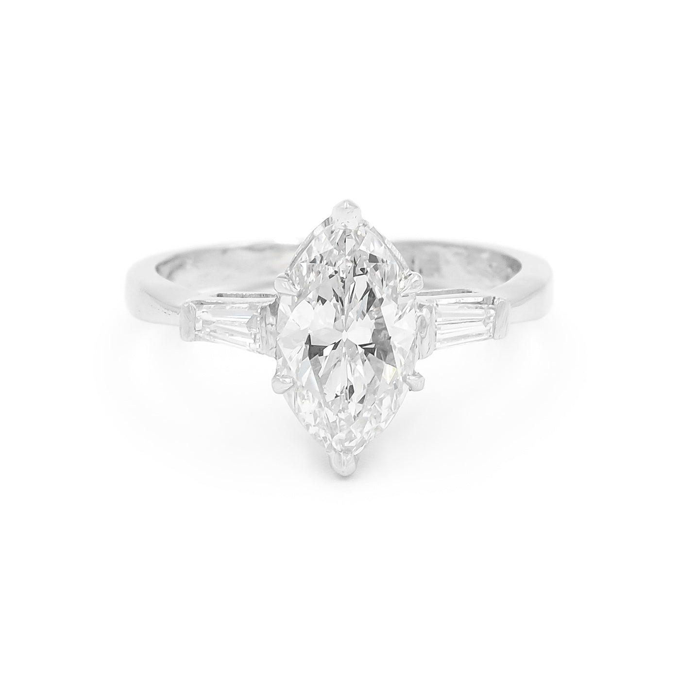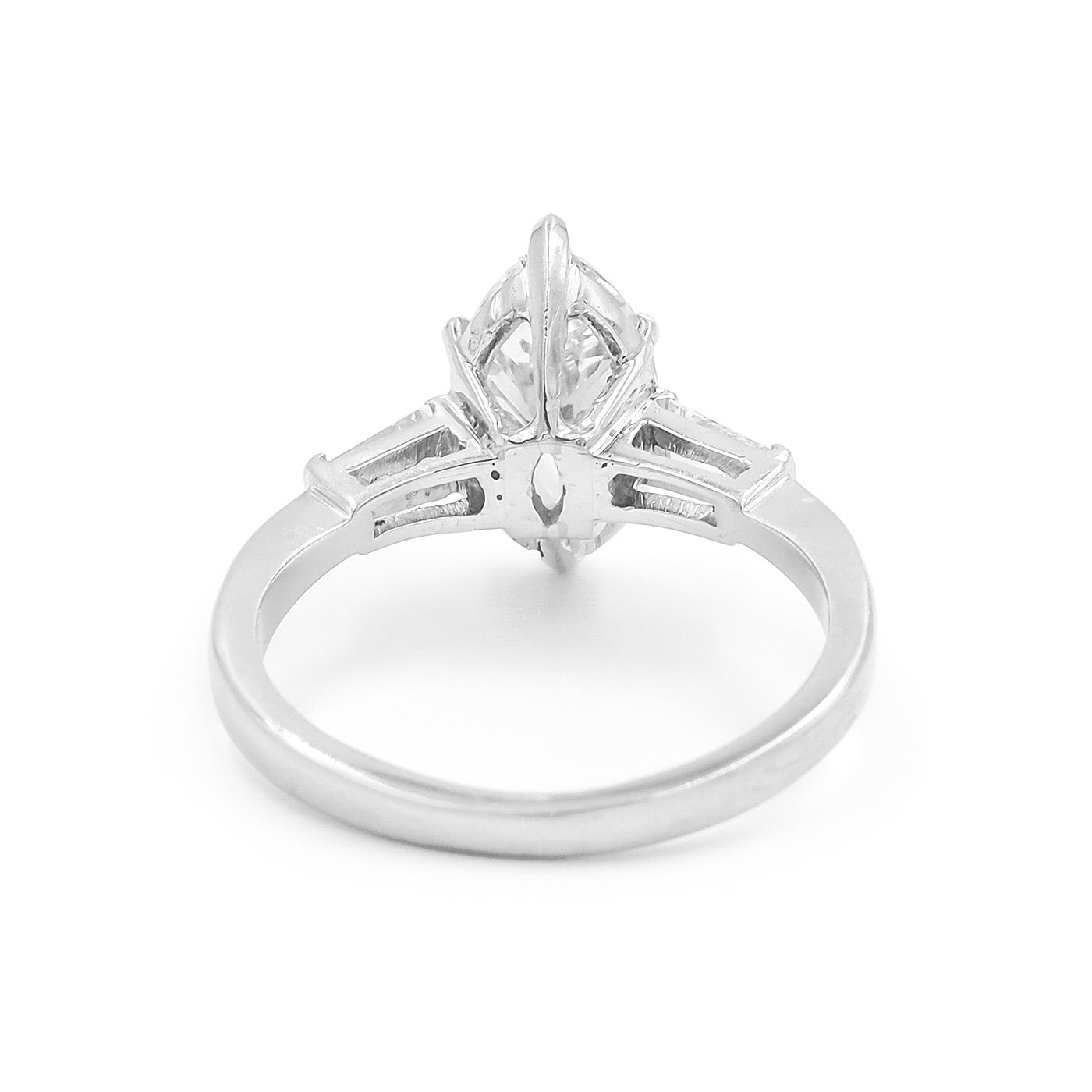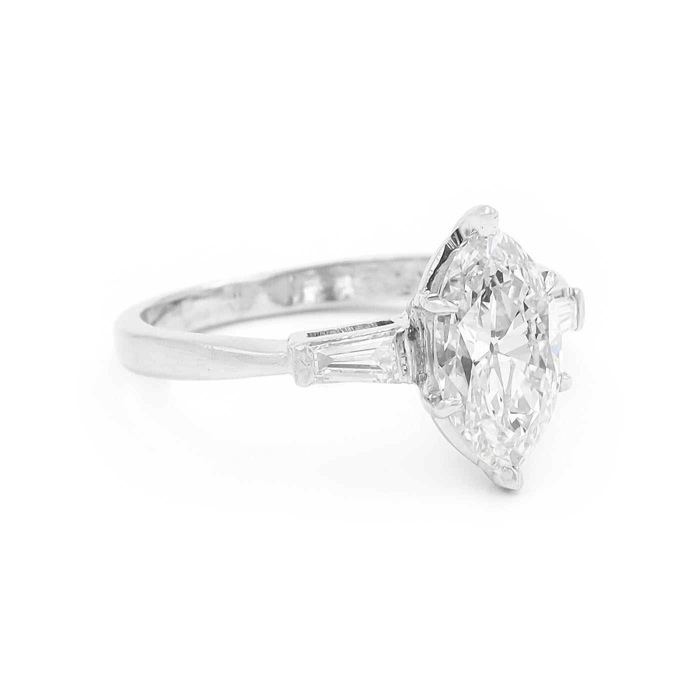 Mid-Century 1.49 Carat Marquise Cut Diamond Engagement Ring composed of platinum. With a 1.49 carat Marquise Cut diamond, GIA certified J color/VS2 clarity. With an additional 2 Tapered Baguette Cut diamonds set into the shoulders weighing approximately 0.18 carats in total. Circa 1950's.