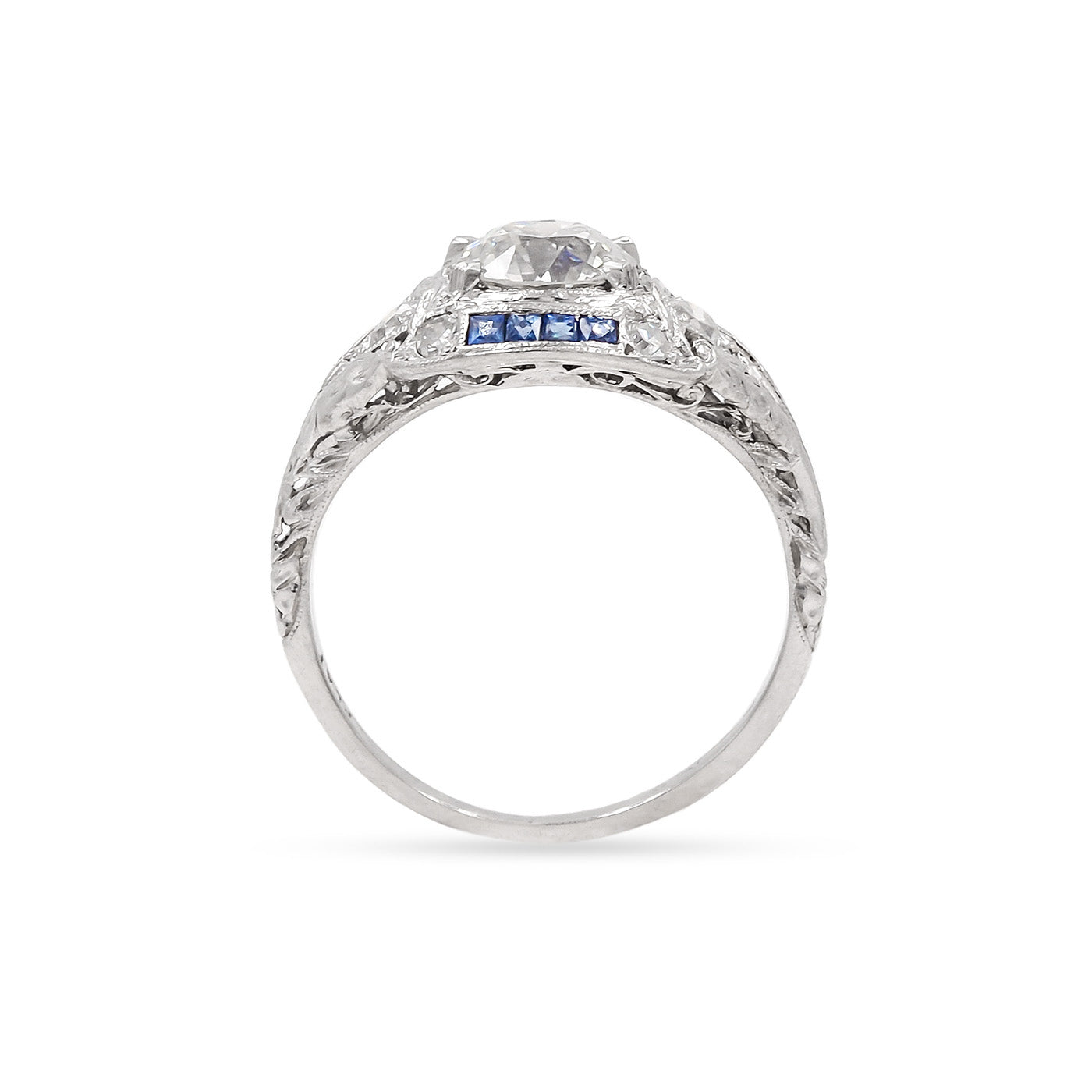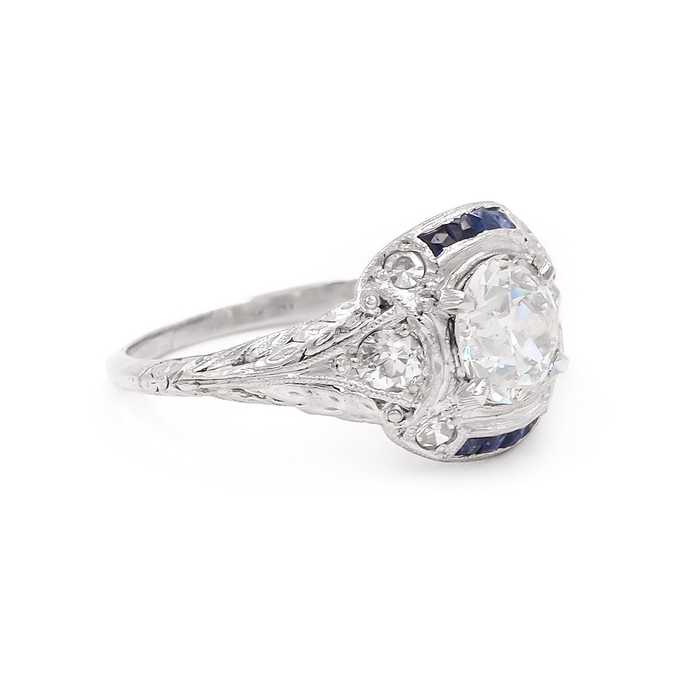 Art Deco era 1.04 Ct. Old European Cut Diamond & Sapphire Engagement Ring composed of platinum. With a 1.04 carat Old European Cut diamond at the center that is GIA certified J color/SI1 clarity. With an additional 6 diamonds in the setting, a combination of Old European Cut and Old Single Cut diamonds, weighing approximately 0.20 carats in total, as well as 8 French Cut natural blue sapphires. With ornate details throughout the setting and basket, wheat-engravings on the shoulders, & fine milgrain throughout. Circa 1920.