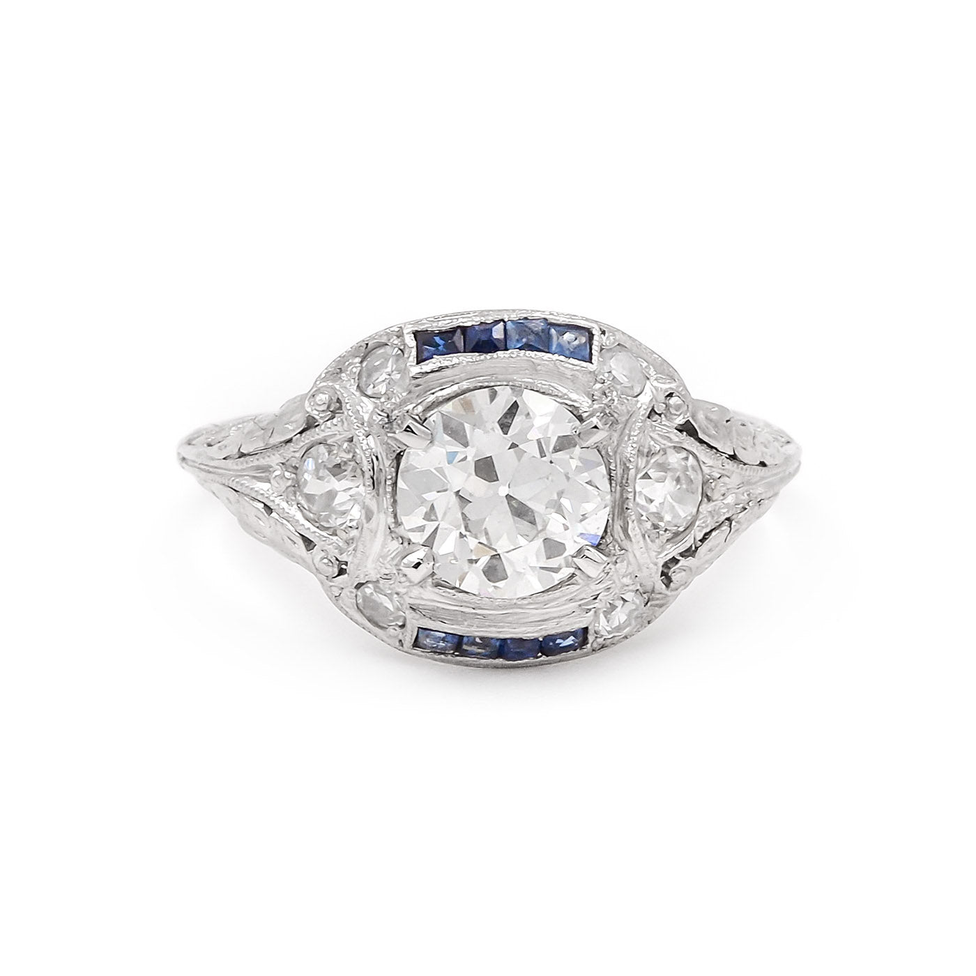 Stones: 1.04 Ct. Old European Cut Diamond; French Cut Blue Sapphires