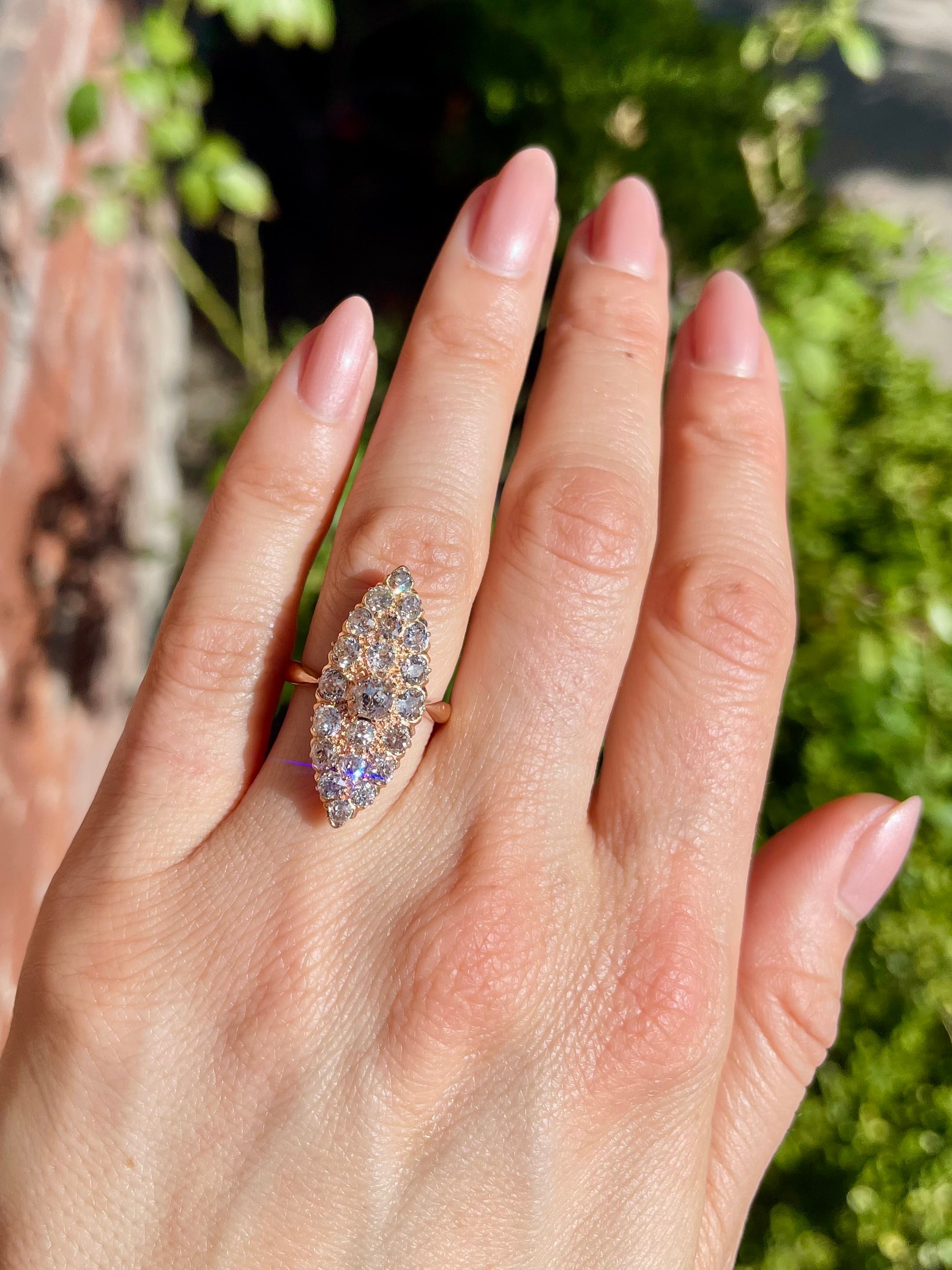 Victorian era 1.80 Ctw. Old Cut Diamond Navette Ring composed of 18k rose gold. With 20 Old Cut diamonds, a combination of Old Mine Cut & Old European Cut diamonds weighing approximately 1.80 carats in total, with colors and clarities estimated to range M-N-O (some diamonds have a faint brown tint)/SI1-I1. Circa 1890-1900.