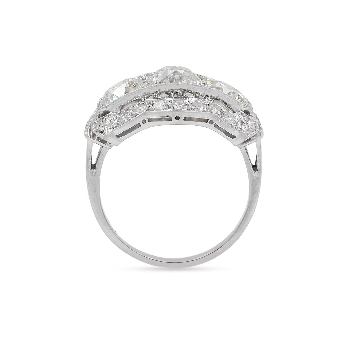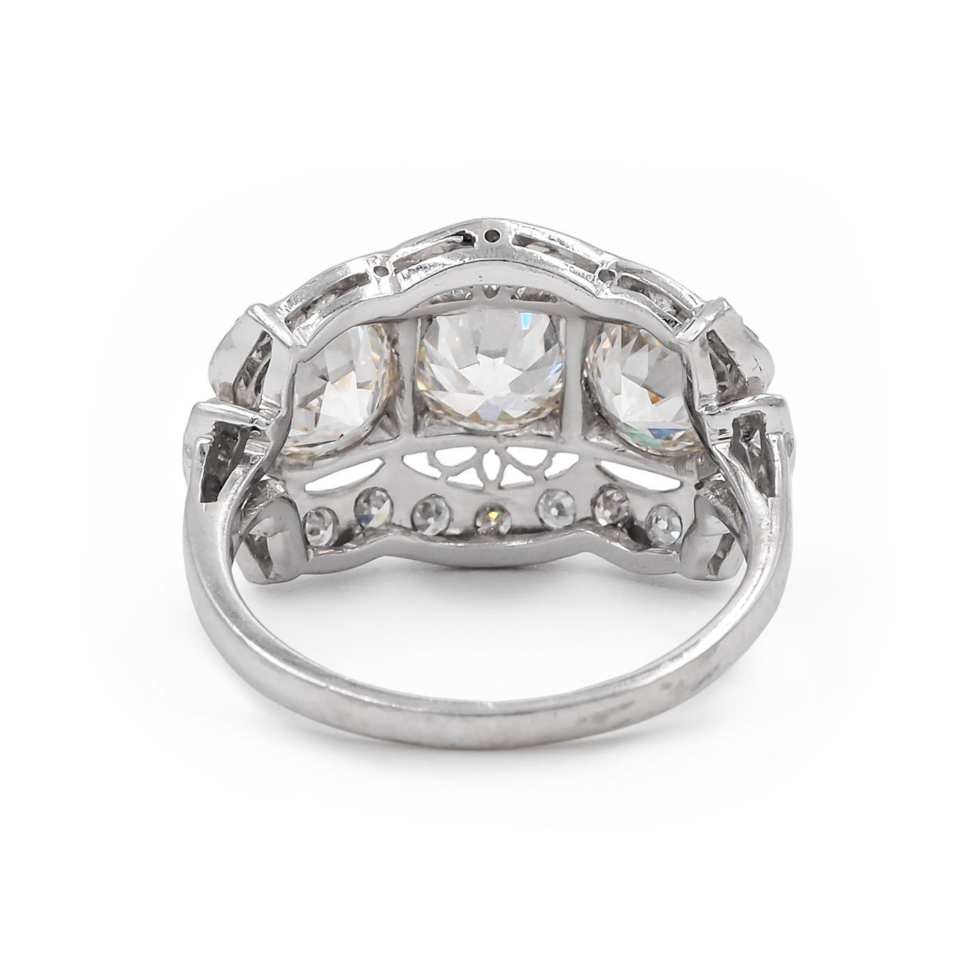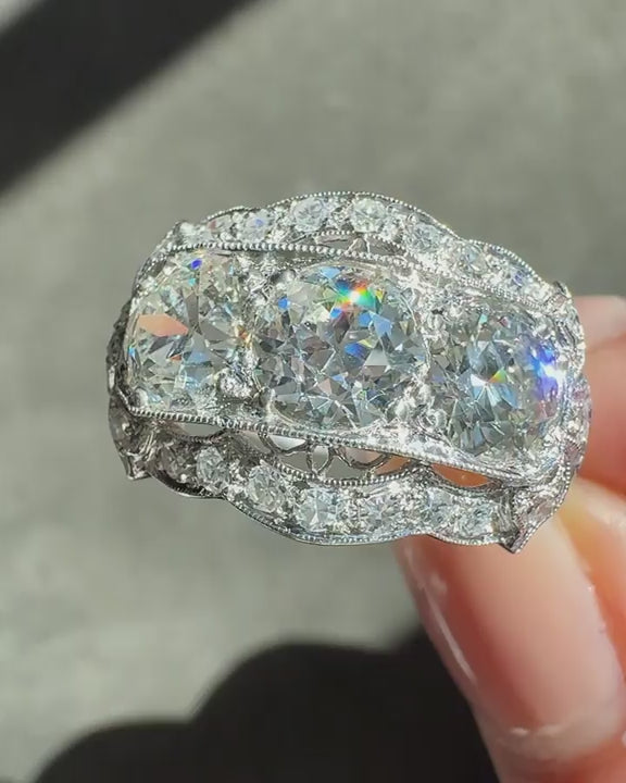 Stones: 0.98 Ct. Old European Cut Diamond center (GIA Certified J color/SI1 clarity); 0.97 Ct. Old European Cut Diamond (GIA Certified K color/SI2 clarity); 0.79 Ct. Old European Cut Diamond (GIA Certified K color/SI1 clarity)