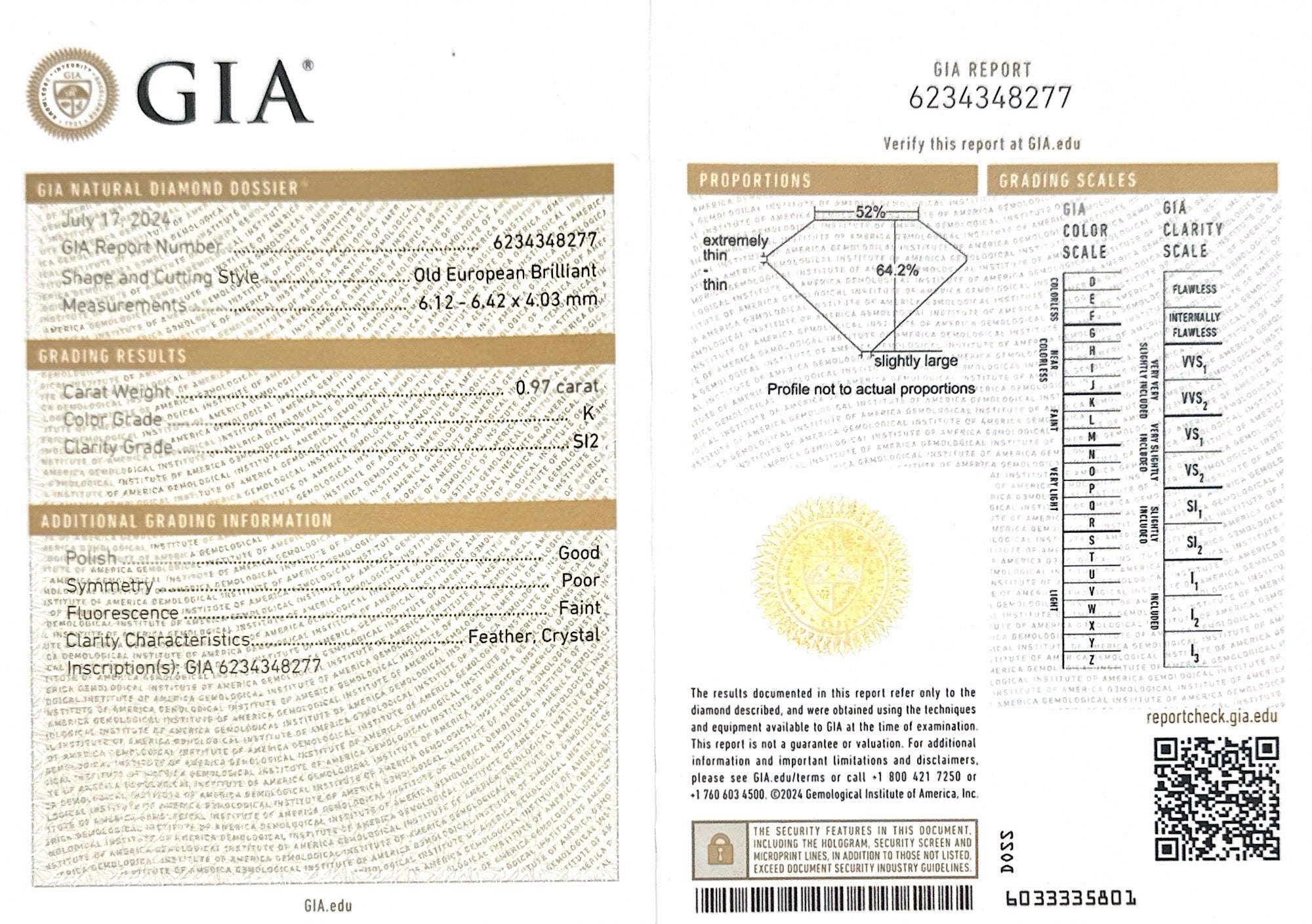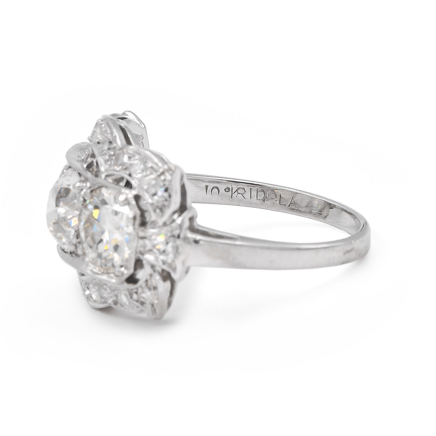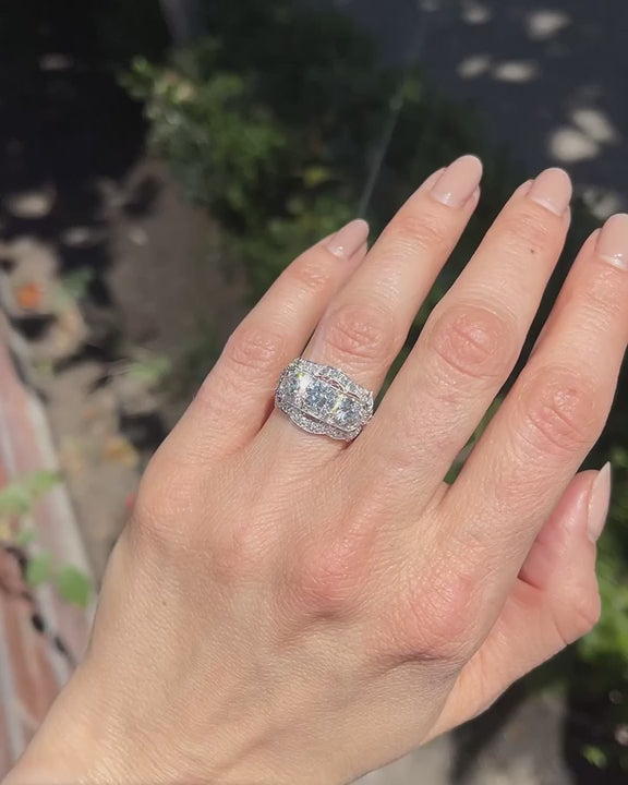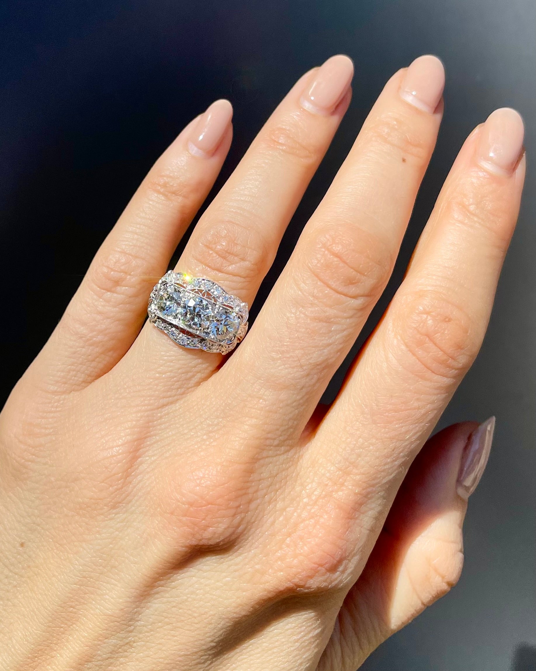 Stones: 0.98 Ct. Old European Cut Diamond center (GIA Certified J color/SI1 clarity); 0.97 Ct. Old European Cut Diamond (GIA Certified K color/SI2 clarity); 0.79 Ct. Old European Cut Diamond (GIA Certified K color/SI1 clarity)
