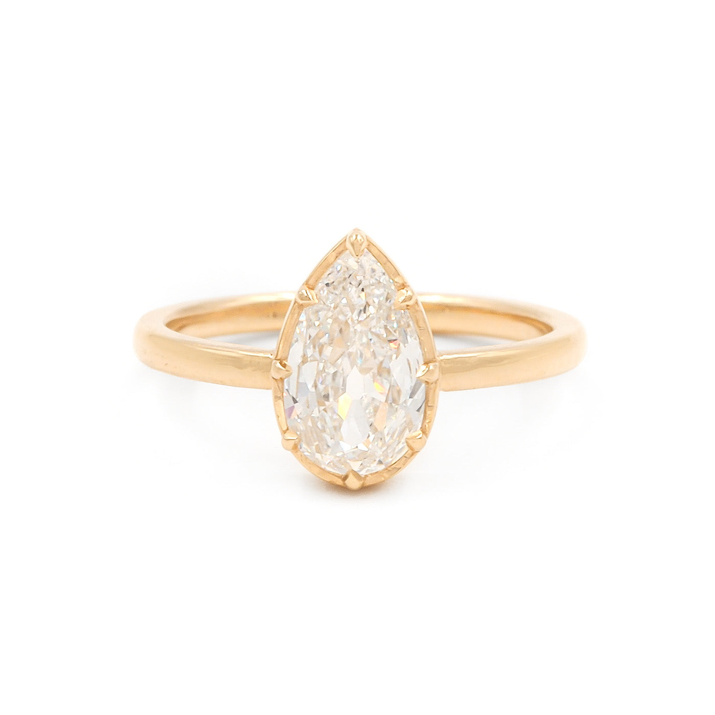 Vintage-Inspired 1.14 Carat Pear Shaped Diamond Solitaire Engagement Ring from Bespoke by Platt, composed of 18k yellow gold. The vintage Pear-Shaped diamond is GIA certified F color/VS2 clarity. The pear-shaped, multi-claw prong collet-style setting measures approximately 11.1 mm tall by 7.1 mm wide.