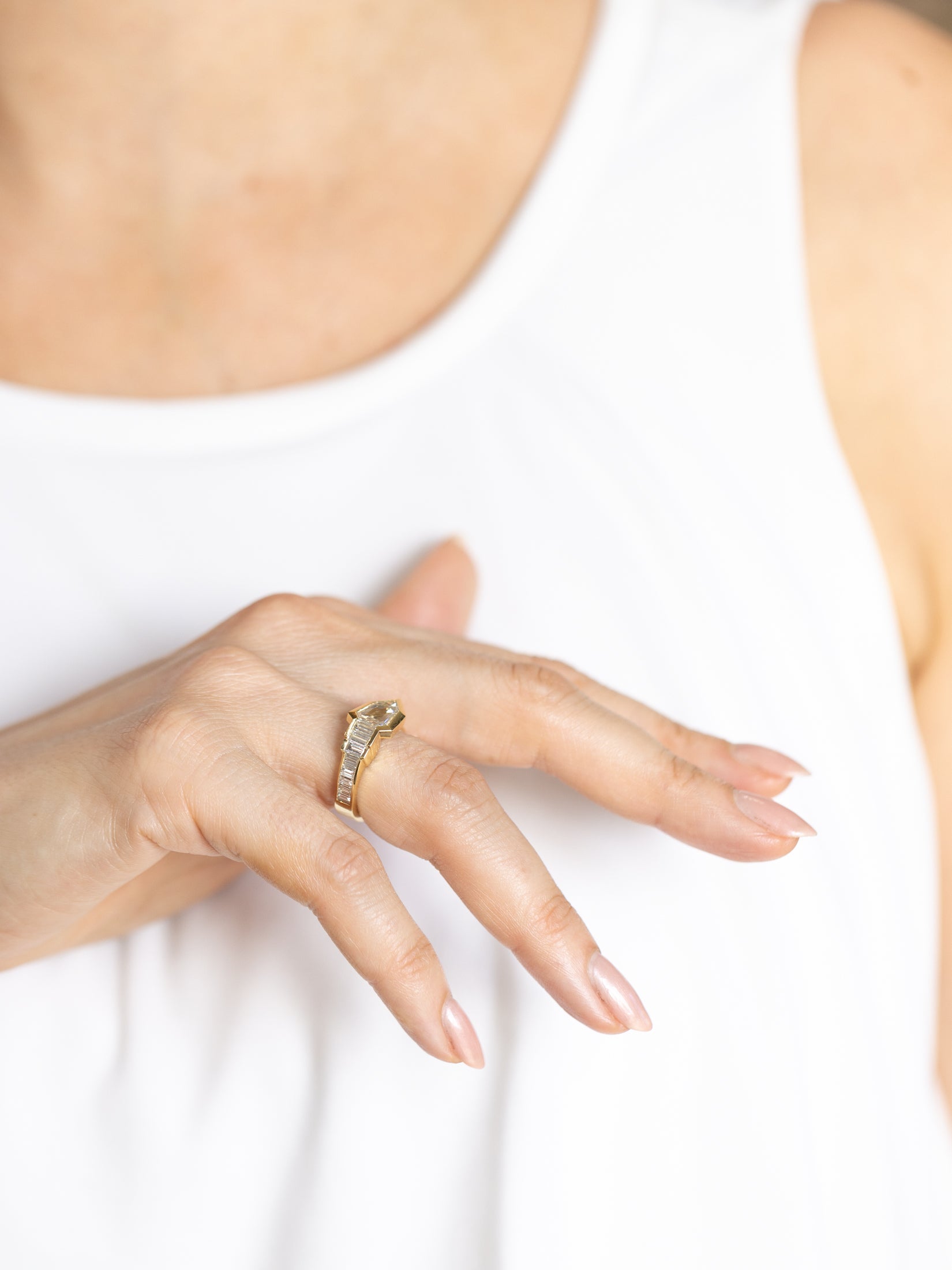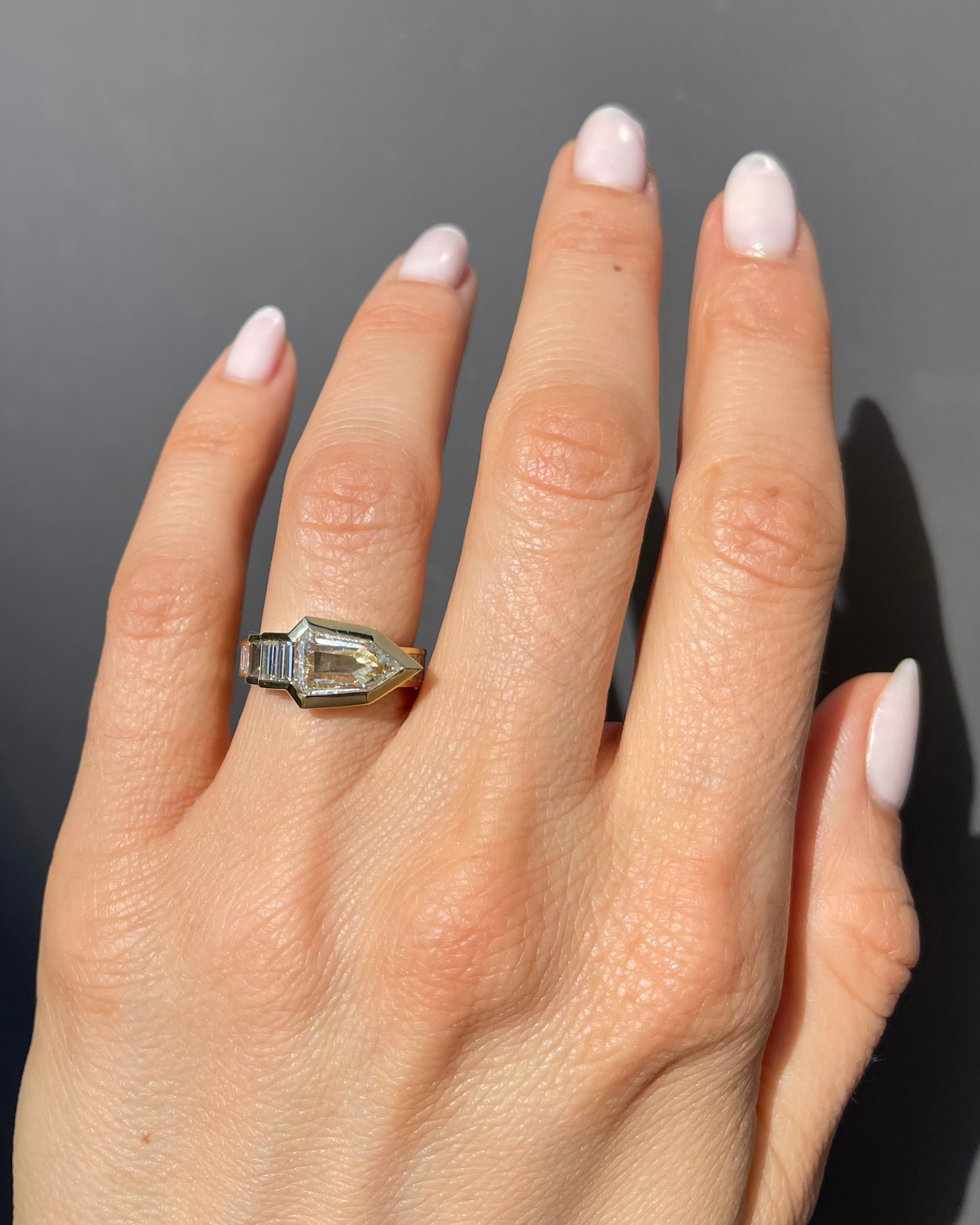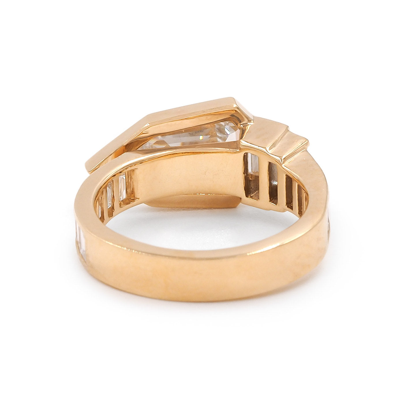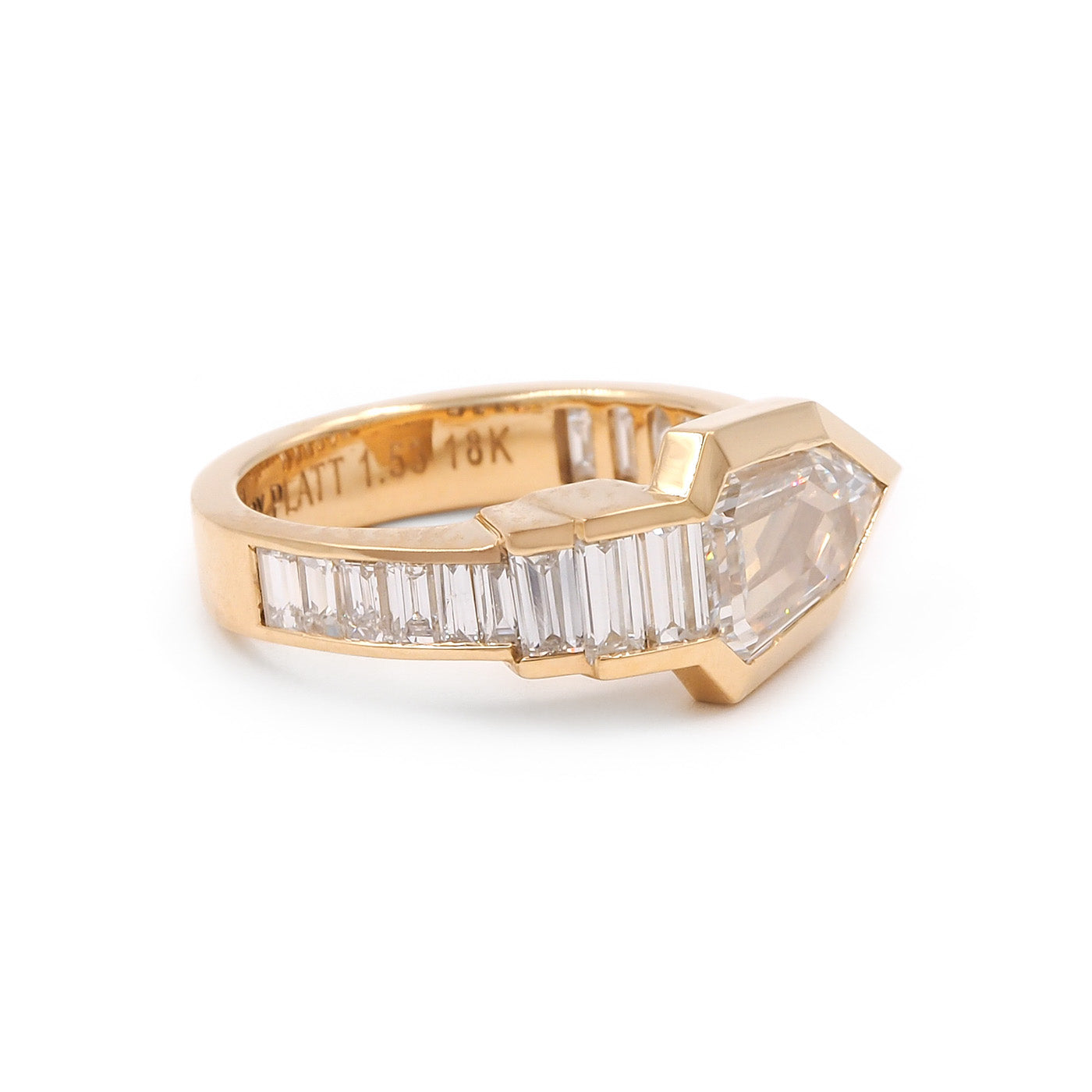 American 1.53 Ct. Step Cut Diamond 'Robyn Ring’ from Bespoke by Platt, composed of 18k yellow gold. This ring has an arrow-like design, which is also reminiscent of a snake. It features a 1.53 carat Pentagonal Step Cut diamond at its center, GIA certified to have G color/VS1 clarity. The ring also features 16 Baguette Cut diamonds weighing approximately 1.30 carats in total, channel-set within high-polished gold. The ring measures approximately 9.52 mm wide at the front and 4.07 mm wide at the back; weighs 6.9 grams. Contemporary.