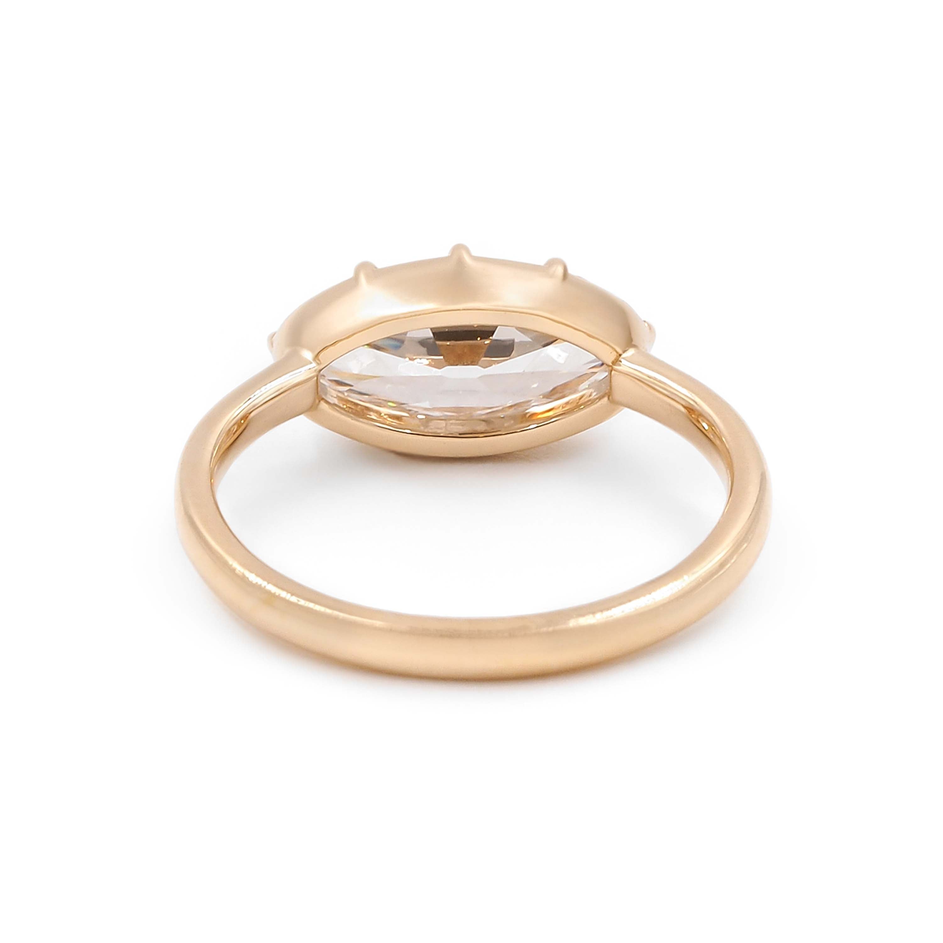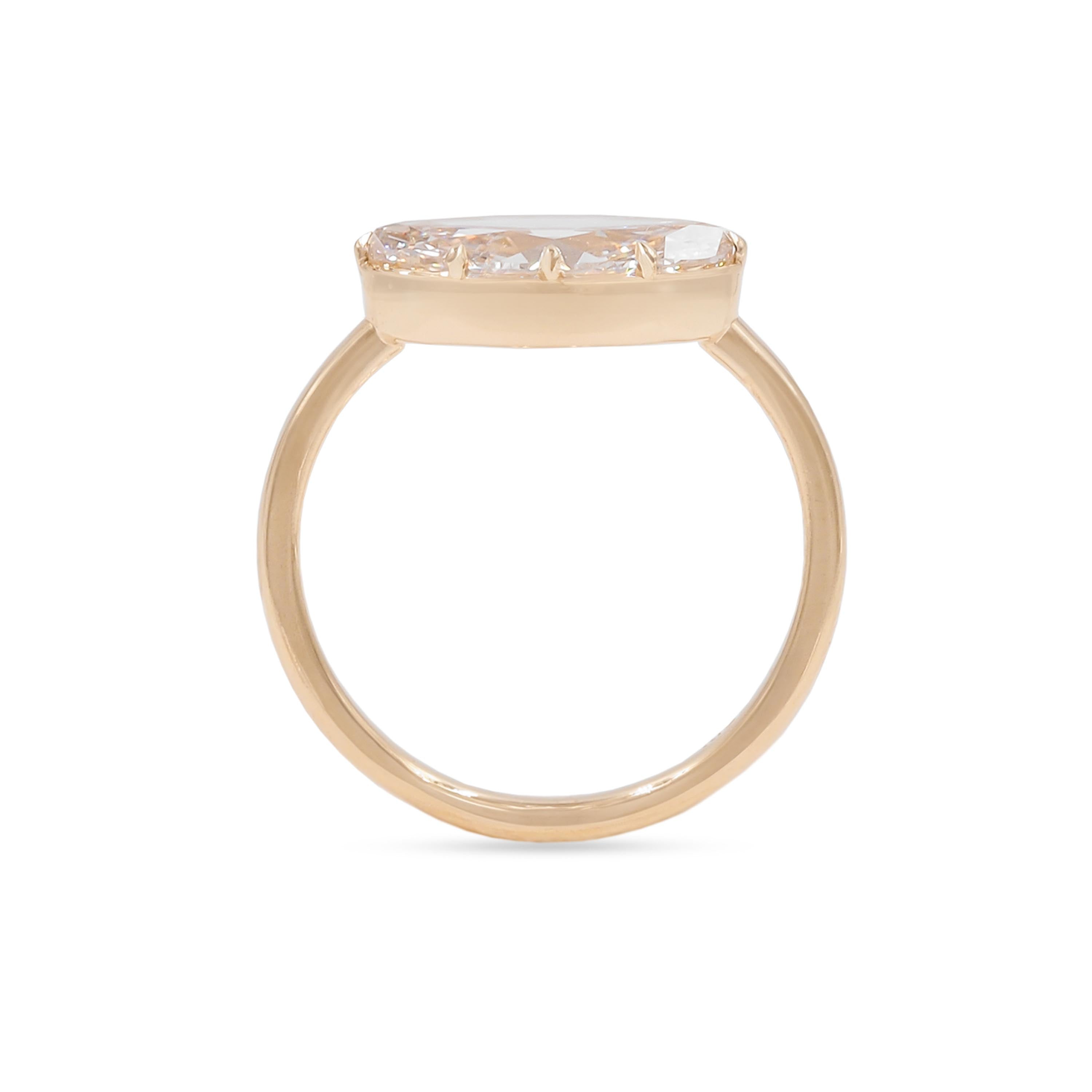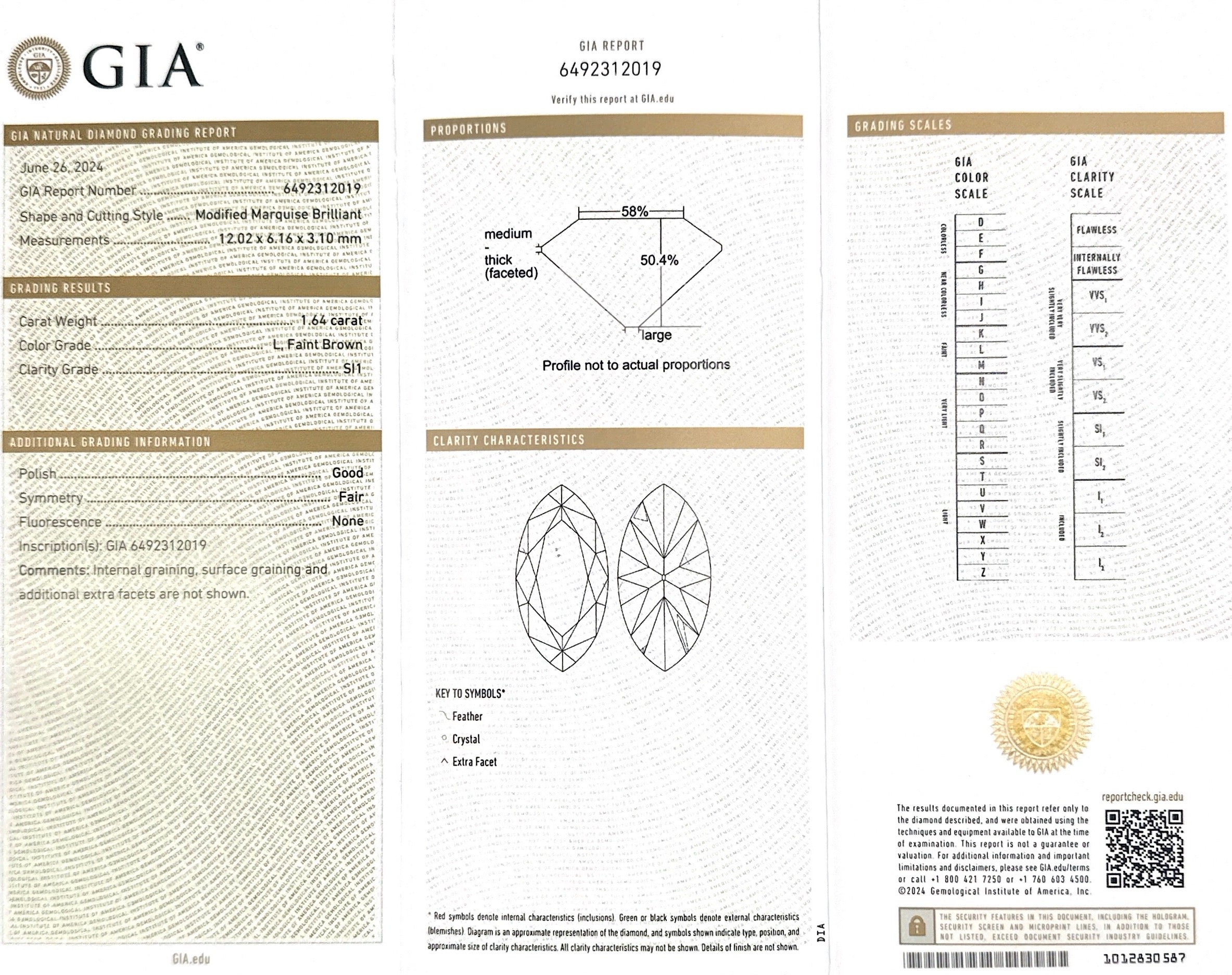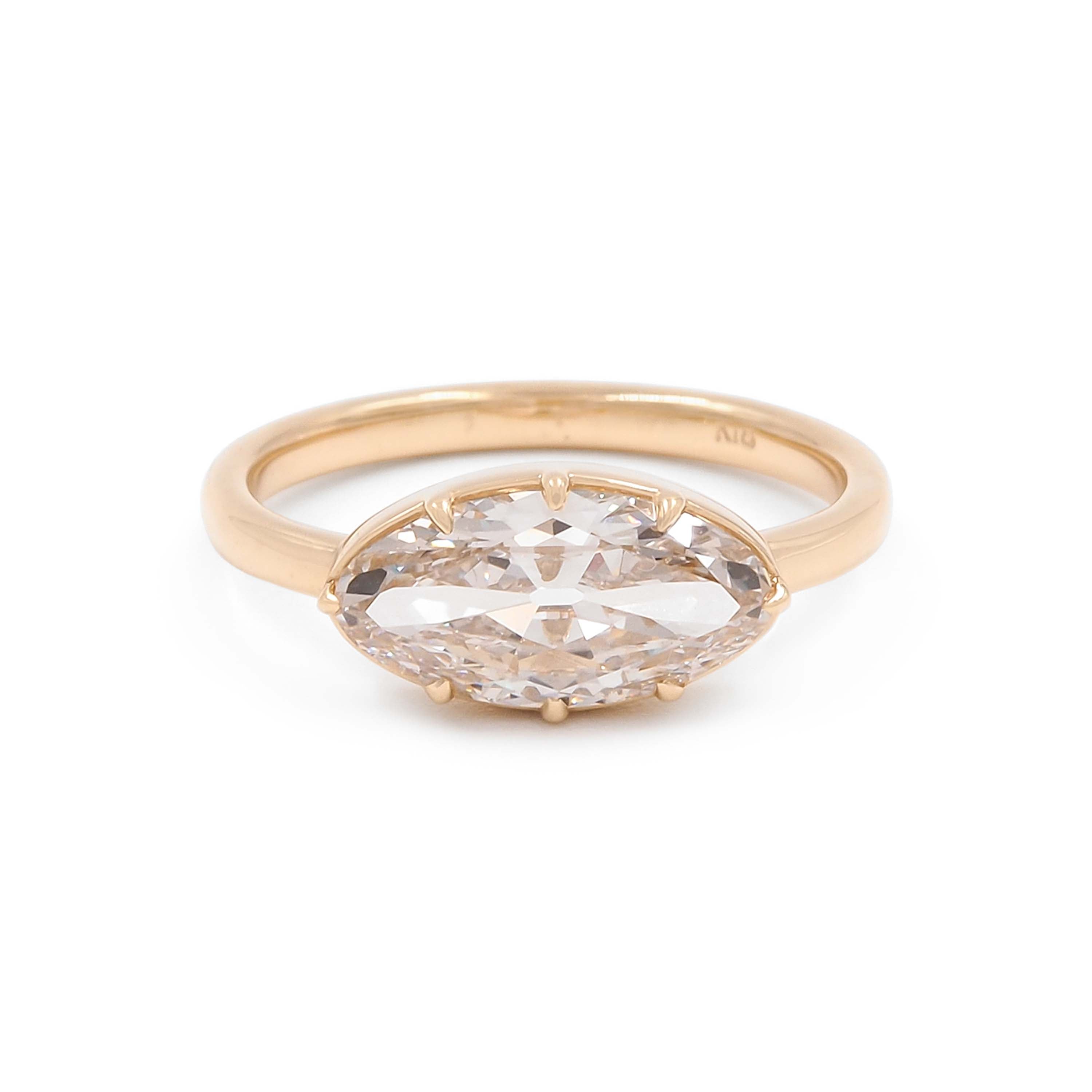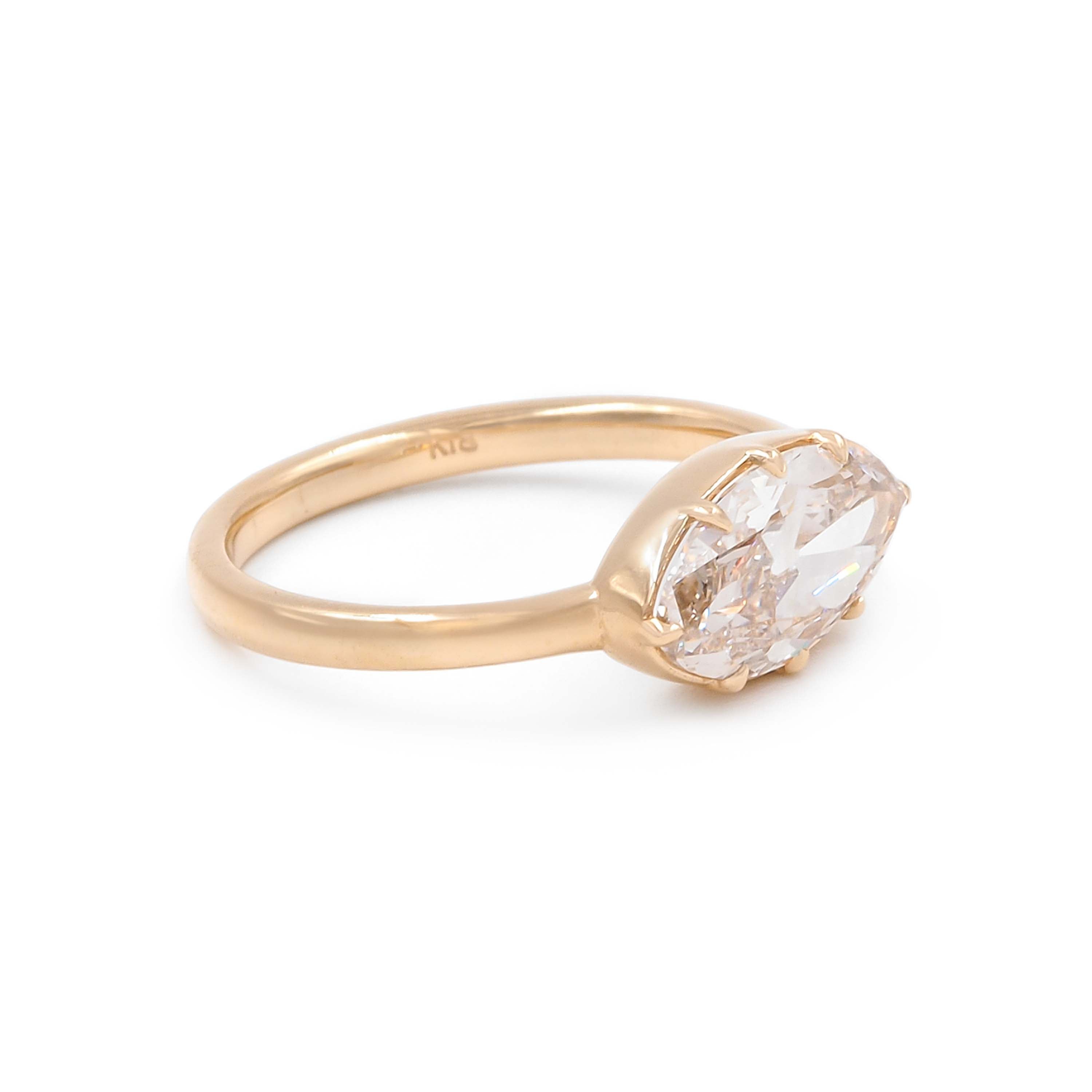 American 1.64 Ct. Antique Marquise Cut Diamond Engagement Ring from Bespoke by Platt, composed of 18k yellow gold. The 1.64 Ct. antique Marquise Cut diamond is GIA certified L color (Faint Brown)/SI1 clarity. The diamond is set horizontally within a multi claw-prong mounting. The front of the ring measures approximately 12.9 mm wide by 7.1 mm tall. Contemporary.