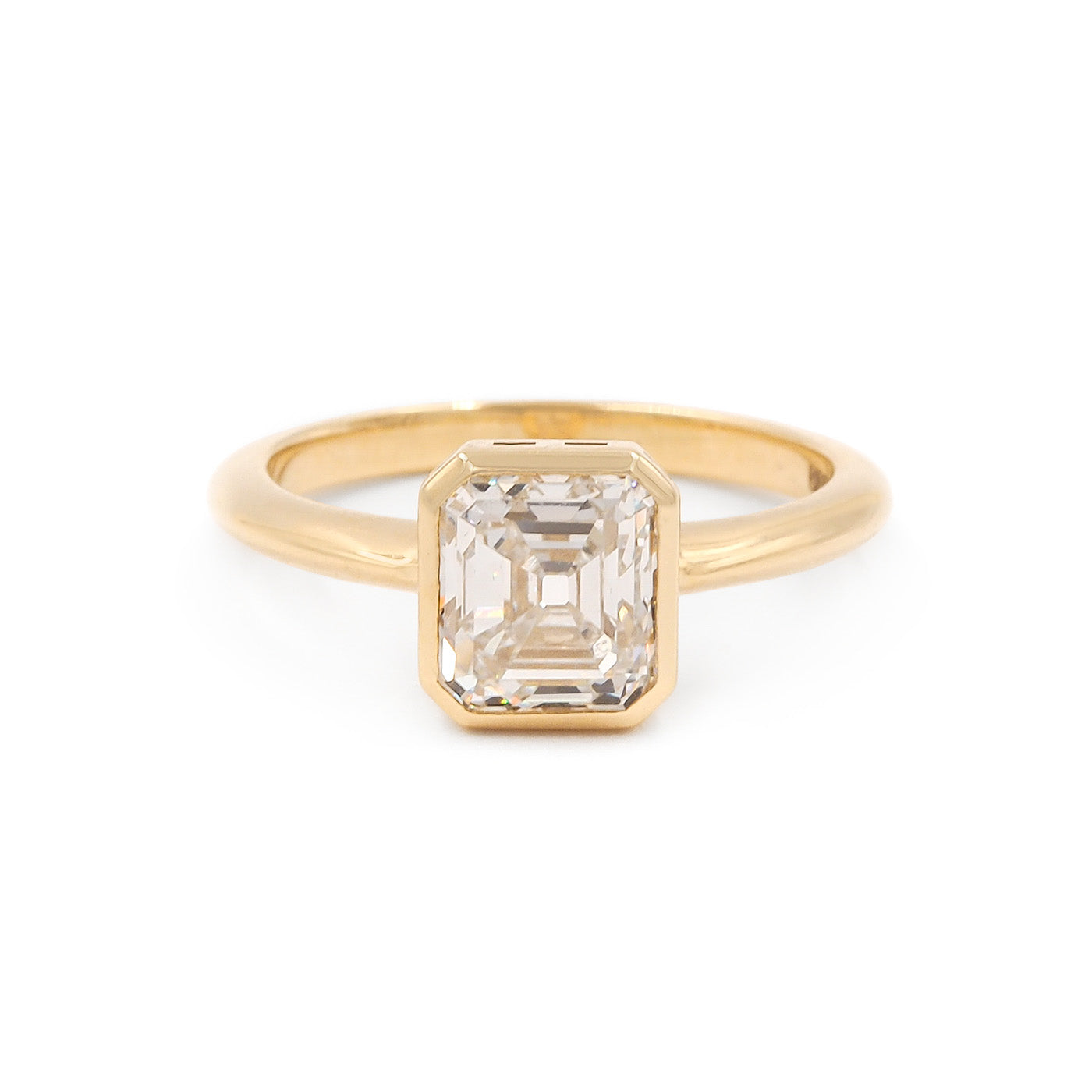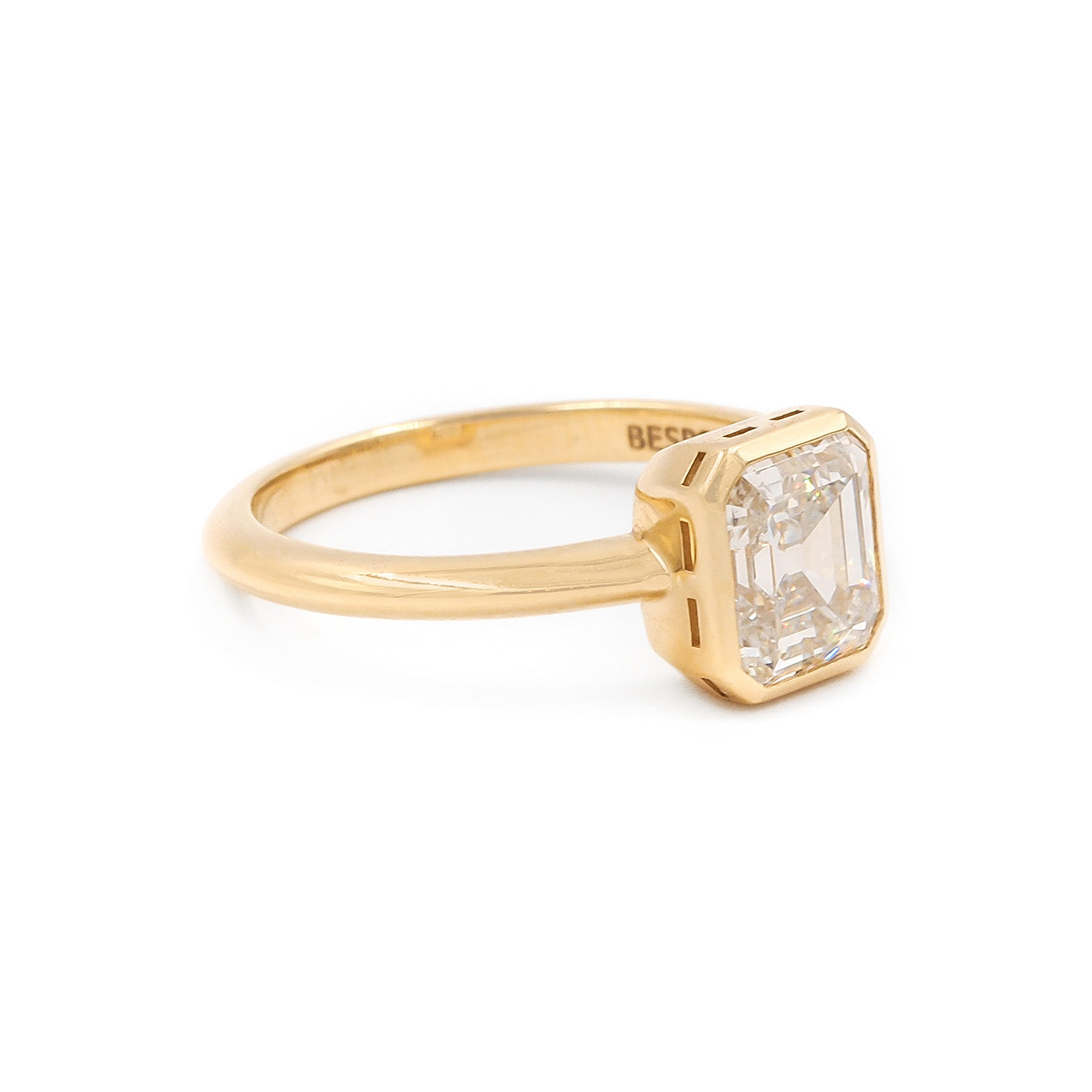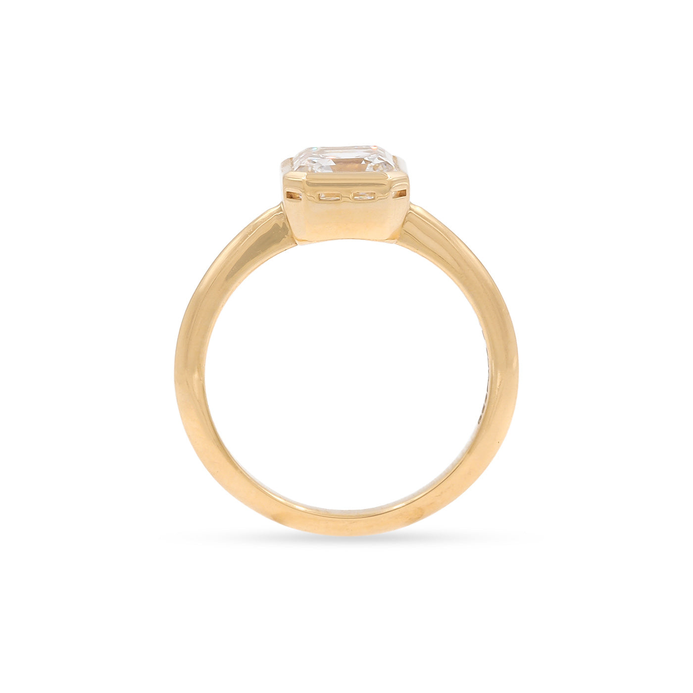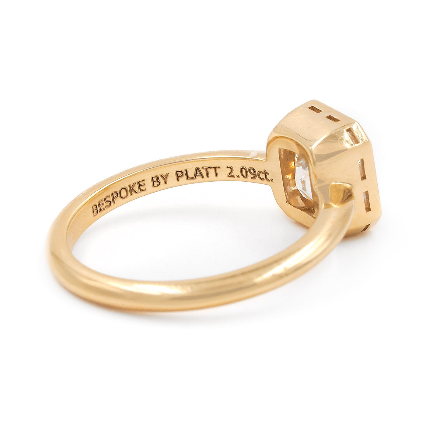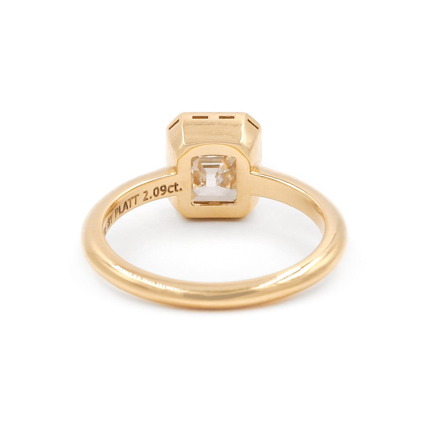 2.09 Carat Emerald Cut Diamond Solitaire Engagement Ring from Bespoke by Platt, composed of 18k yellow gold. The 2.09 carat Emerald Cut diamond is GIA certified H color/VS2 clarity. The diamond is set vertically within a bezel mounting. Note: All Bespoke By Platt rings are based on original antique or vintage rings once in our collection.