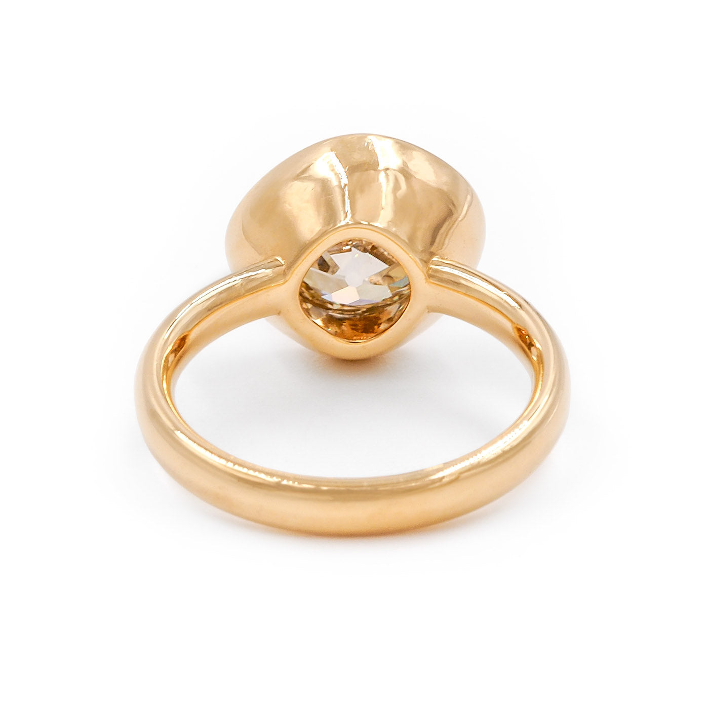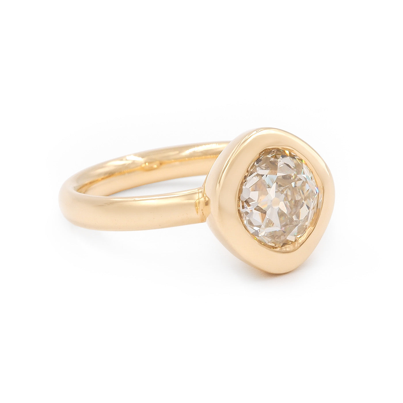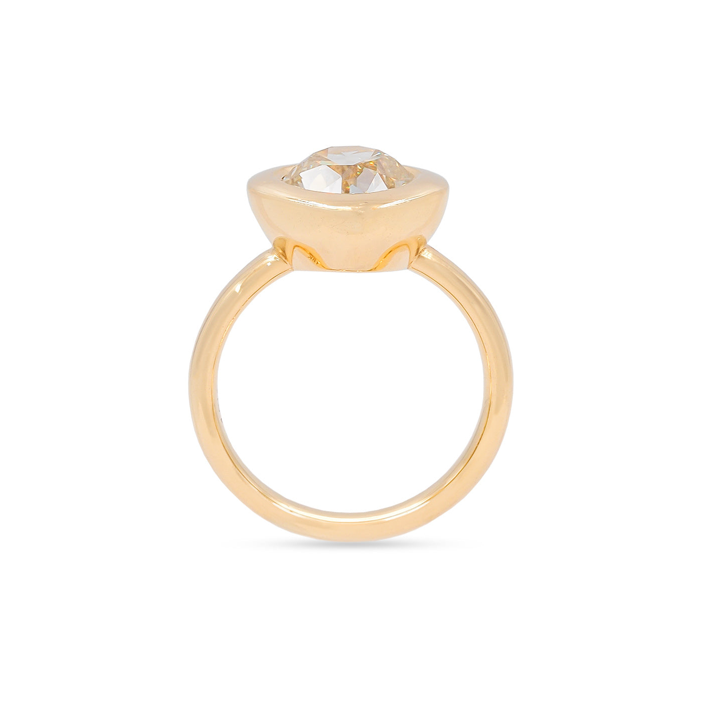 American 2.80 Ct. Old Mine Cut Diamond Solitaire Ring from Bespoke by Platt, composed of 18k yellow gold. The 2.80 carat antique Old Mine Cut diamond is estimated to have U-V color and SI2 clarity. The diamond is bezel-set within an oblong, minimalistic-style mounting. The front of the ring measures approximately 12.9 mm wide by 7.1 mm tall. Contemporary.