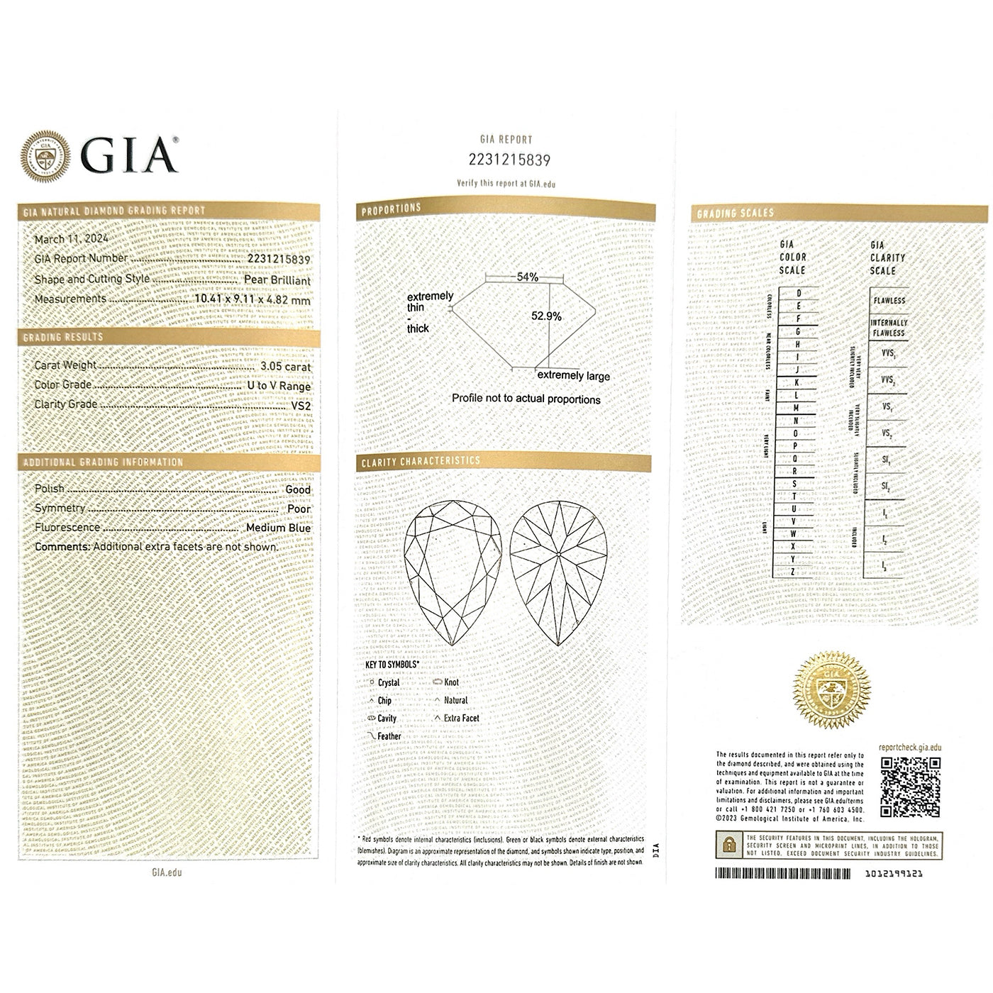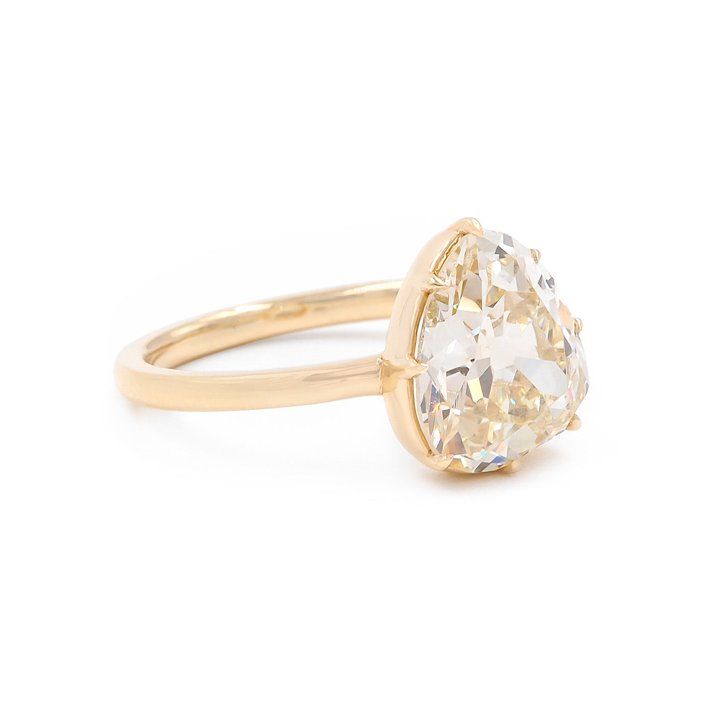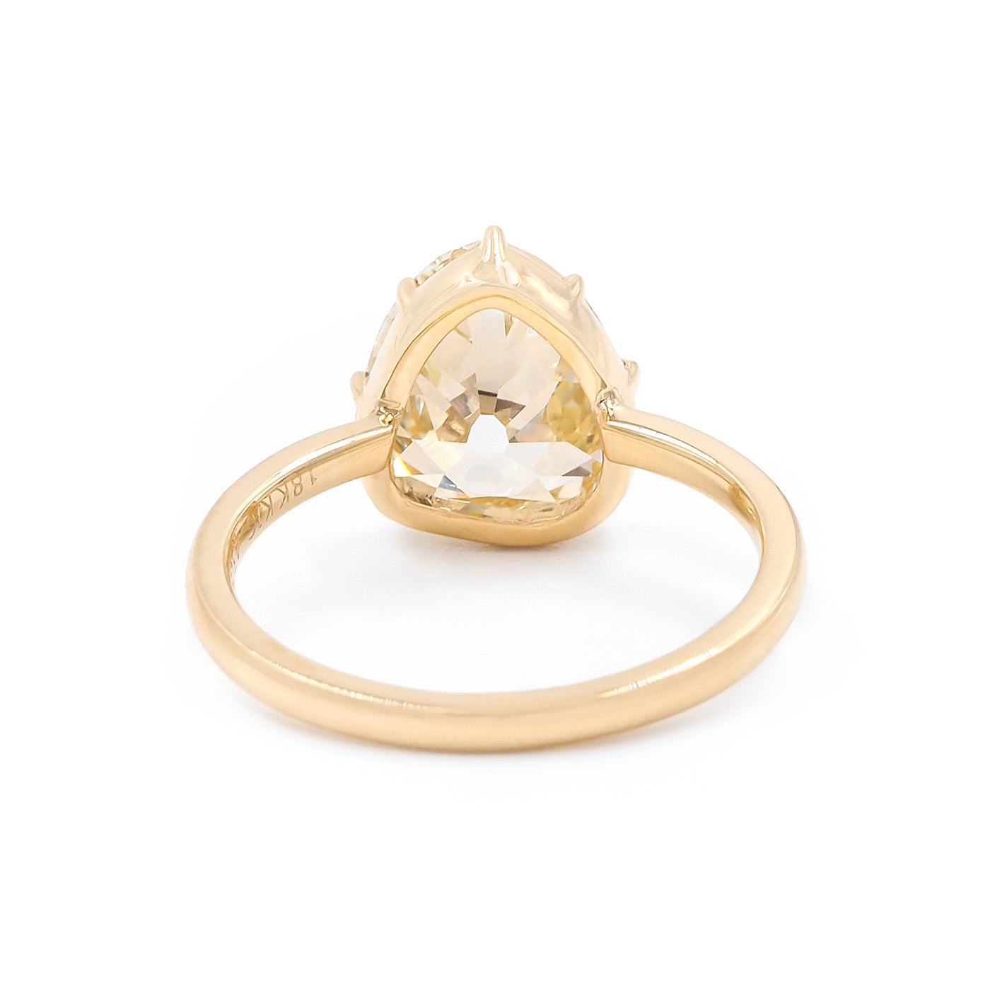 Vintage-Inspired 3.05 Ct. Old Pear Cut Diamond Solitaire Engagement Ring from Bespoke by Platt, composed of 18k yellow gold. The Old Pear Cut diamond is GIA certified U-V color/VS2 clarity. The pear-shaped, multi-claw prong collet-style setting measures approximately 11.2 mm tall by 9.2 mm wide.