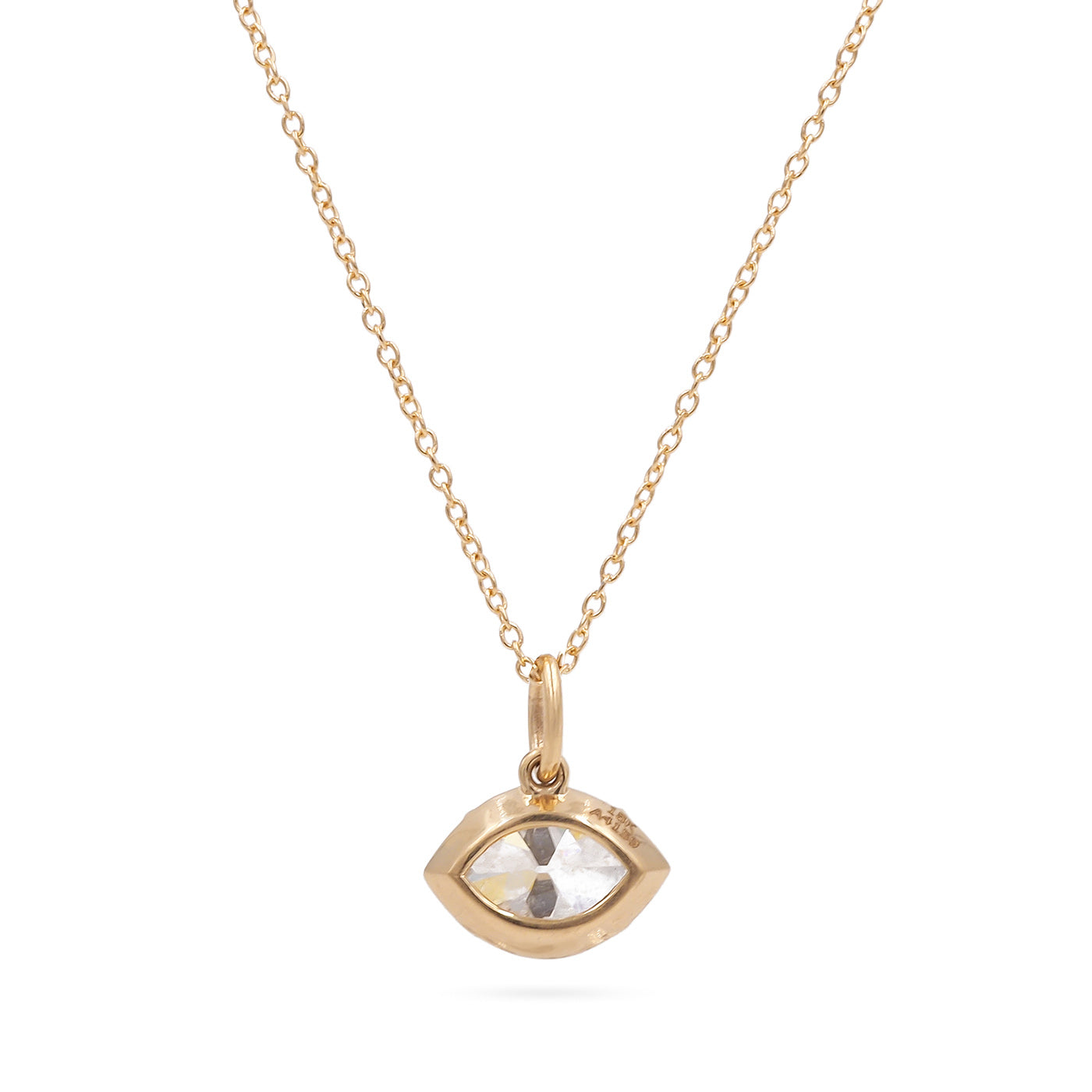 1.04 Ct. Marquise Cut Diamond Pendant Necklace from Bespoke by Platt, composed of yellow gold. Featuring a 1.04 carat Marquise Cut diamond, GIA certified to have J color/SI2 clarity. The diamond is set in a minimal 18k yellow gold collet-style mounting, with 4 claw prongs. The pendant measures approximately 9.3 mm tall by 10.8 mm wide. The Italian 18k yellow gold cable link chain is adjustable at 16", 17", & 18" lengths. American origin. Contemporary.