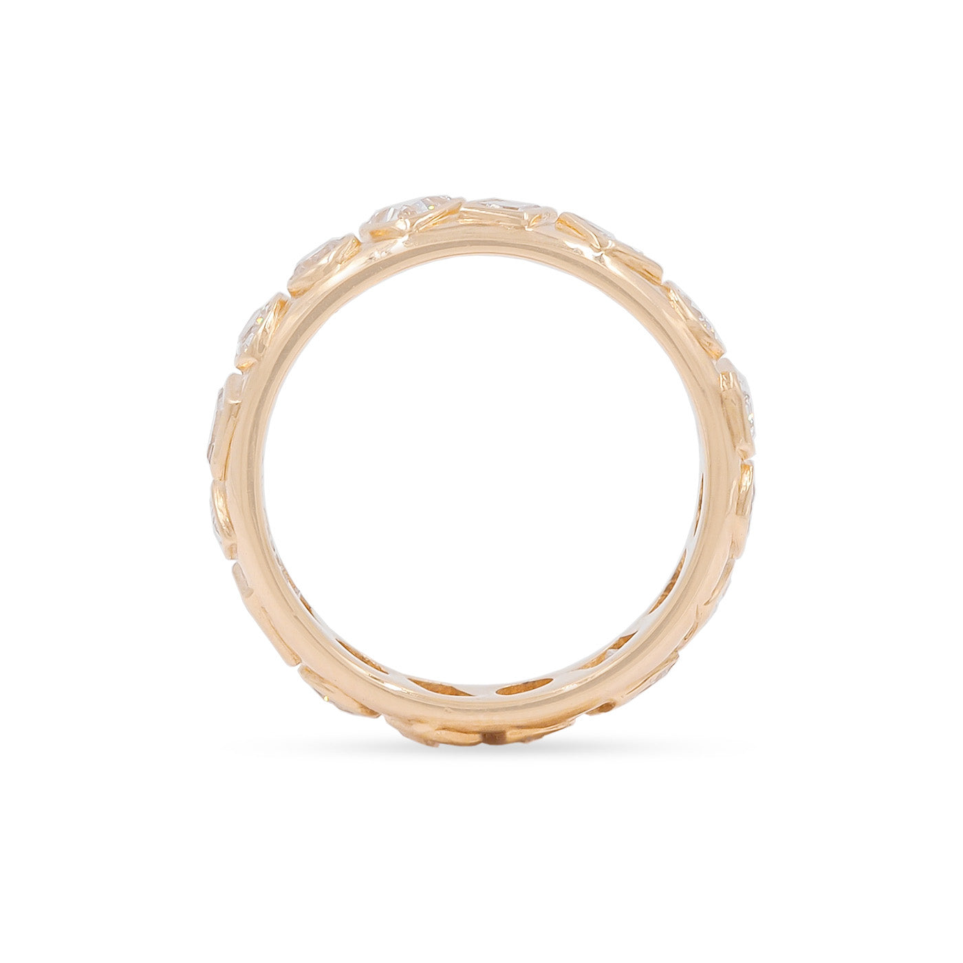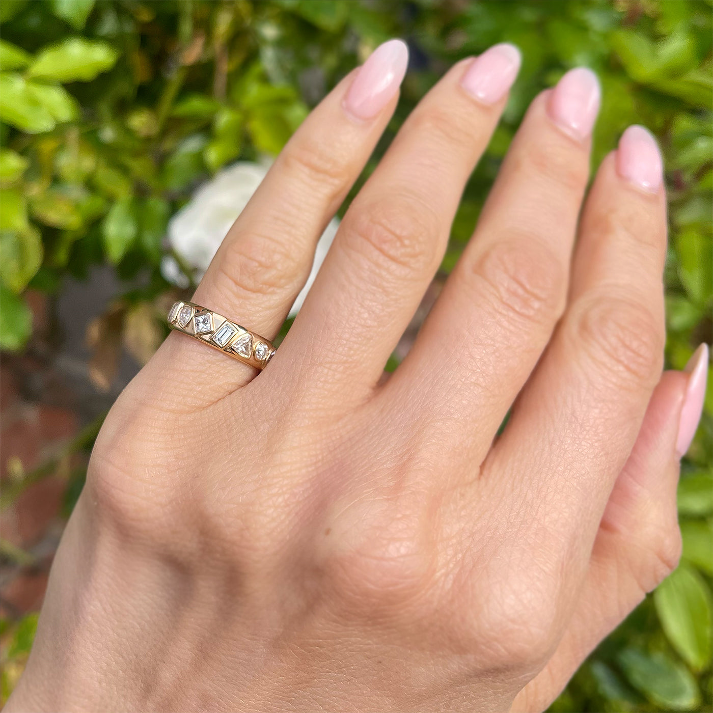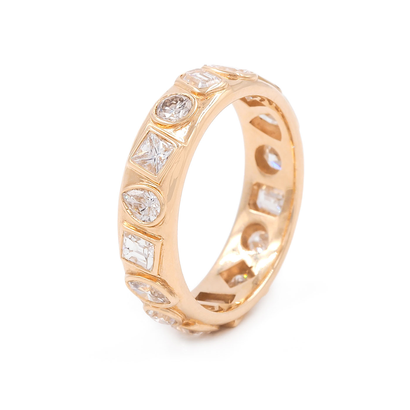 American 1.50 Ctw. Mixed Cut Diamond Eternity Ring from Bespoke by Platt, composed of 14k yellow gold. With 16 diamonds bezel-set into the band – a combination of different shapes including Round Brilliant cuts, Pear-Shaped cuts, Princess Cuts, Step Cuts, and Trillion Cuts – weighing approximately 1.50 carats in total, with colors estimated to range I-J and clarities estimated to range VS-SI. The ring measures approximately 5.1 mm wide and weighs 3.86 grams; fits like a size 5- 5.25 (not easily sizable). American origin. Contemporary.