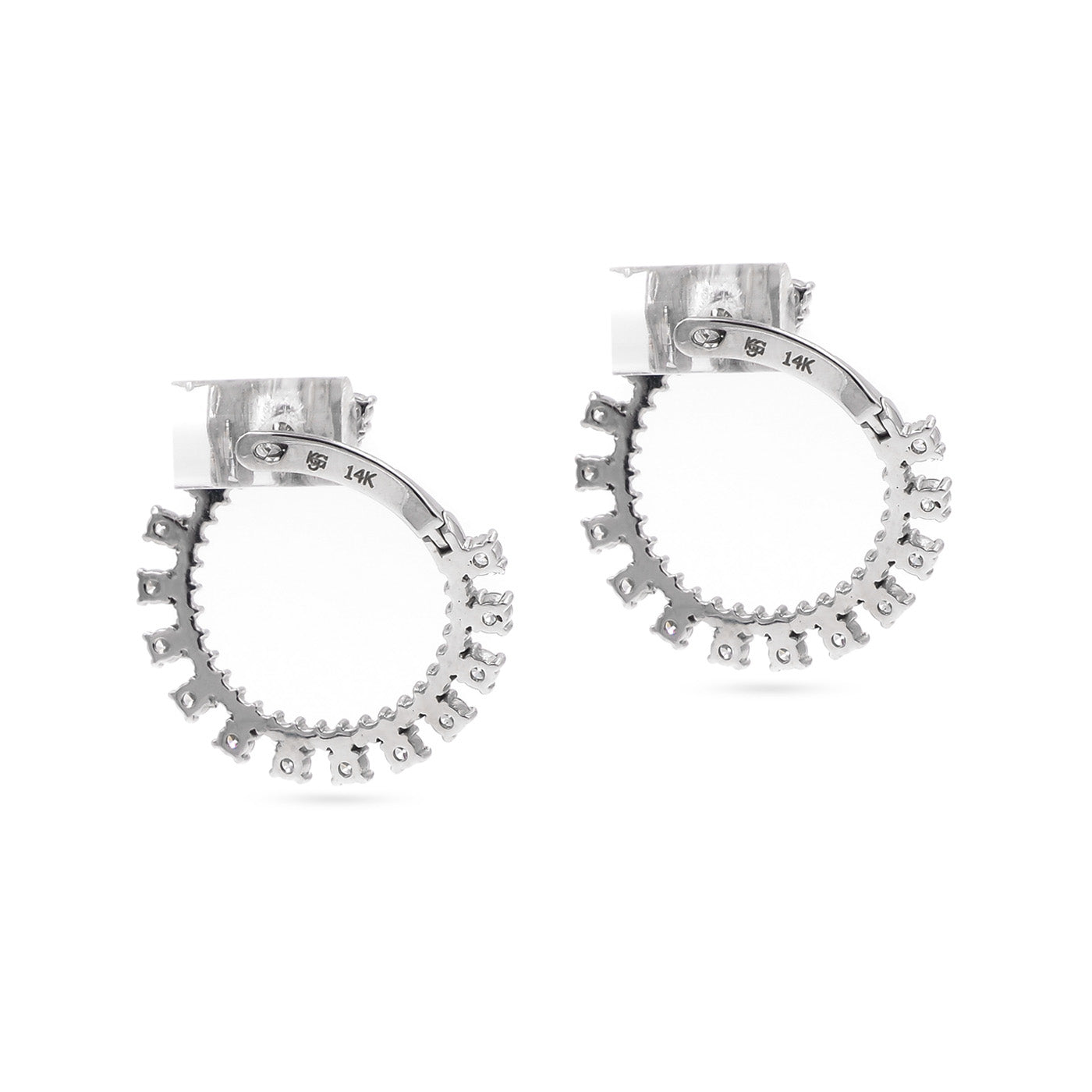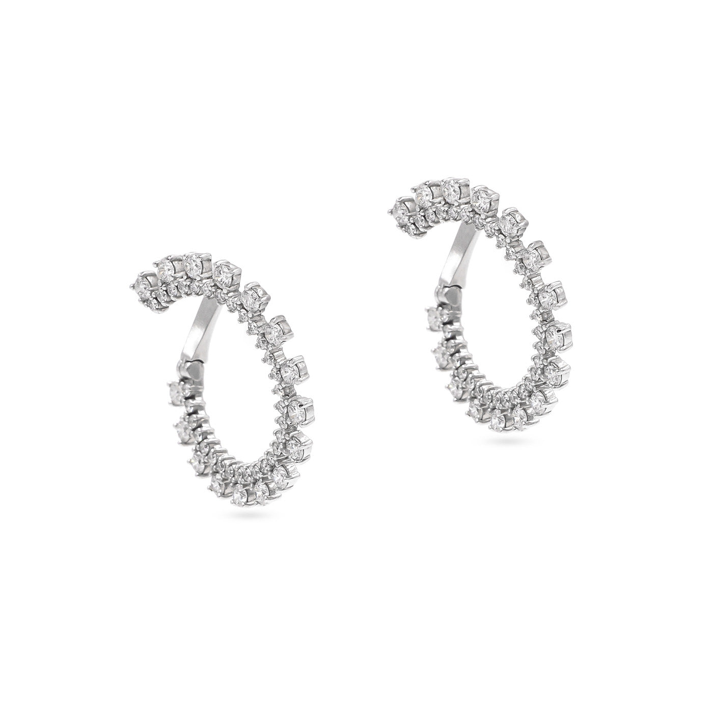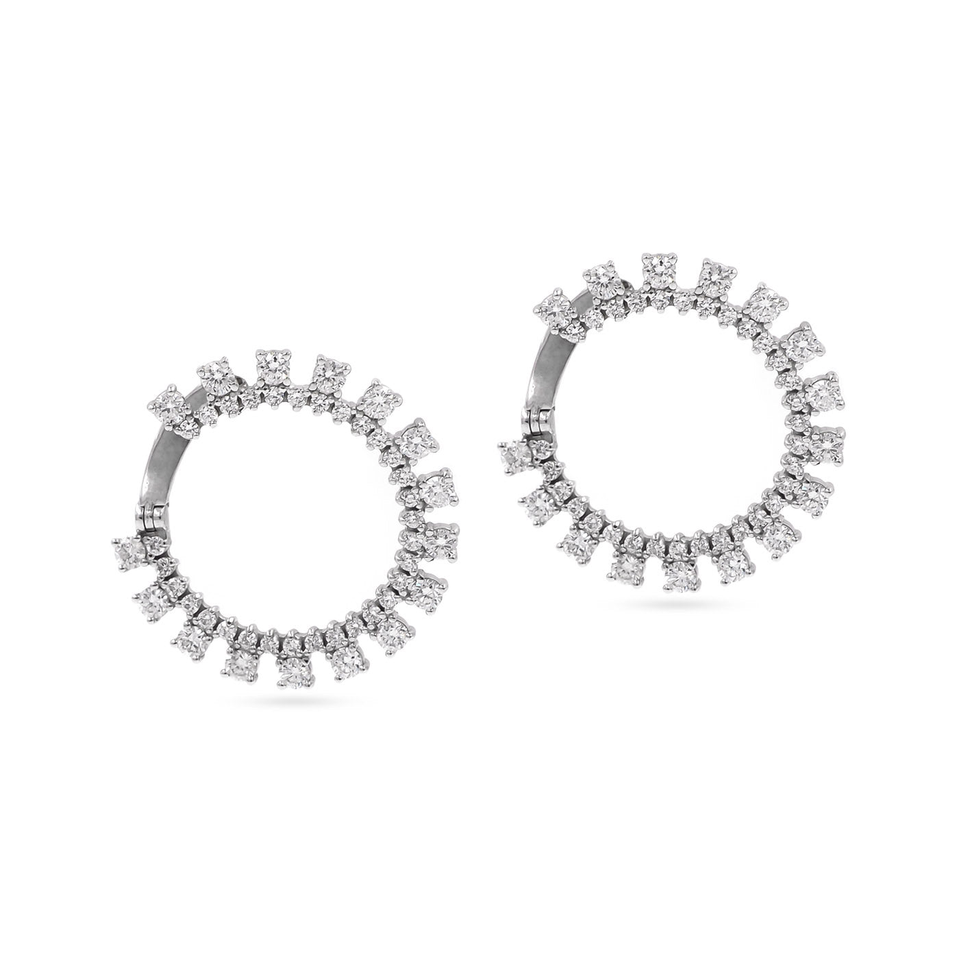 American 1.70 Ctw. Round Brilliant Diamond Open Hoop Earrings from Bespoke by Platt, composed of 18k white gold. Set with 94 Round Brilliant Cut diamonds weighing approximately 1.70 carats in total, with colors estimated to range G-H and clarities estimated to range VS-SI. The earrings measure approximately 7/8" in diameter; weigh 3.8 grams in total. With hinging post backs. American origin. Contemporary.