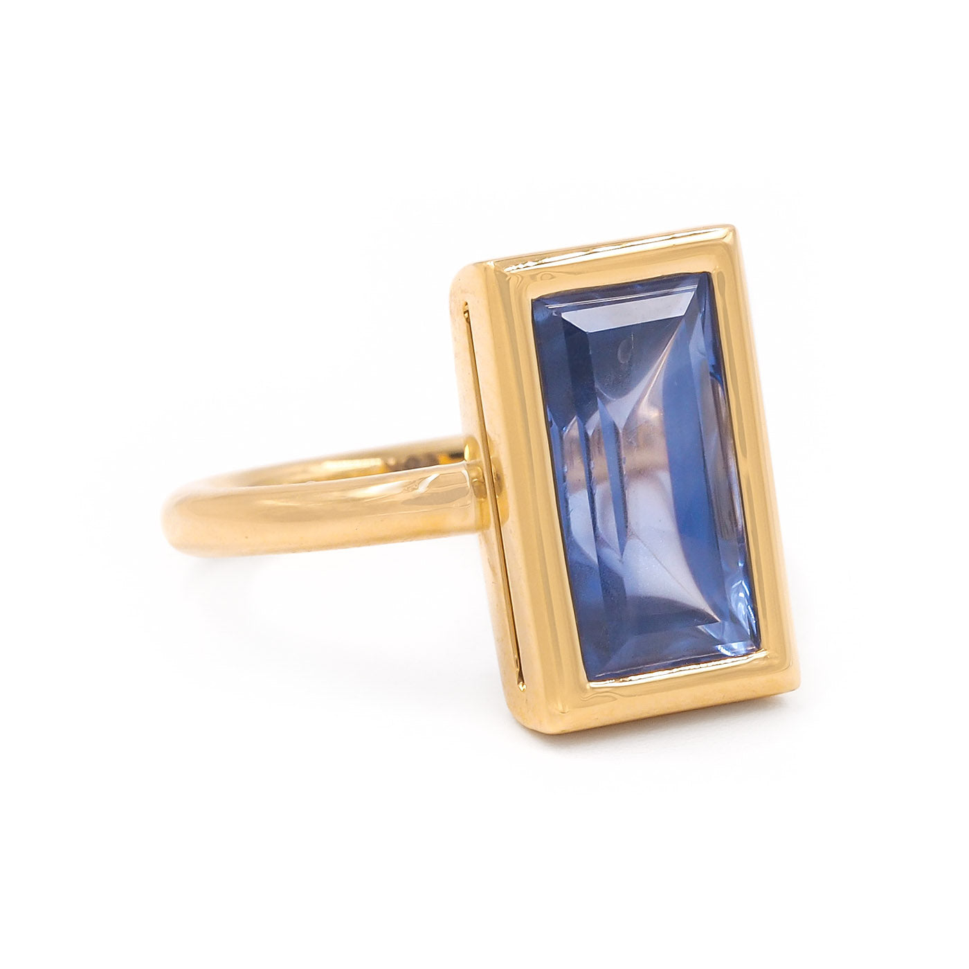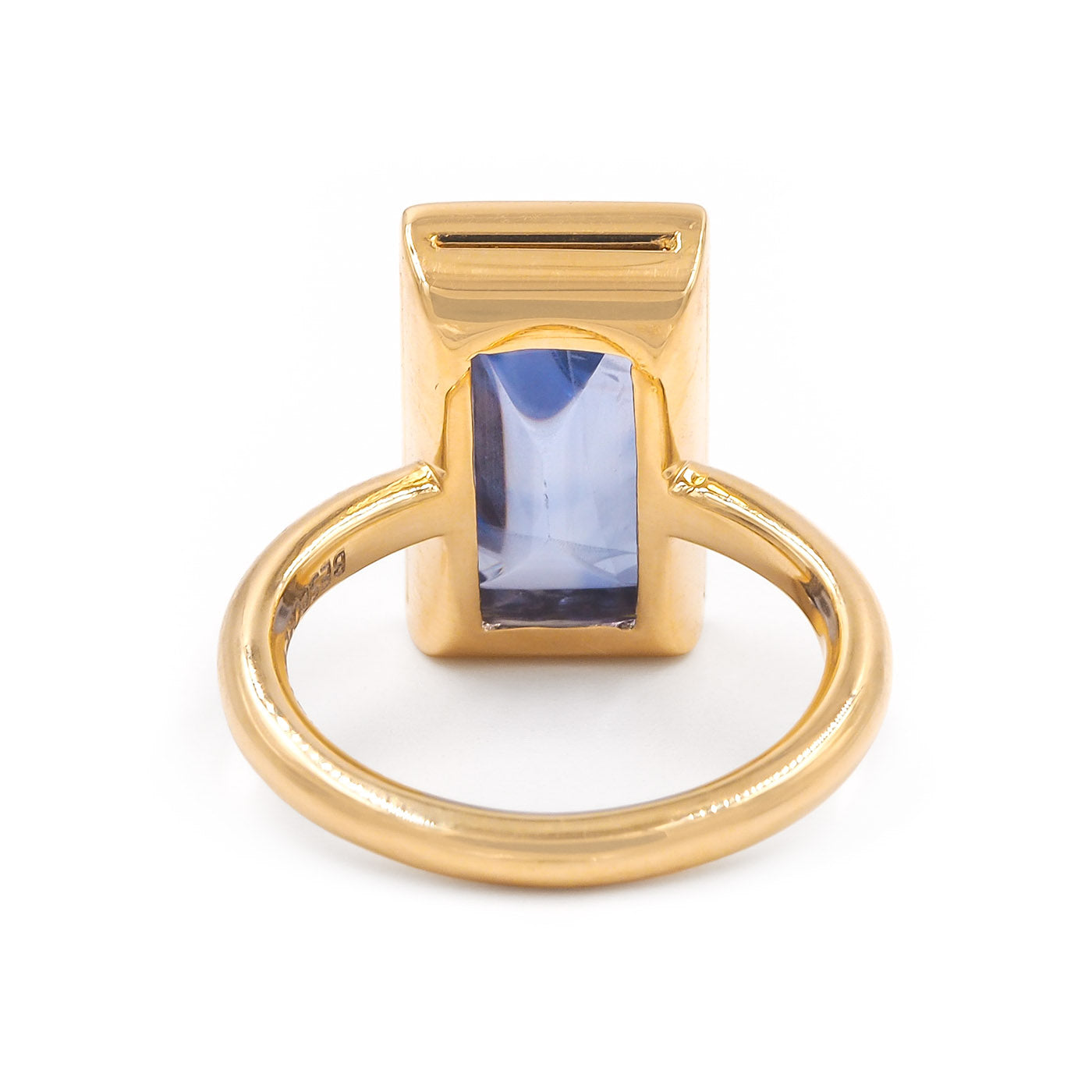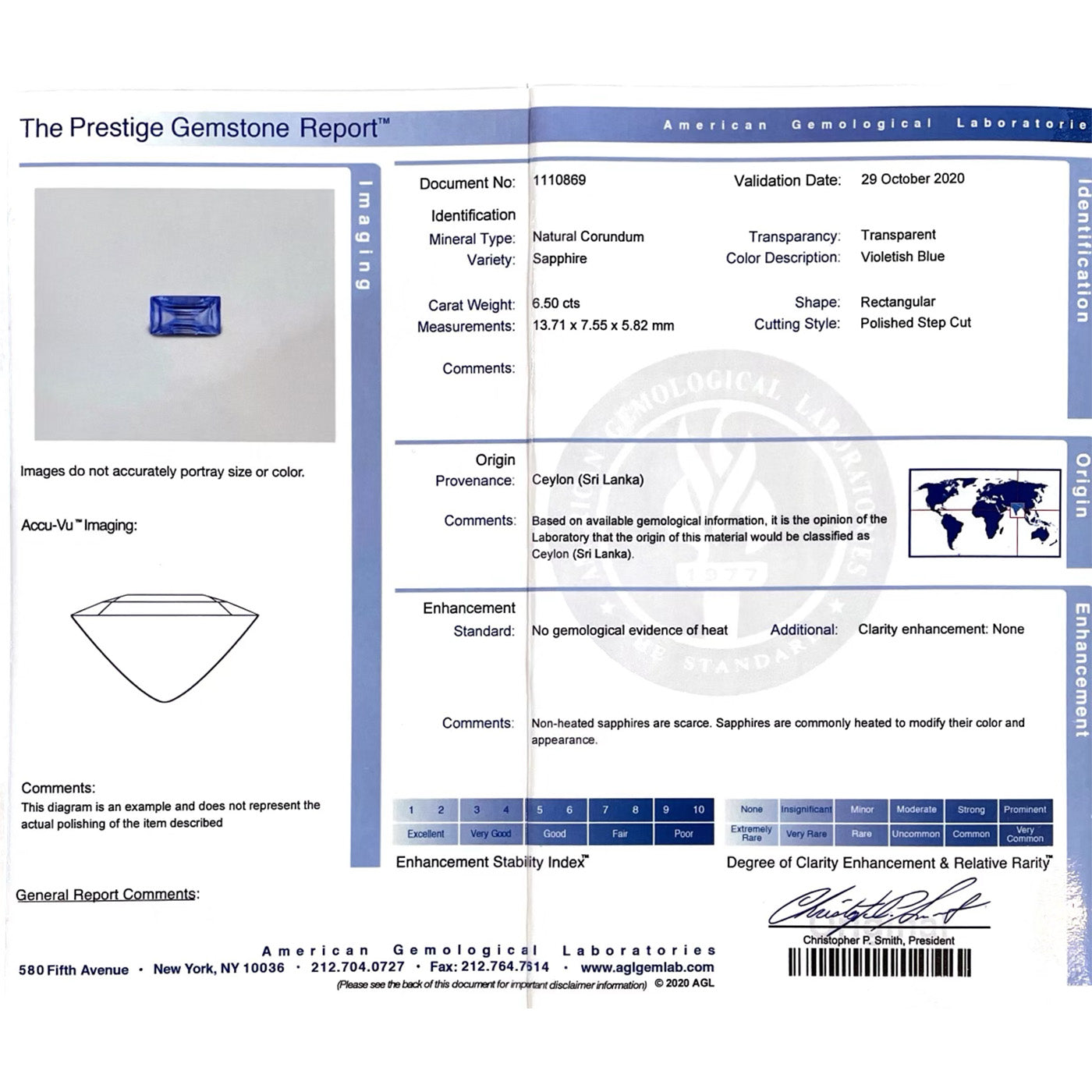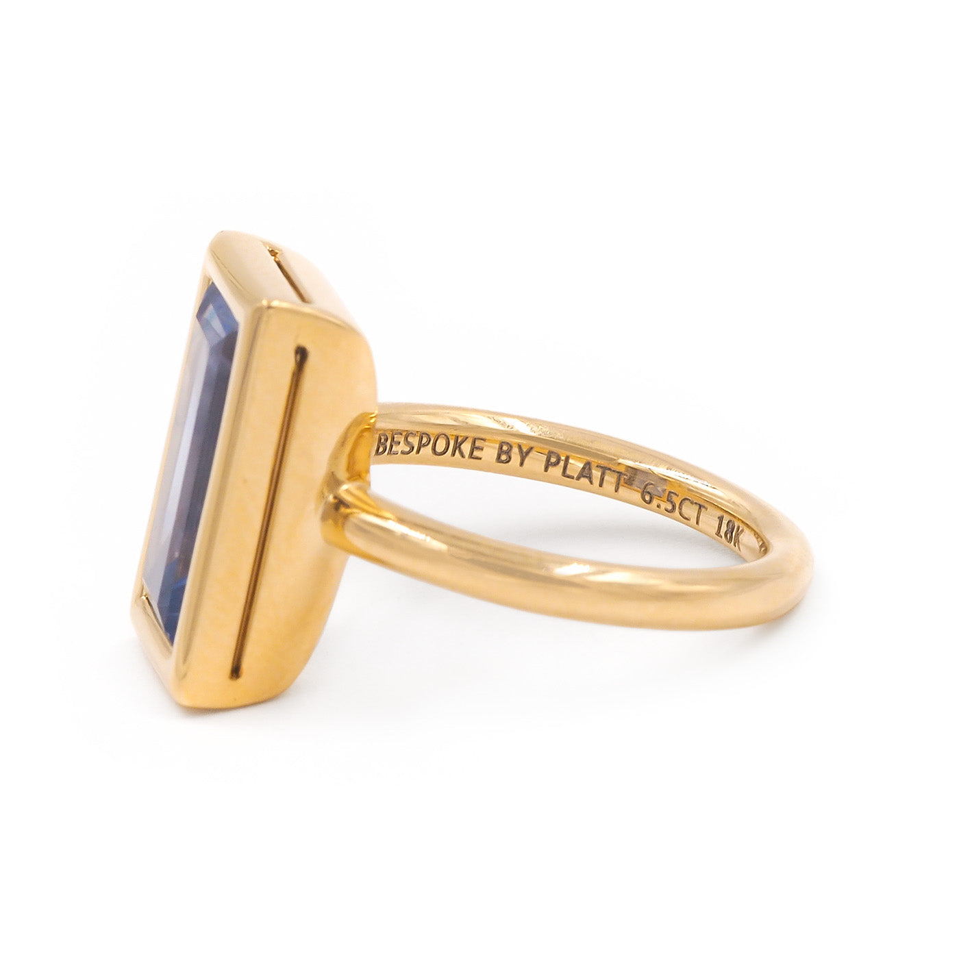 American 6.50 Carat Ceylon Unheated Blue Sapphire Ring from Bespoke by Platt, composed of 18k yellow gold. The 6.50 carat blue sapphire is AGL certified to have Ceylon Origin, with No Heat Treatment. The rectangular setting measures approximately 16.03 mm tall by 9.9 mm wide; weighs 9.2 grams.
