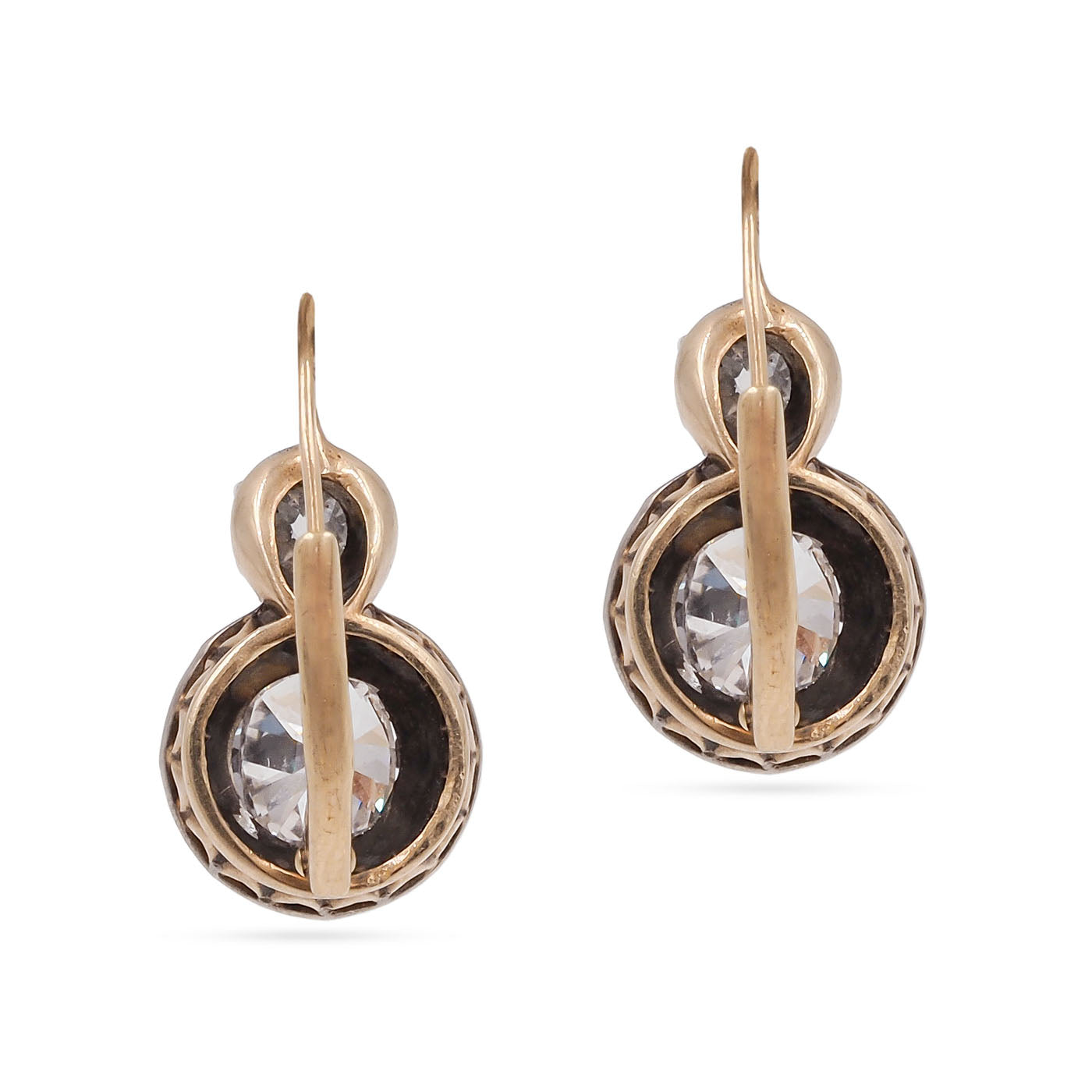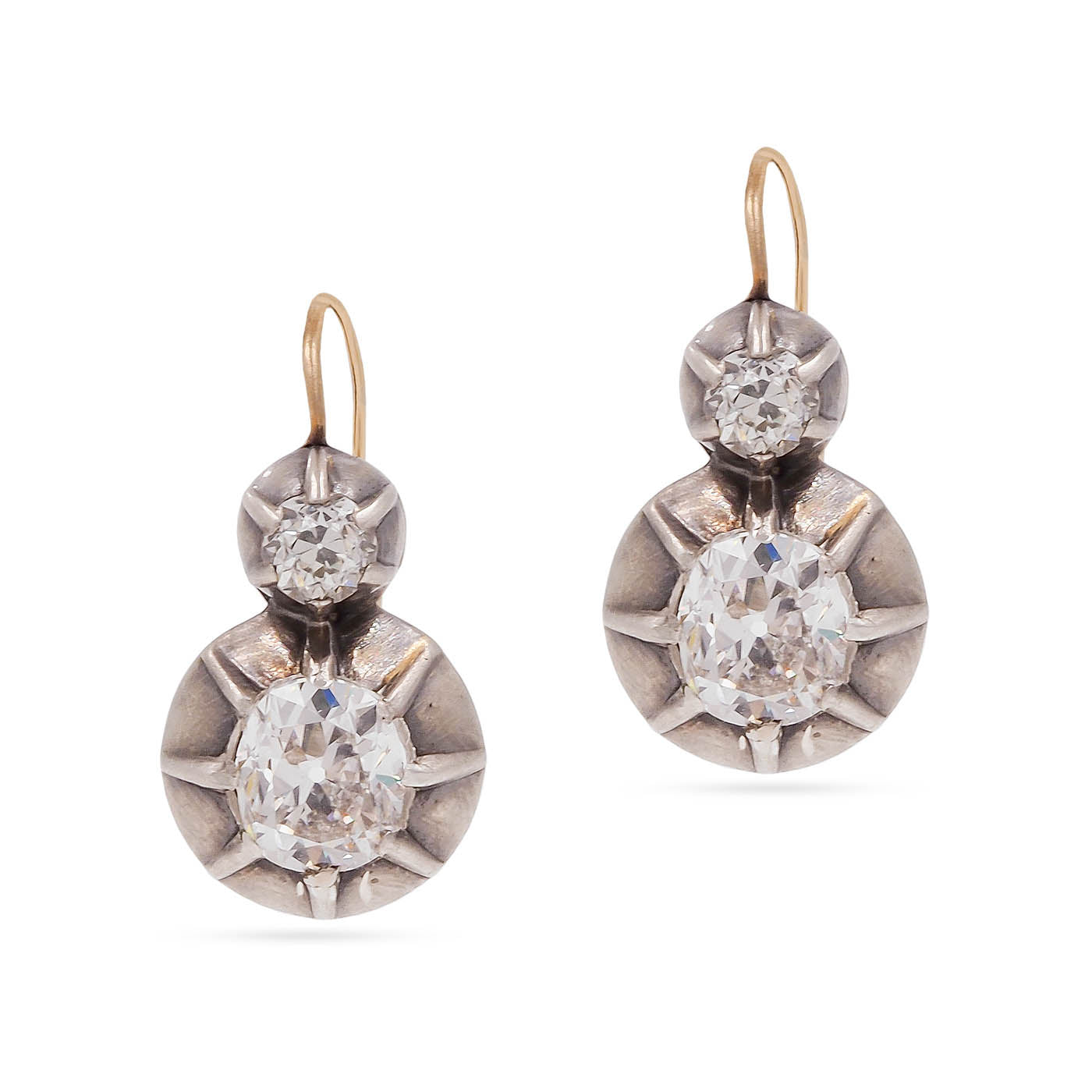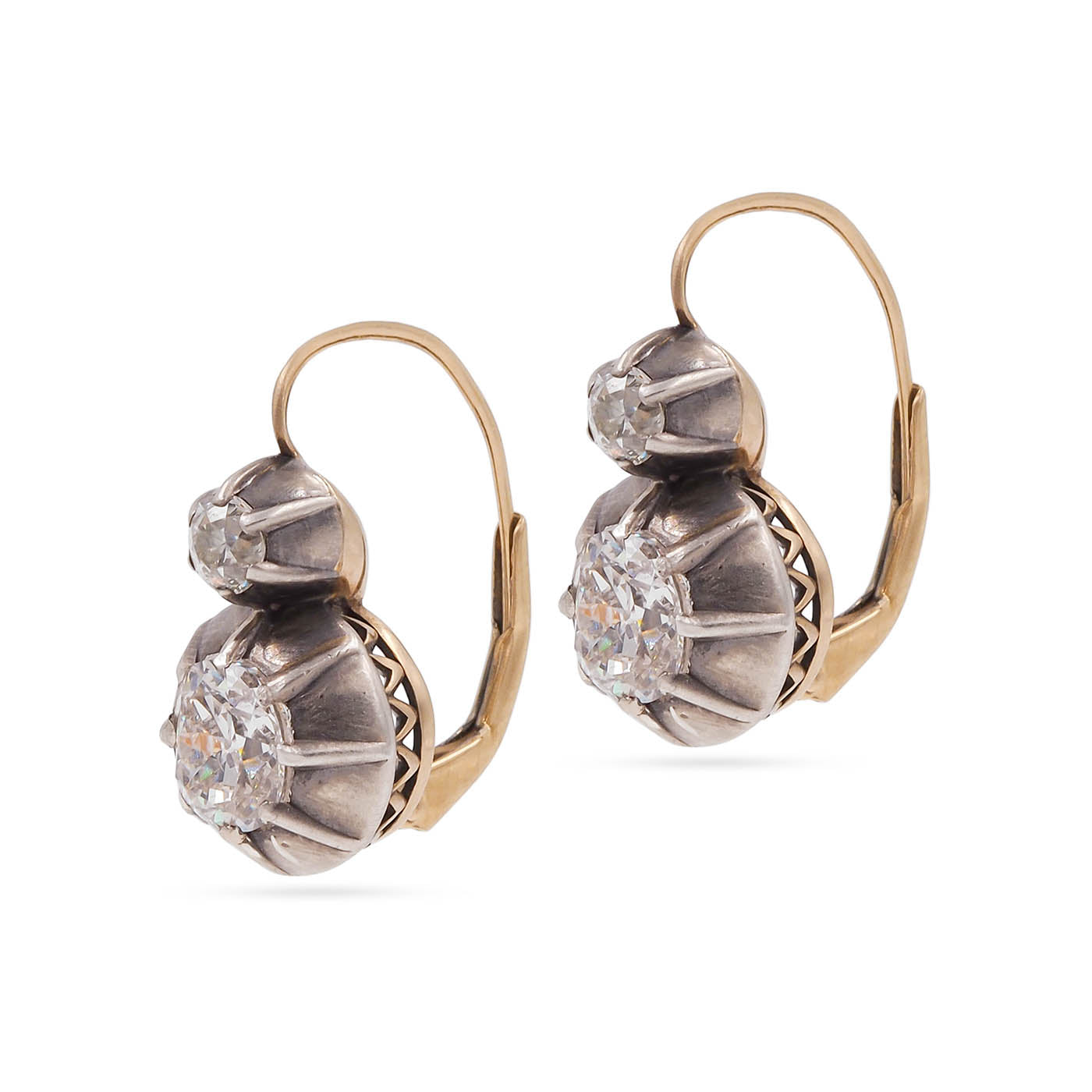 American Georgian-Inspired Diamond Drop Earrings from Bespoke by Platt, composed of silver and 14k yellow gold. With 4 diamonds in total, 2 larger Old Mine Cut diamond "drops" that weigh approximately 1.69 carats in total -- estimated to be 0.88 carats and 0.81 carats respectively -- and 2 Old European Cut diamonds as the "tops" that weigh approximately 0.40 carats in total. The diamonds are set within collet-style mountings; the earrings measure approximately 19.5 mm tall by 10.1 mm wide. With closing French wire lever backs. American origin. Contemporary.