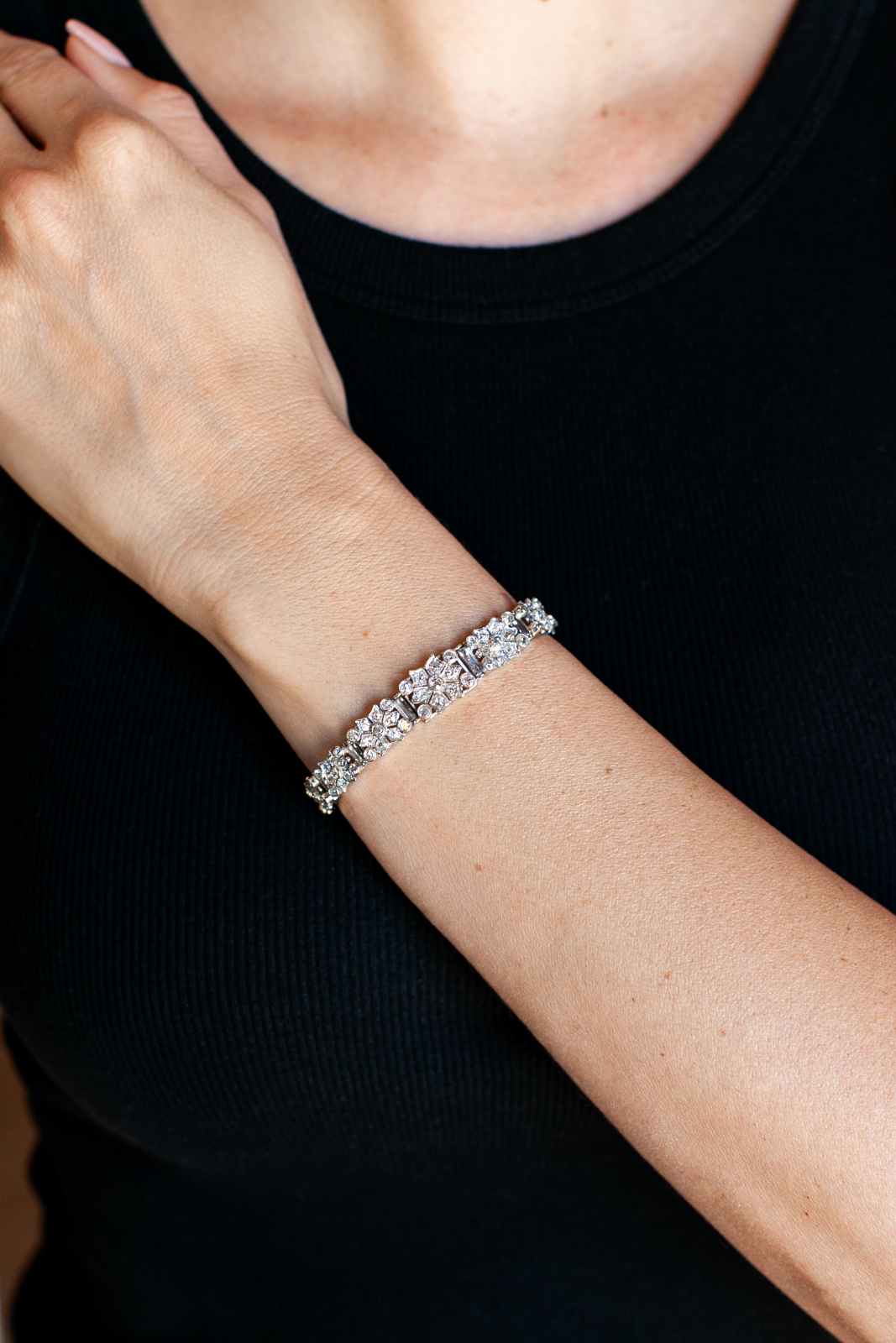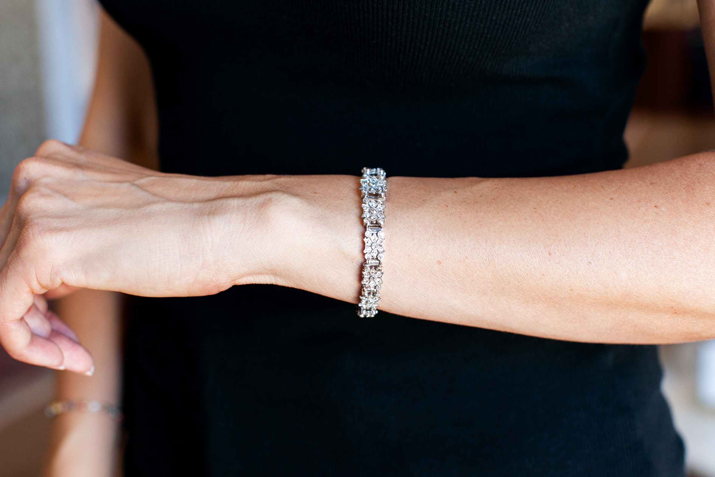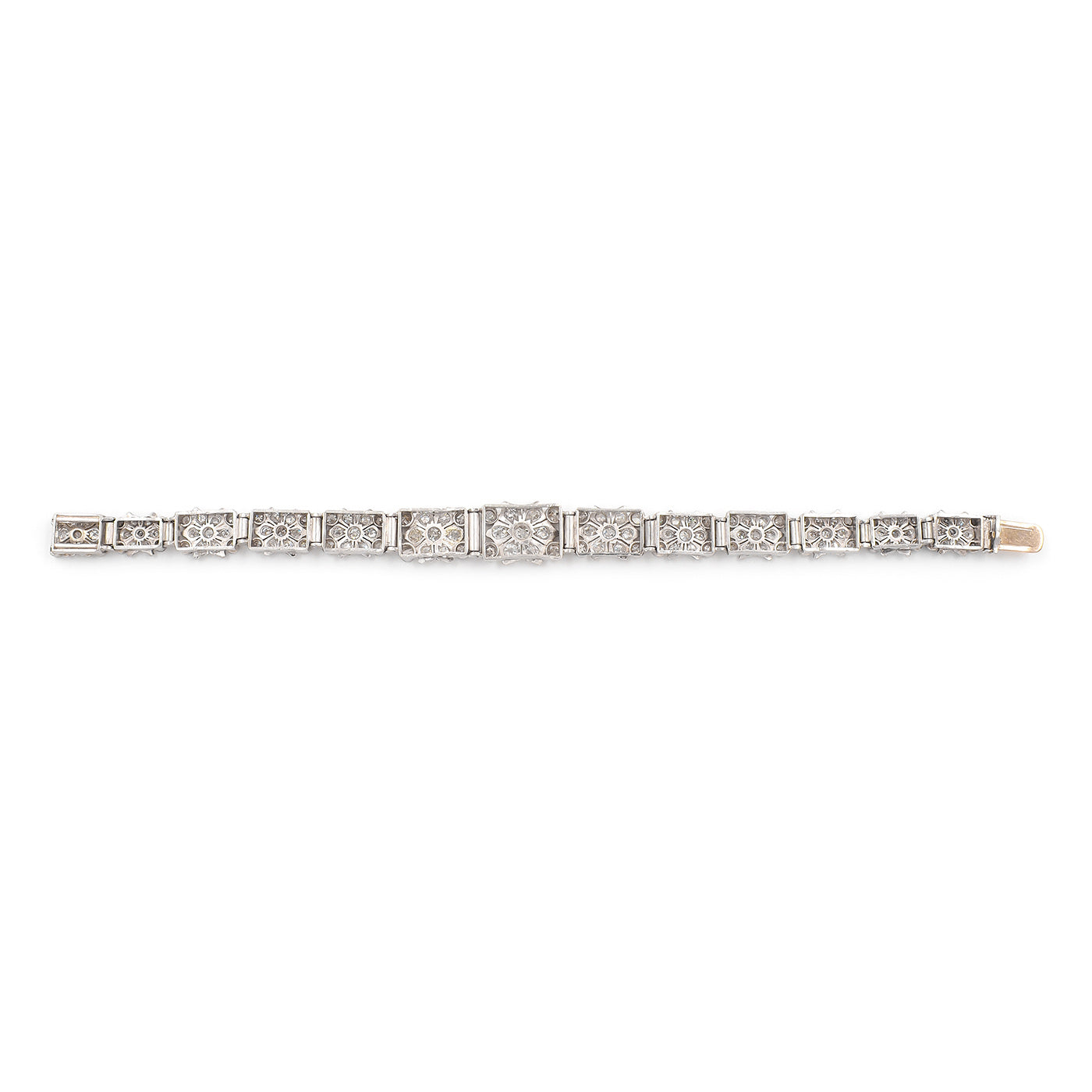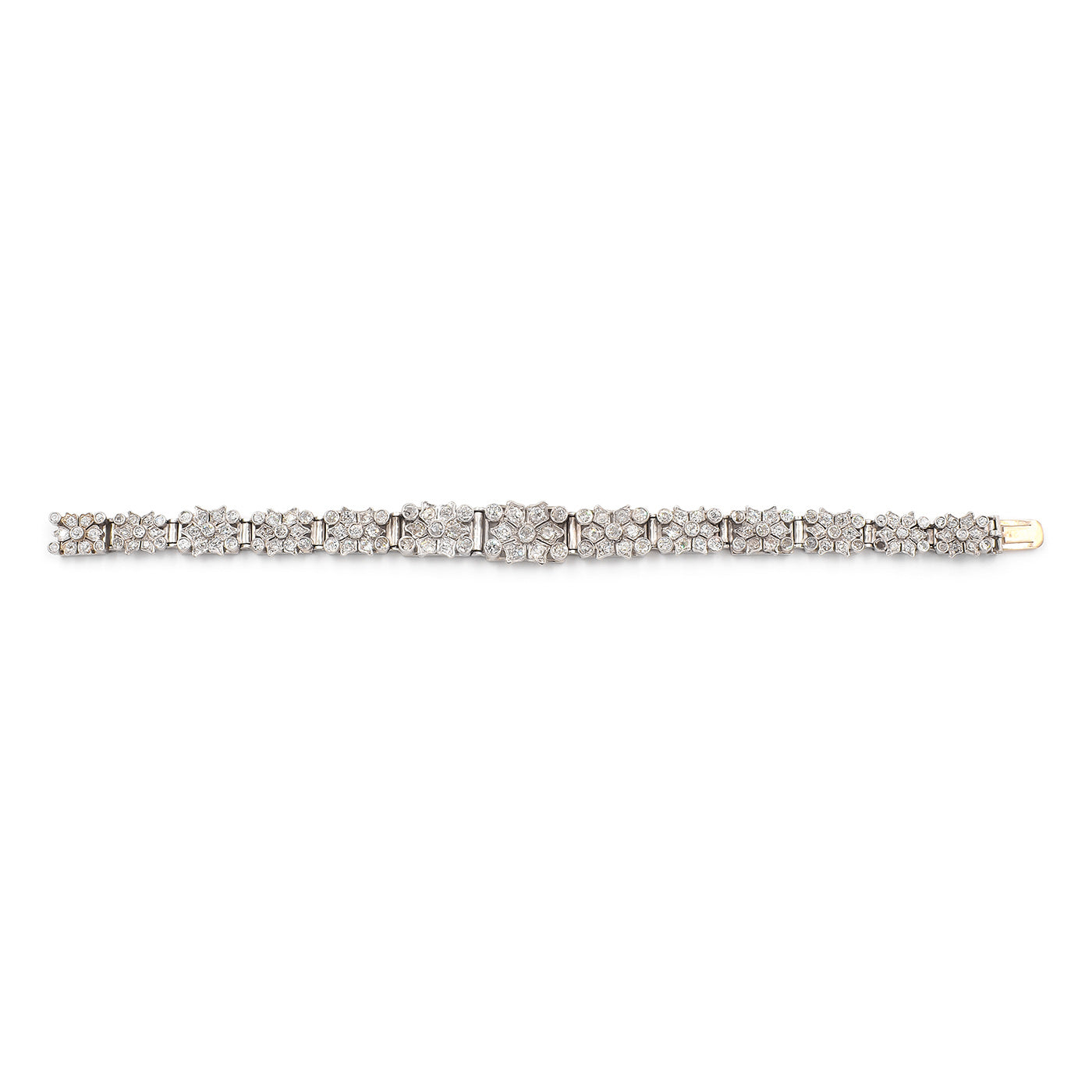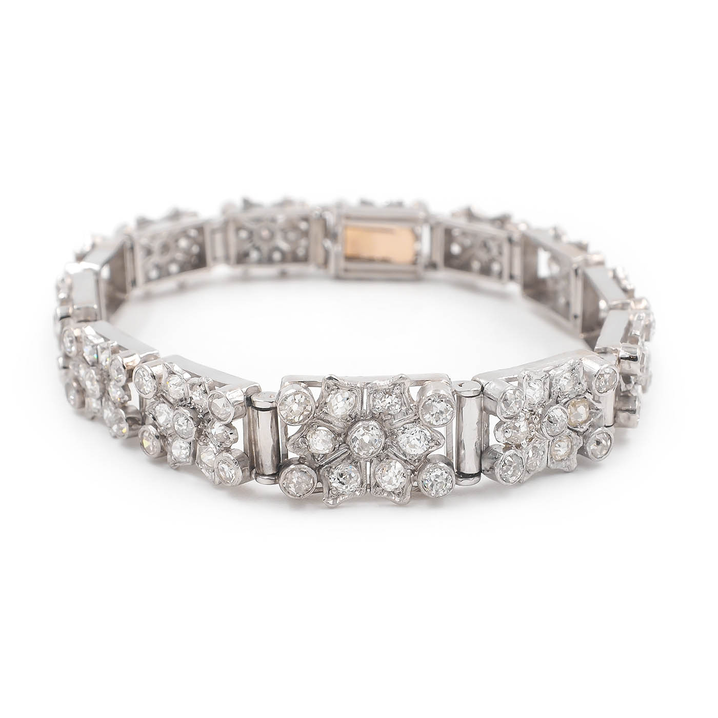 Art Deco 6.00 Ctw. Old Mine Cut Diamond Snowflake Motif Bracelet composed of platinum. With 148 Old Mine Cut diamonds weighing approximately 6.00 carats in total, set into links with geometric details reminiscent of a snowflake design. The bracelet measures approximately 6.5″ long and is graduated in its width, measuring 9.5 mm wide at the front and 6.6 mm wide at the back; weighs 28.4 grams. With a push to close clasp. Circa 1920’s.