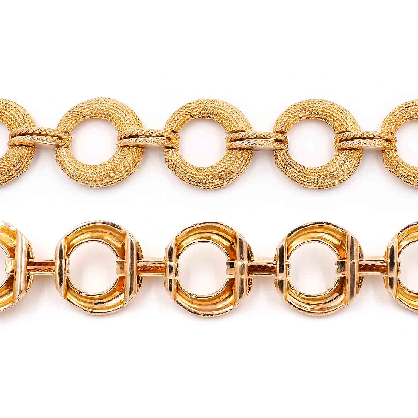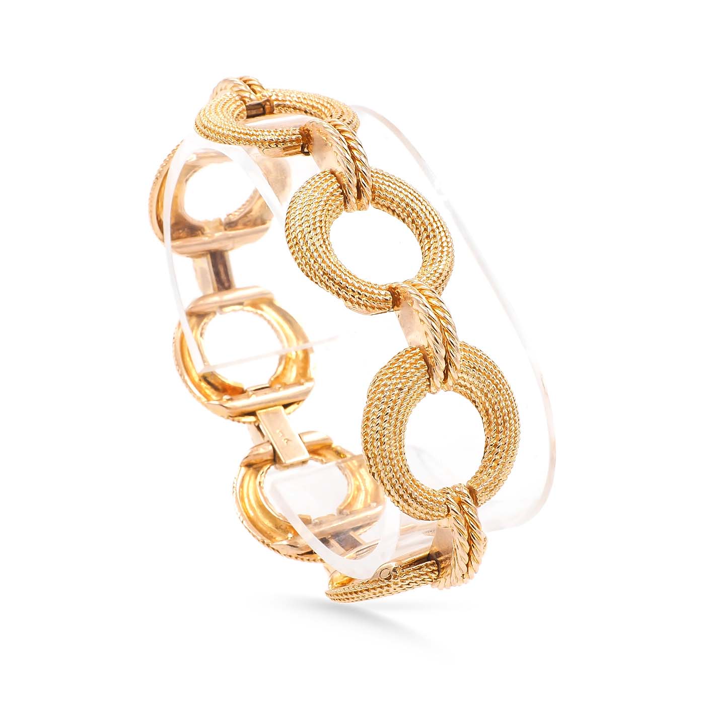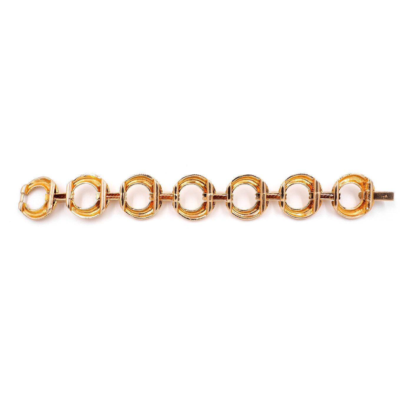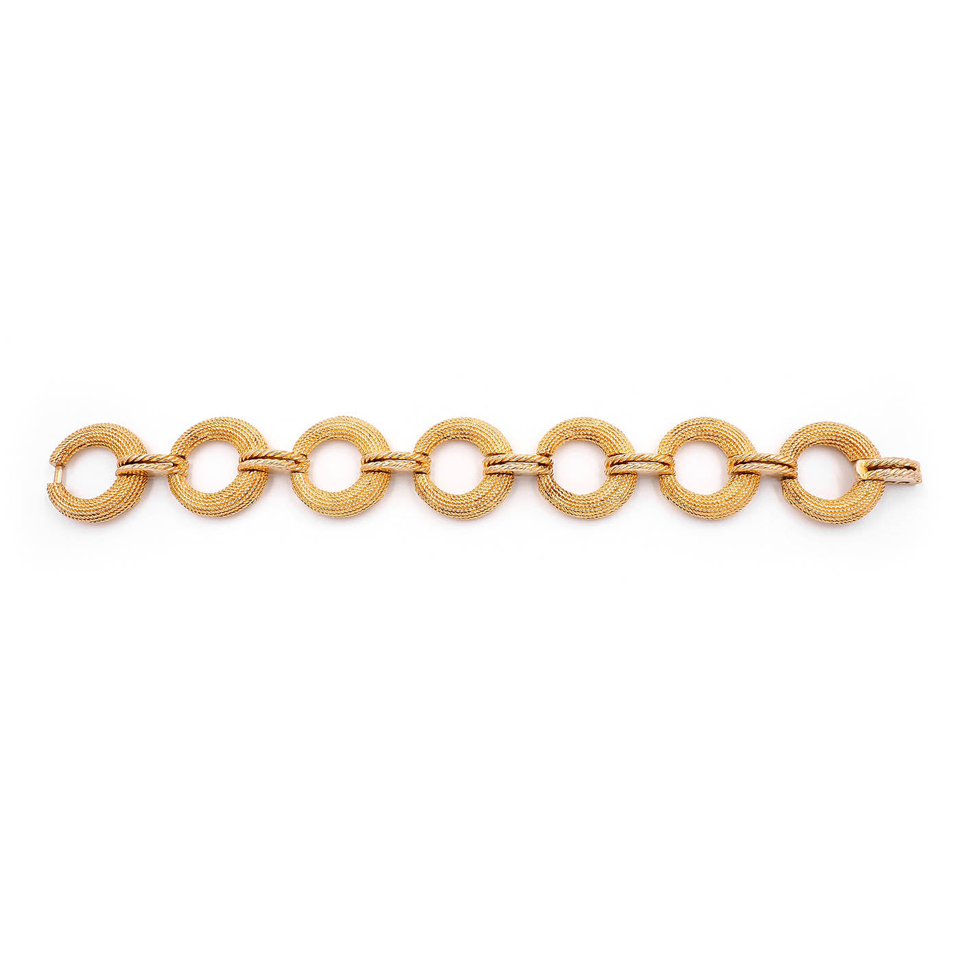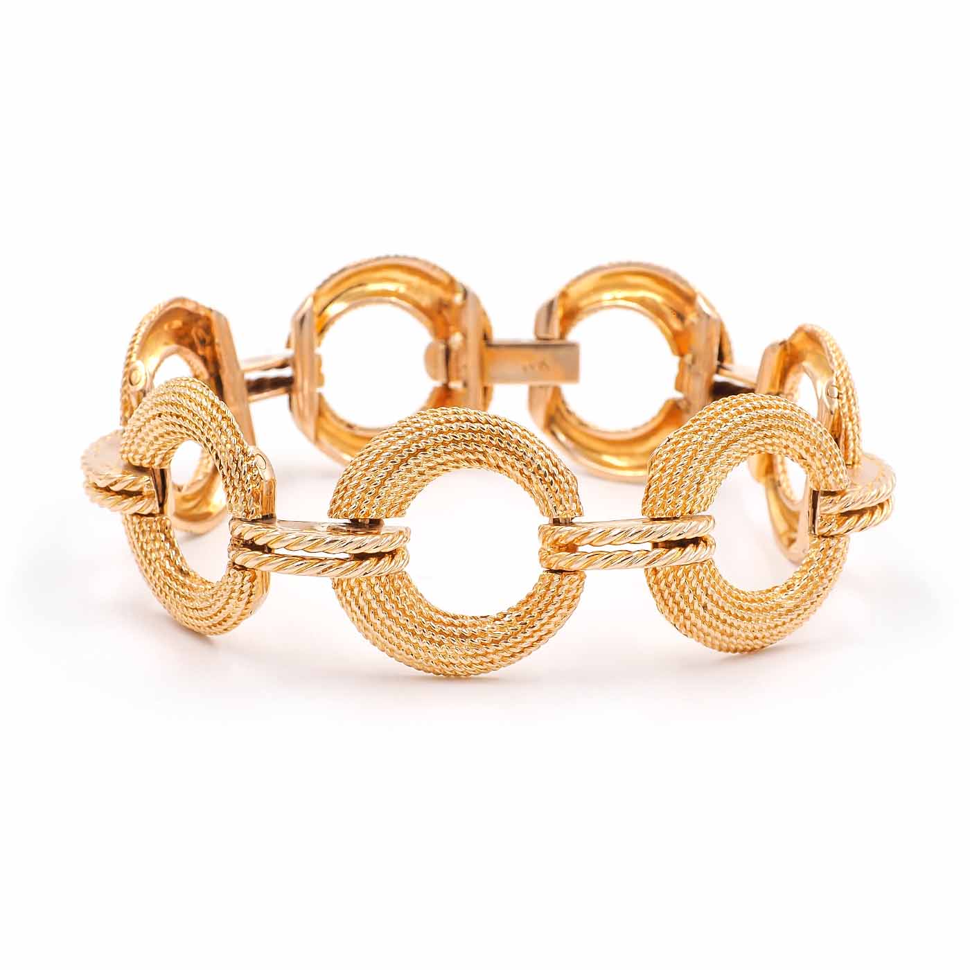 Mid-Century Circular Rope-Motif Gold Bracelet composed of 14k yellow gold. The circular links have rope-link texturing, with horizontal connector links. Tinks have hinges at the back connecting one to the next, making the bracelet fits similarly to a cuff. Measures approximately 23.4 mm wide and 7 1/2″ long (can be shortened); weighs 51.84 grams. With a latch to close. Circa 1950’s.