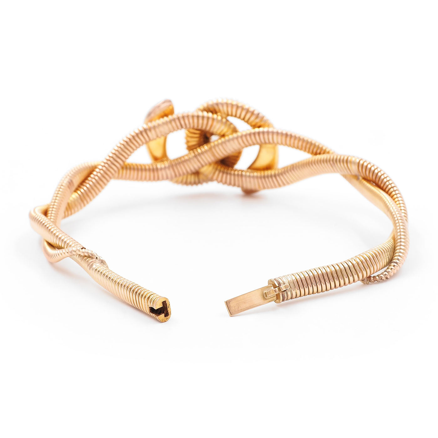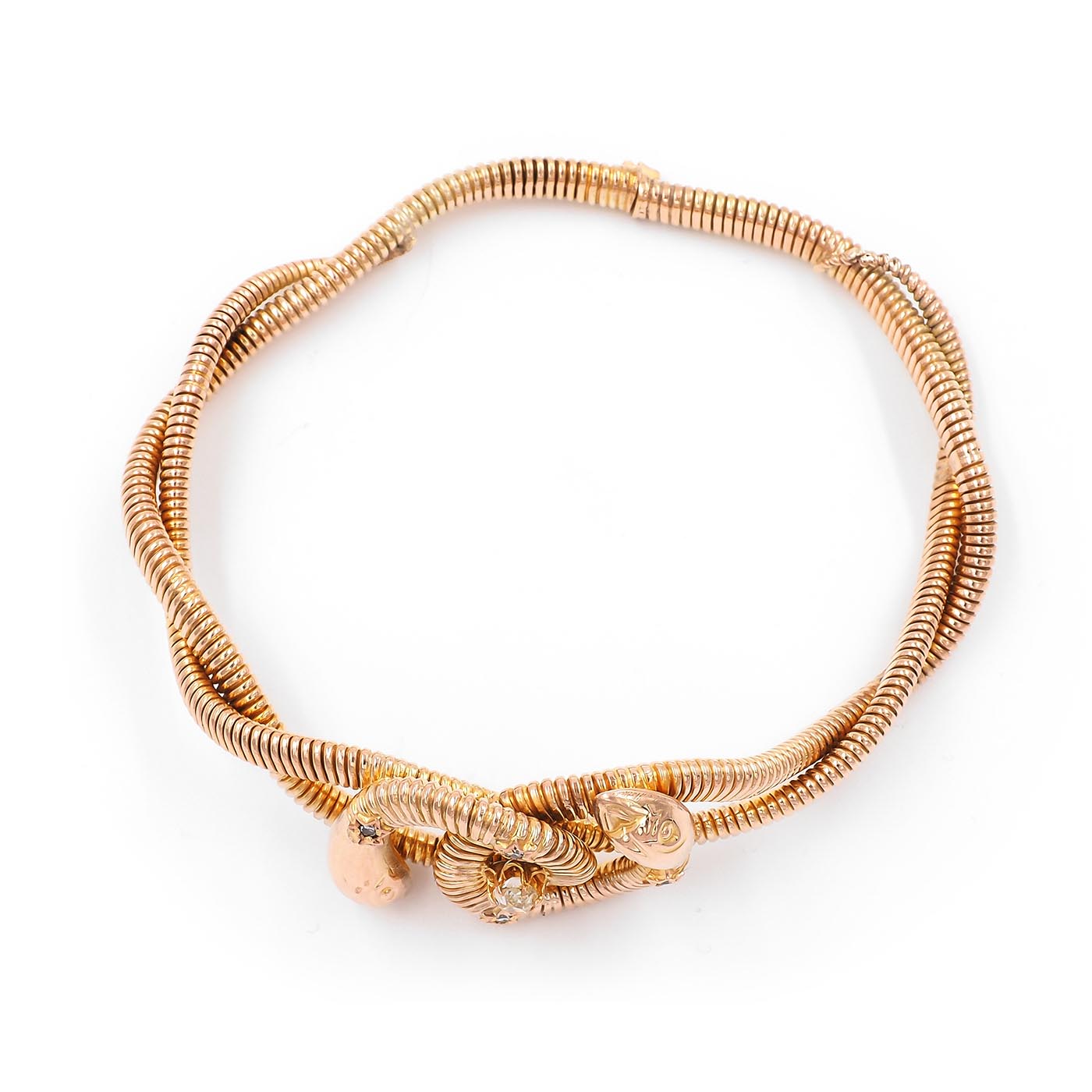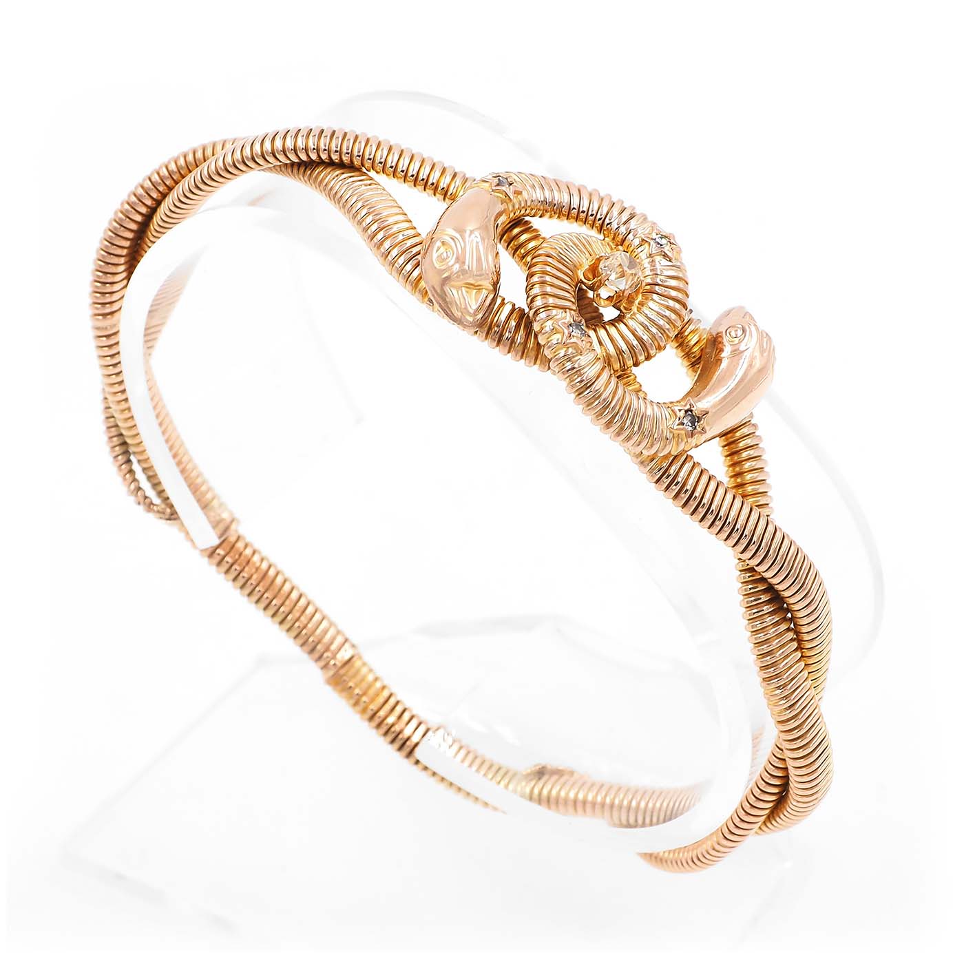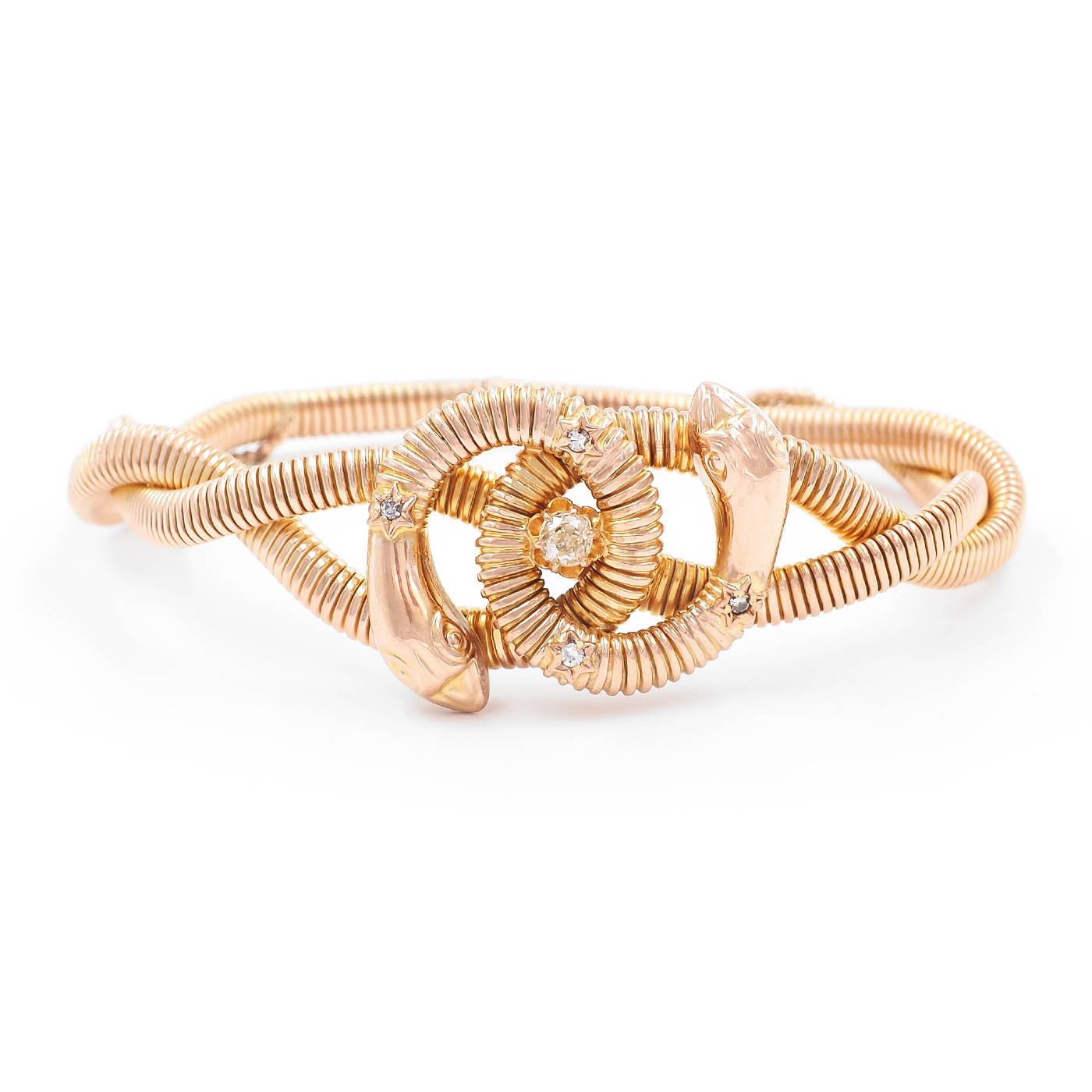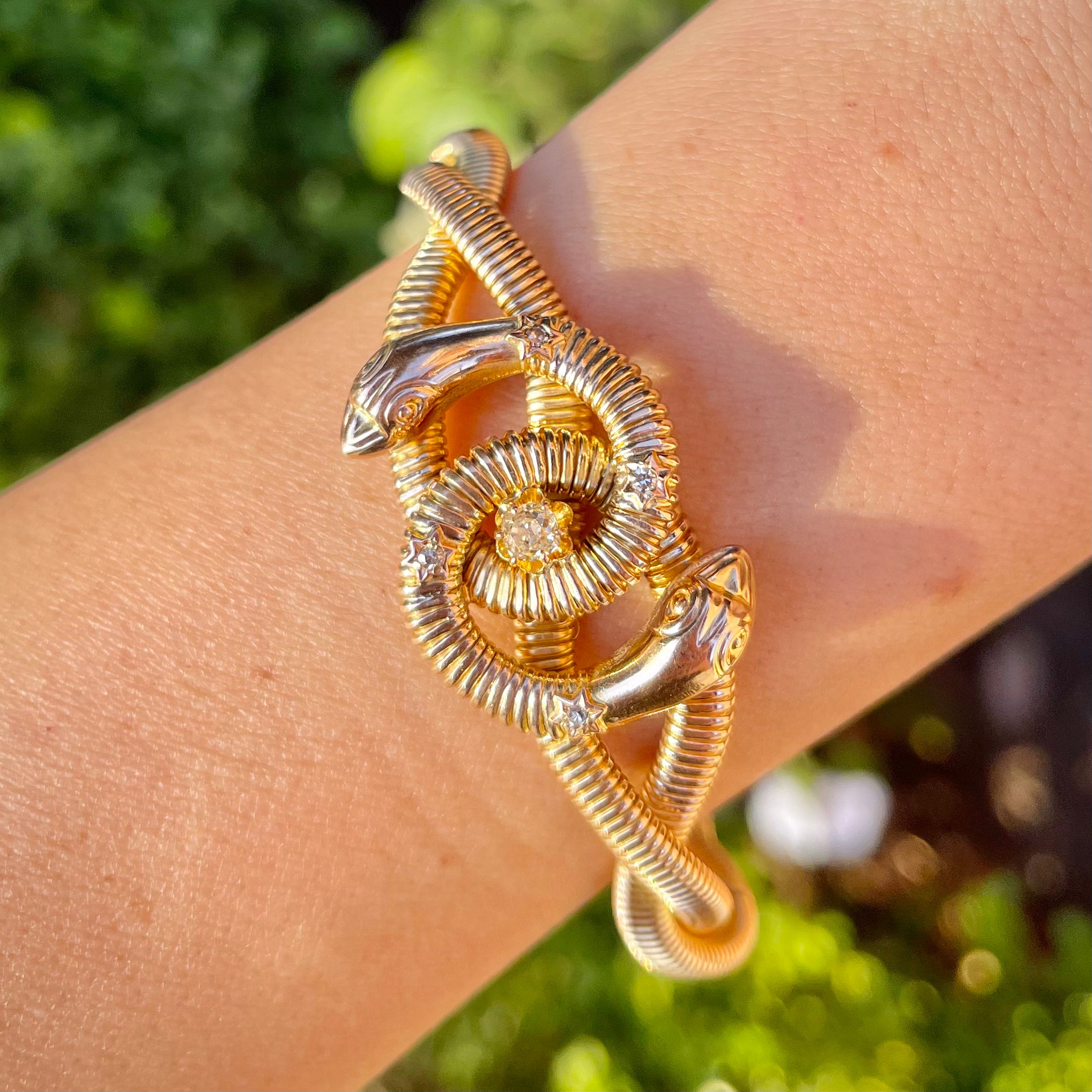 Retro Diamond Tubogas Snake Bracelet composed of 14k light yellow gold. Featuring two snakes intertwined at the center, accented by diamond-set star motifs -- a combination of Old Mine Cut and Single Cut diamonds (5 in total) weighing approximately 0.24 carats in total. The front of the bracelet measures approximately 3/4" wide; the bracelet measures approximately 8" long and weighs 17.1 grams. With a push-to-close clasp. Circa 1940's.