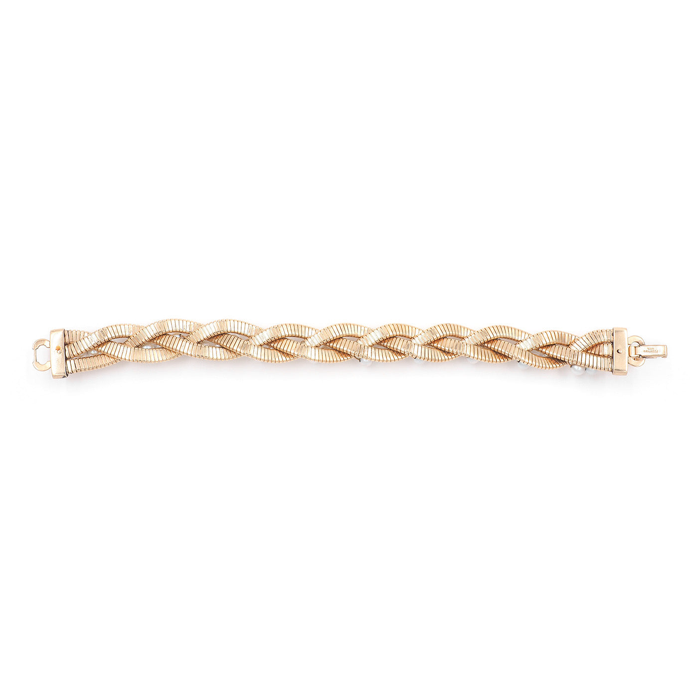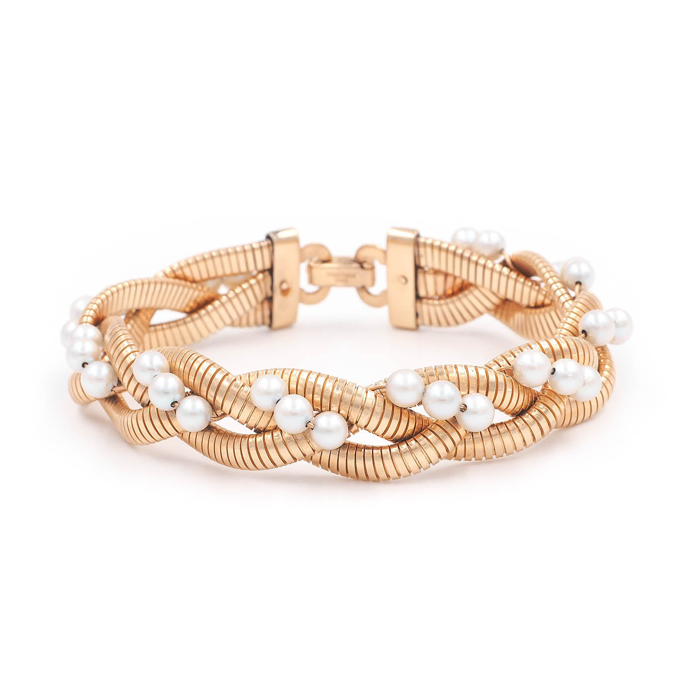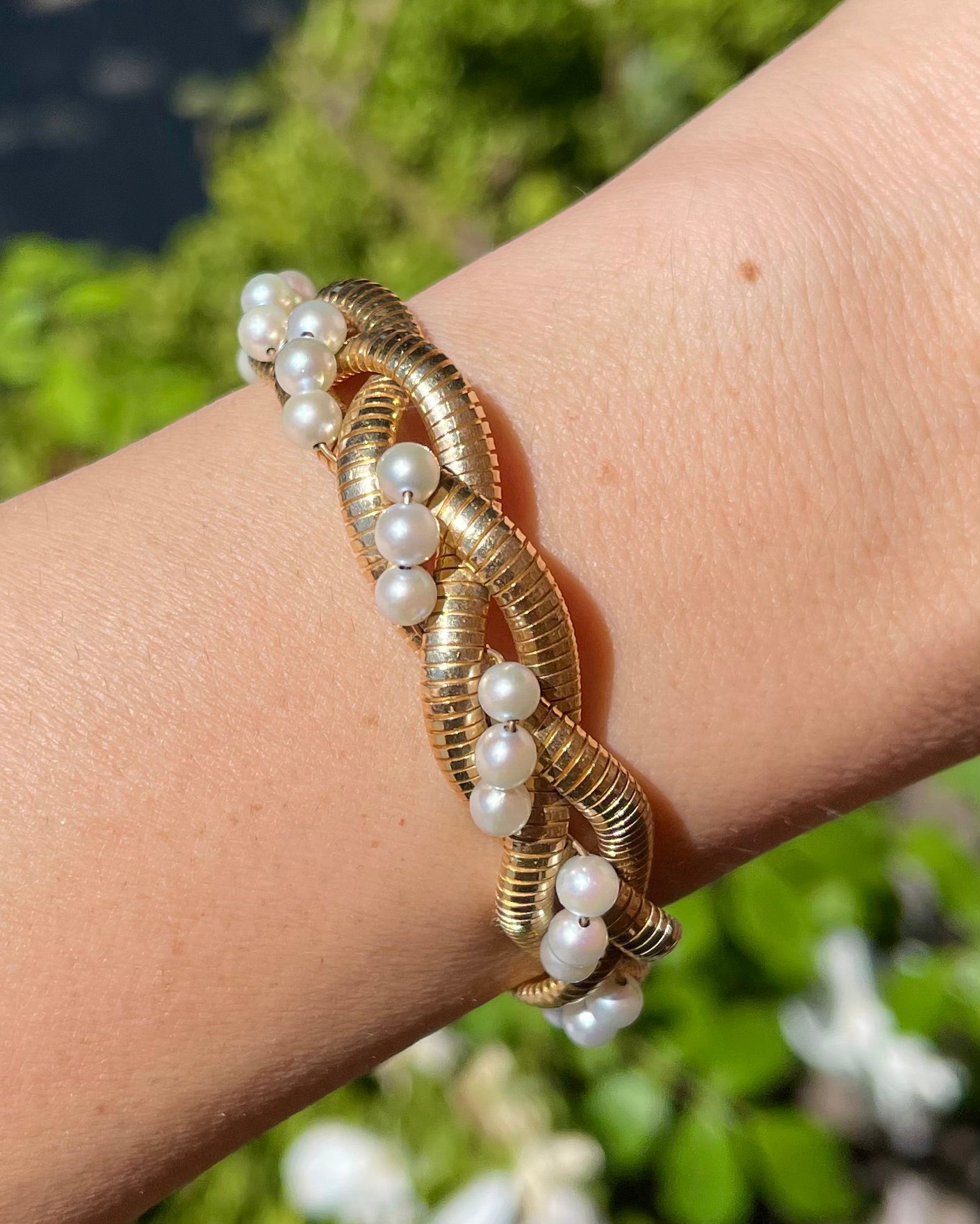 Retro Pearl & Braided Tubogas Bracelet composed of 14k yellow gold. With braided tubogas-style bracelets, accented with pearls. The bracelet measures approximately 7 1/4" long and 11.7 mm wide; with a securely latching clasp. Circa 1940's.
