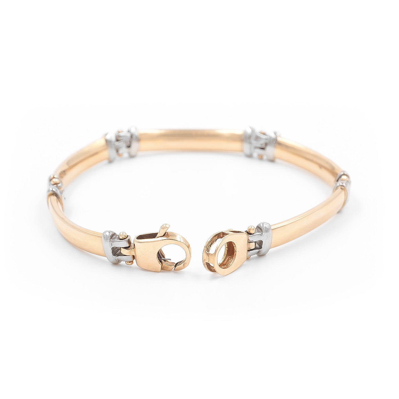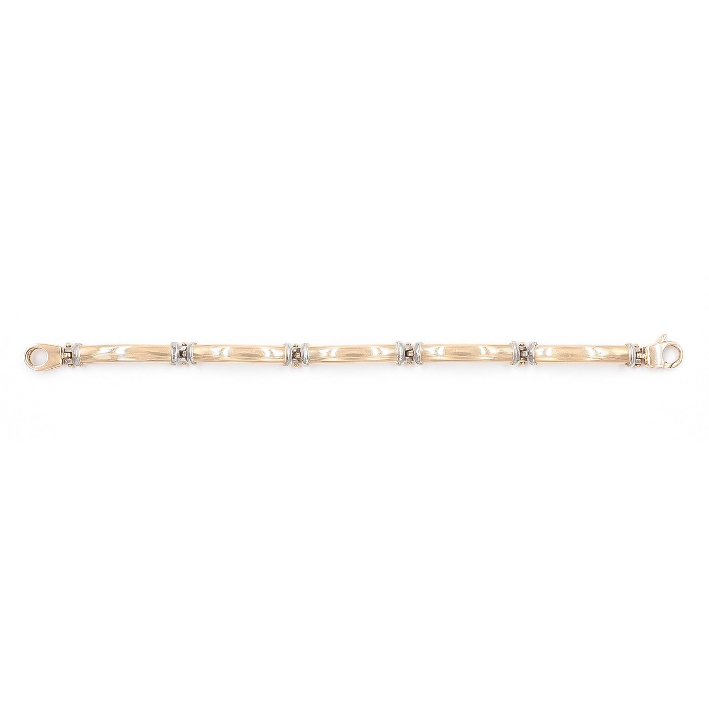 Vintage Two-Tone Gold Bar-Link Bracelet composed of 14k yellow gold and 14k white gold. With curved, elongated yellow gold bar-links alternating with 14k white gold connector links. The bracelet measures approximately 7" long and 5 mm wide; weighs 23.9 grams. Circa 1980’s.
