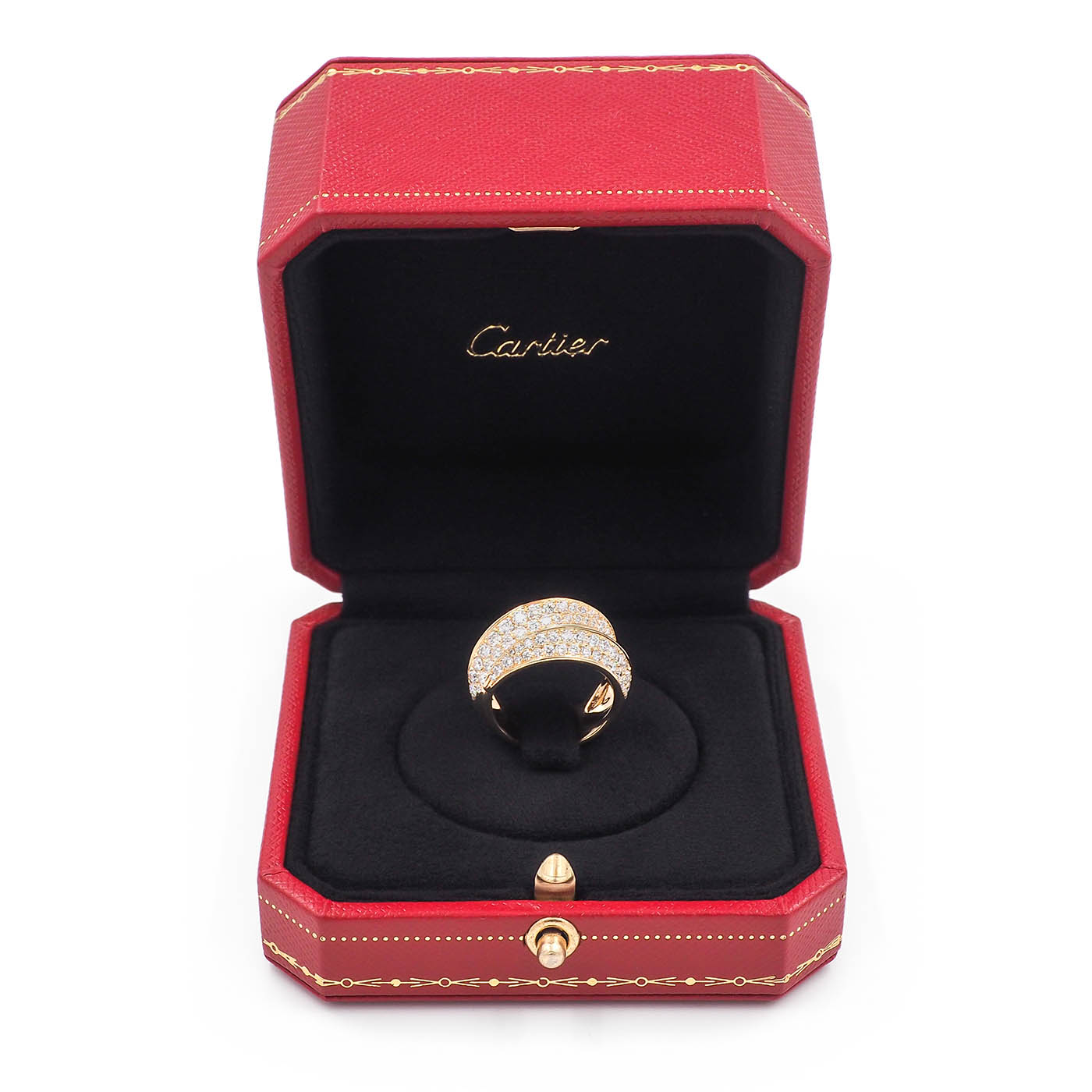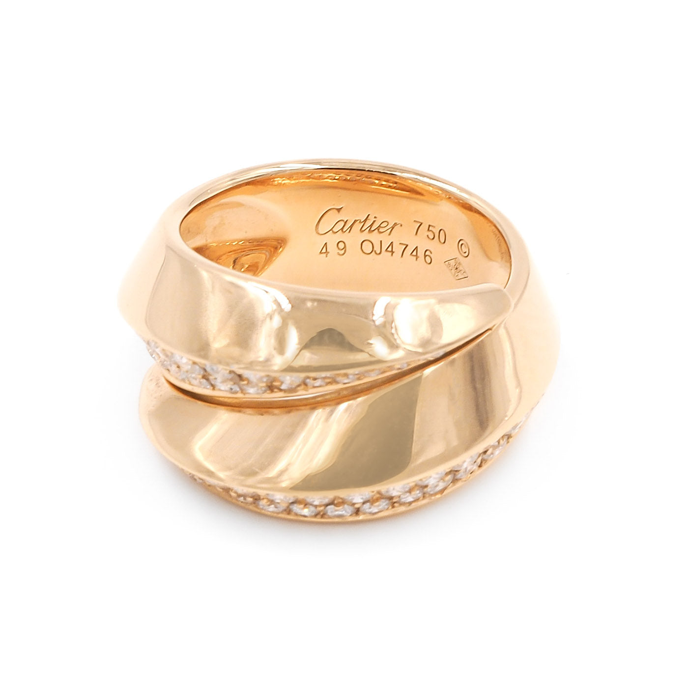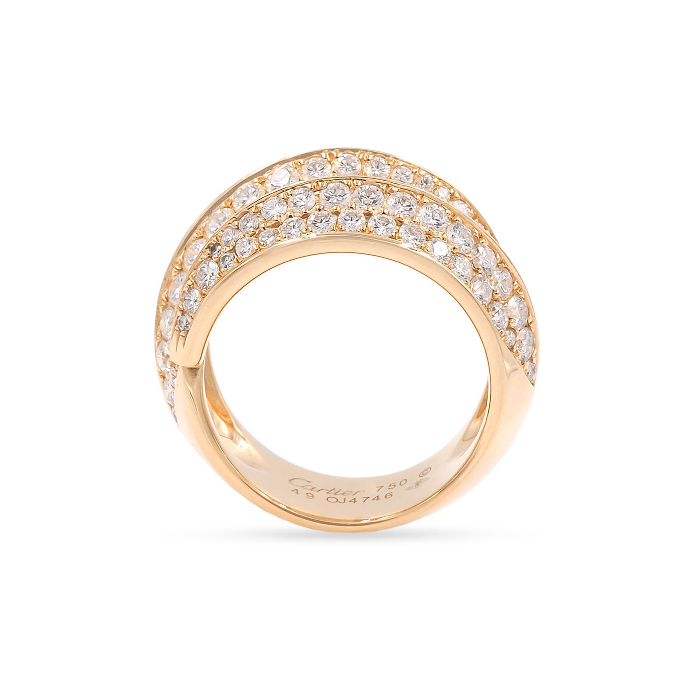 French ‘Panthère Griffe’ Diamond Ring by Cartier, composed of 18k yellow gold. With 62 Round Brilliant Cut diamonds weighing approximately 1.25 carats in total set into sides of the ring that have a twisted look to them. The ring measures approximately 12.8 mm wide and weighs 10.4 grams. Fits like size 5, and stamped for EU ’49’. Stamped for ‘Cartier’ and ‘2015’; French origin; comes with a certificate of authenticity and Cartier box. Circa 2015.