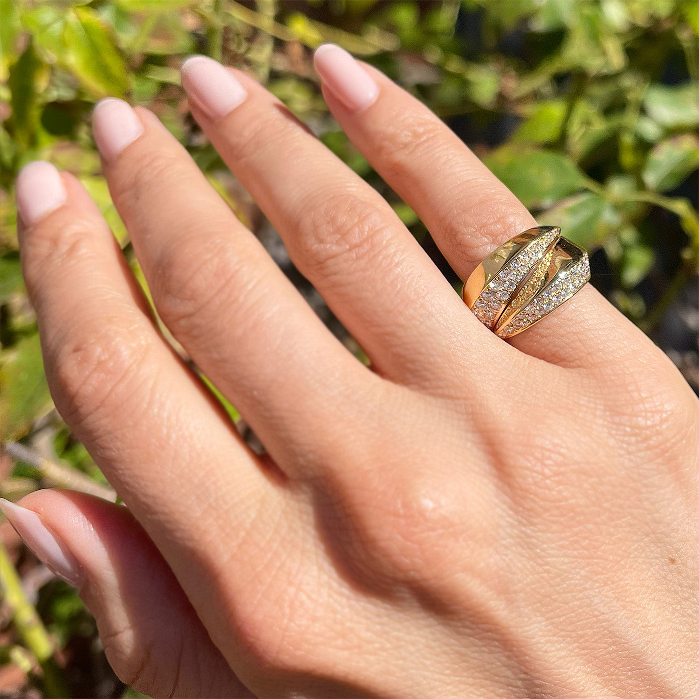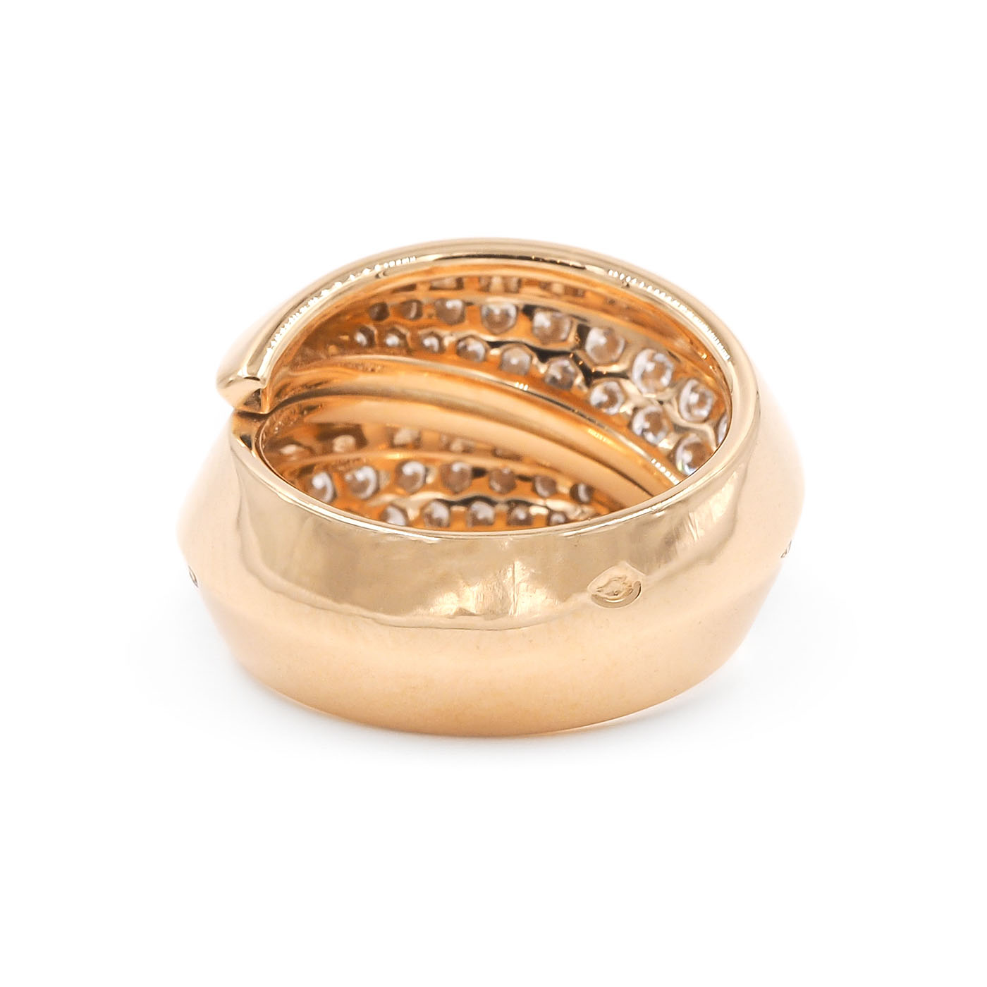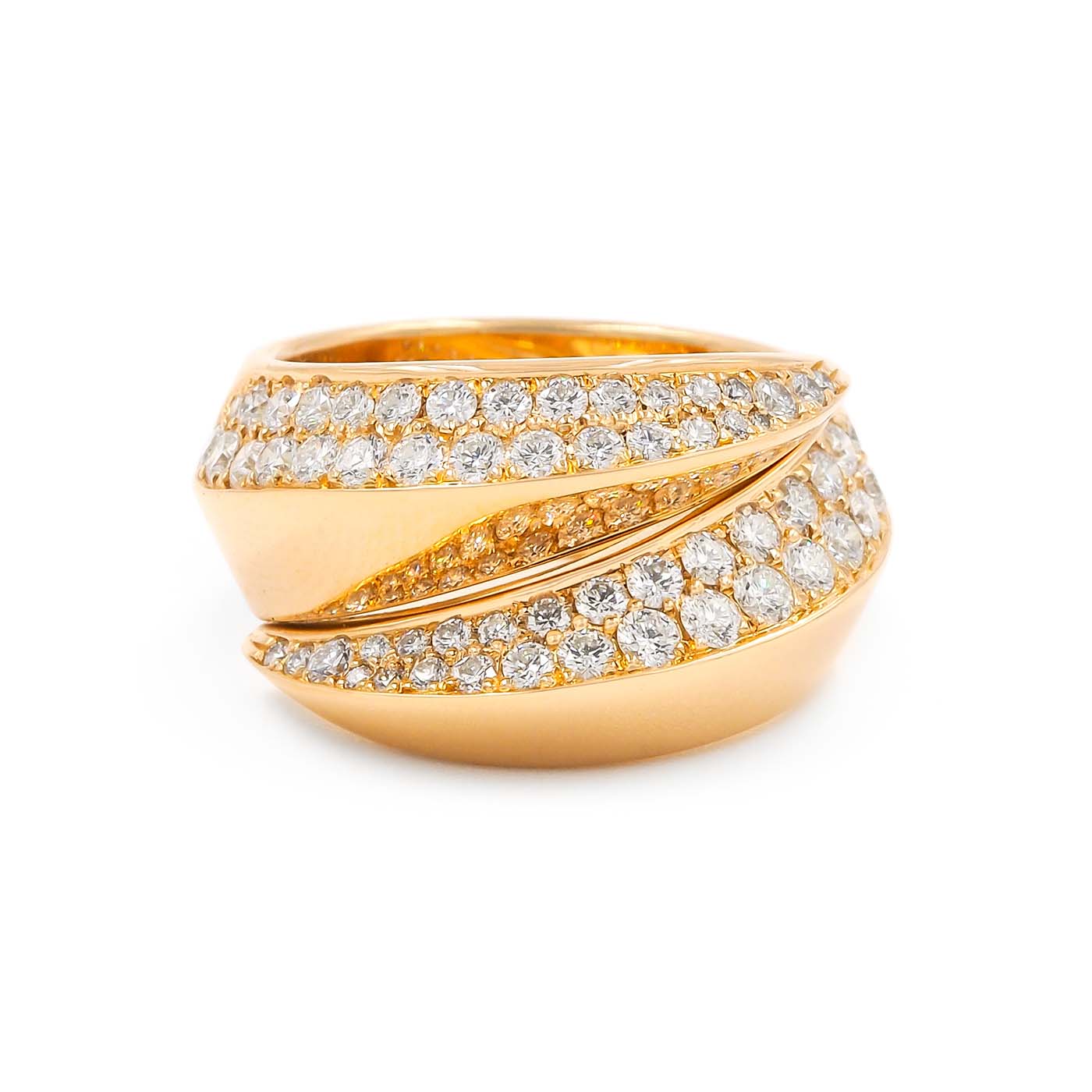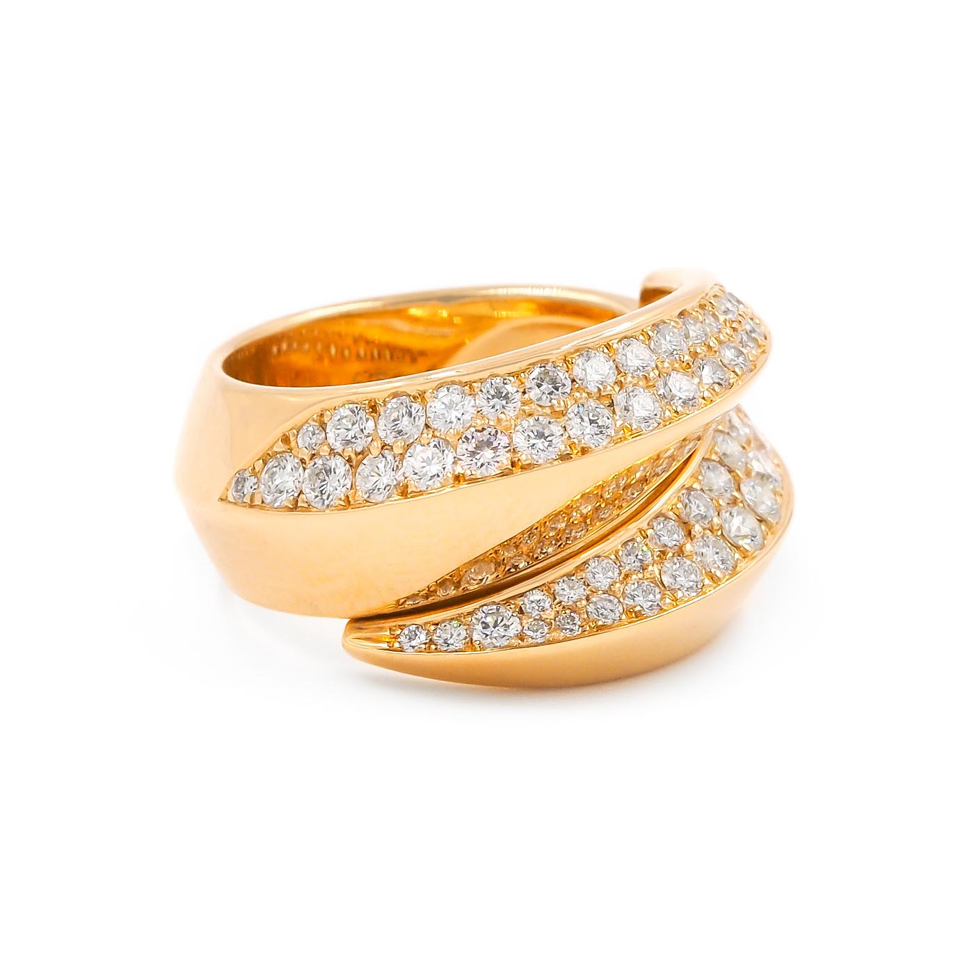 French ‘Panthère Griffe’ Diamond Ring by Cartier, composed of 18k yellow gold. With 62 Round Brilliant Cut diamonds weighing approximately 1.25 carats in total set into sides of the ring that have a twisted look to them. The ring measures approximately 12.8 mm wide and weighs 10.4 grams. Fits like size 5, and stamped for EU ’49’. Stamped for ‘Cartier’ and ‘2015’; French origin; comes with a certificate of authenticity and Cartier box. Circa 2015.