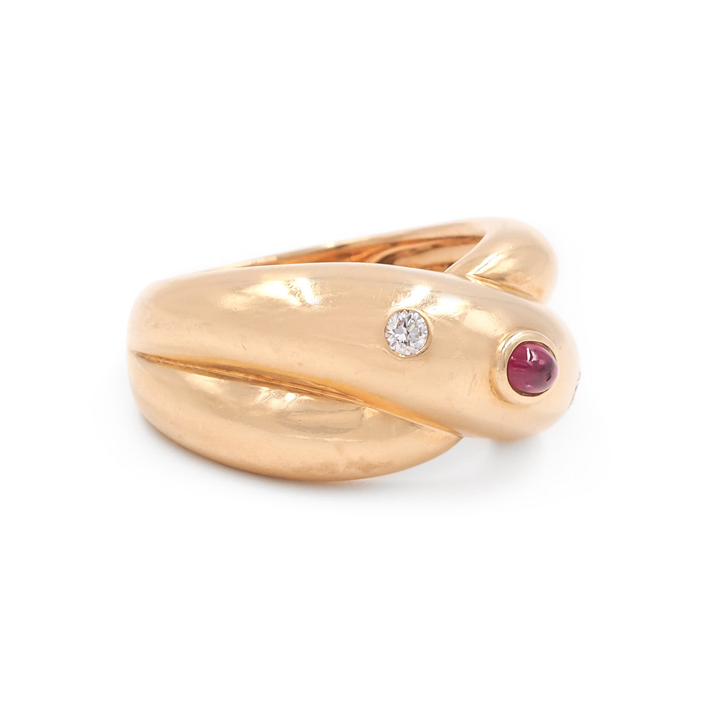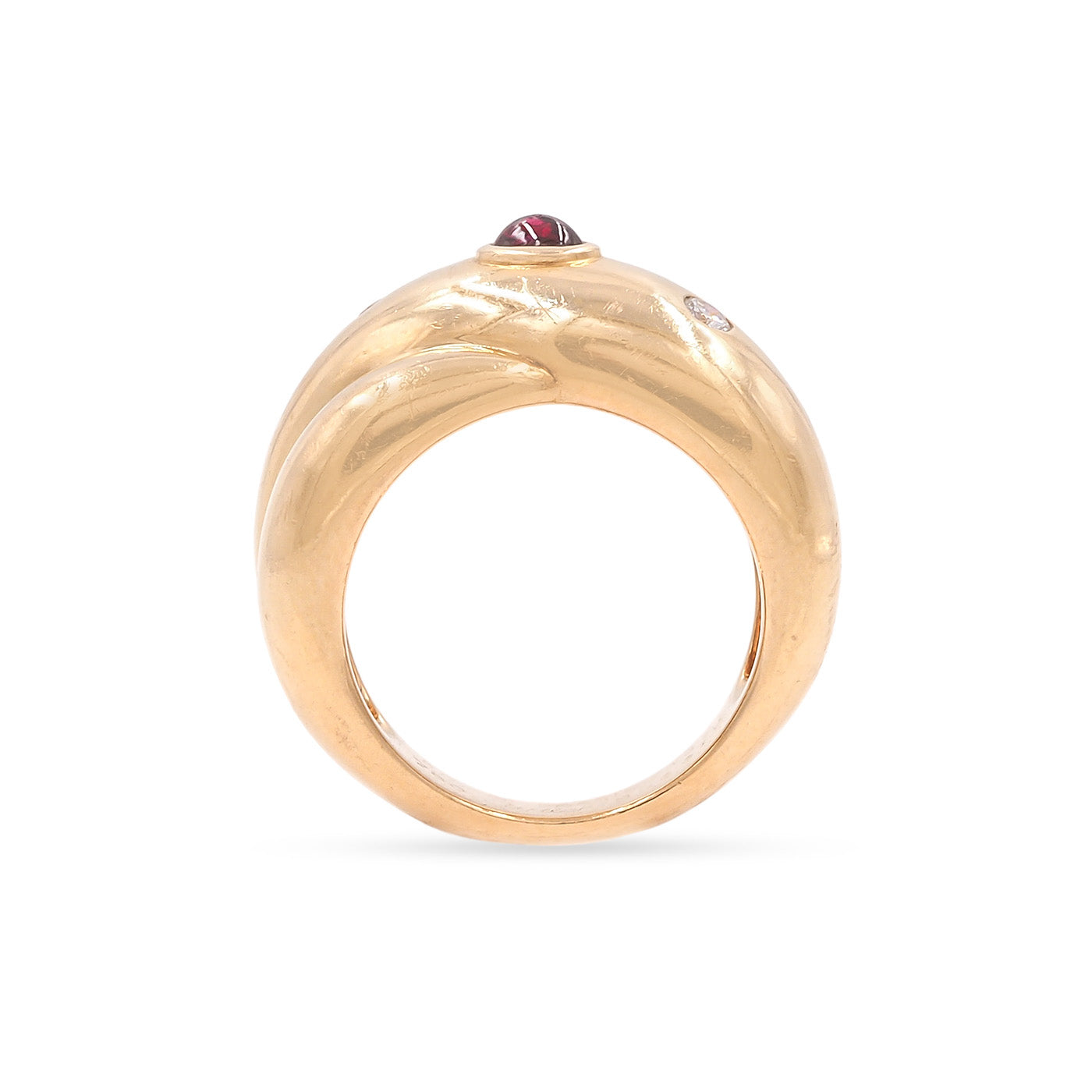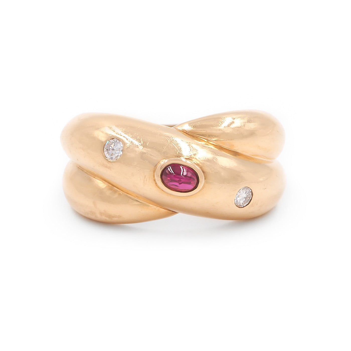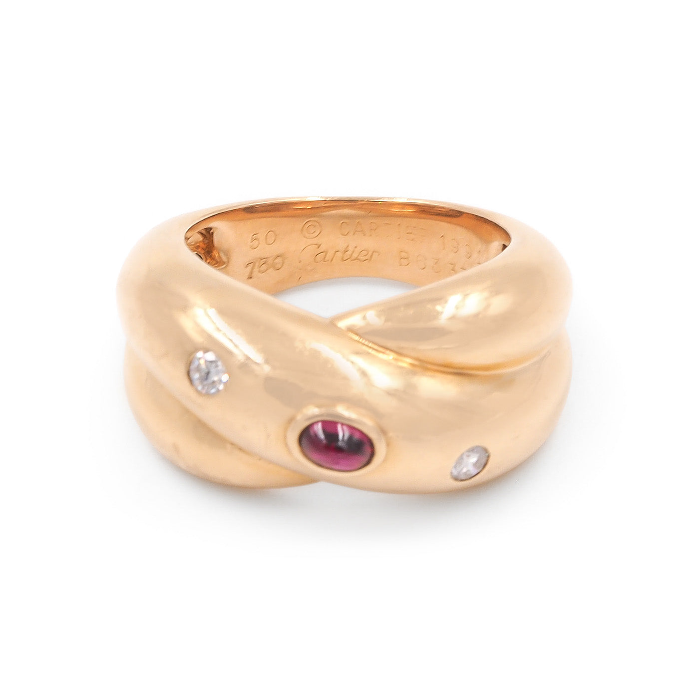 French Vintage ‘Trinity Constellation’ Ring by Cartier, composed of 18k yellow gold. With a central oval ruby cabochon and 2 Round Brilliant Cut diamonds. The ring measures approximately 22.4 mm wide at the front and weighs 14.2 grams; fits like a size 5.5-5.75 approximately. Hallmarked for French origin, stamped & signed ‘Cartier’, ‘1992’, & ’50’ (for the ring’s size); also with a serial number. Circa 1992.