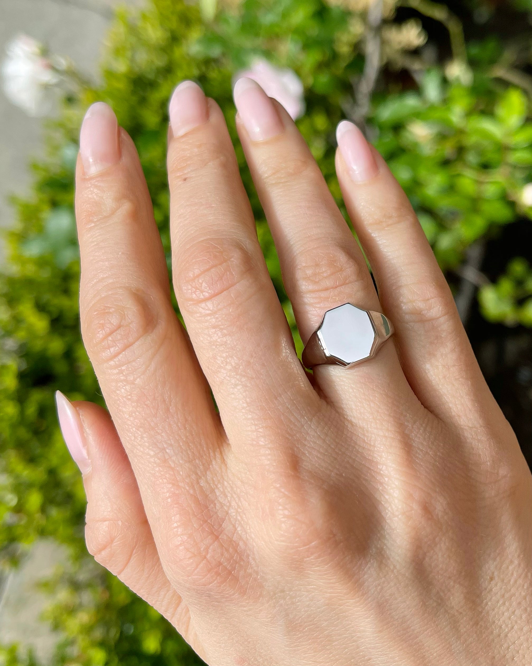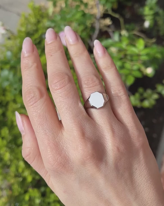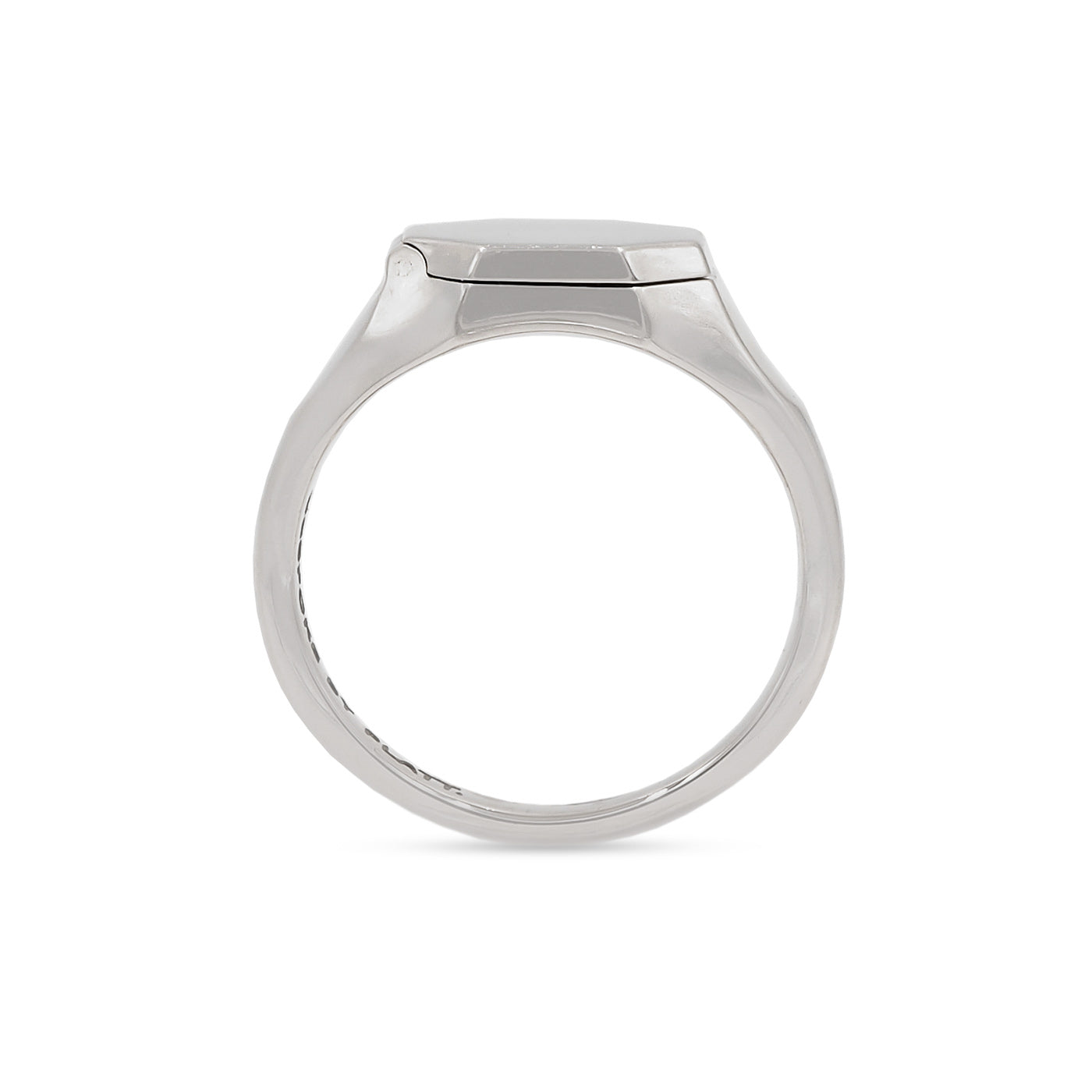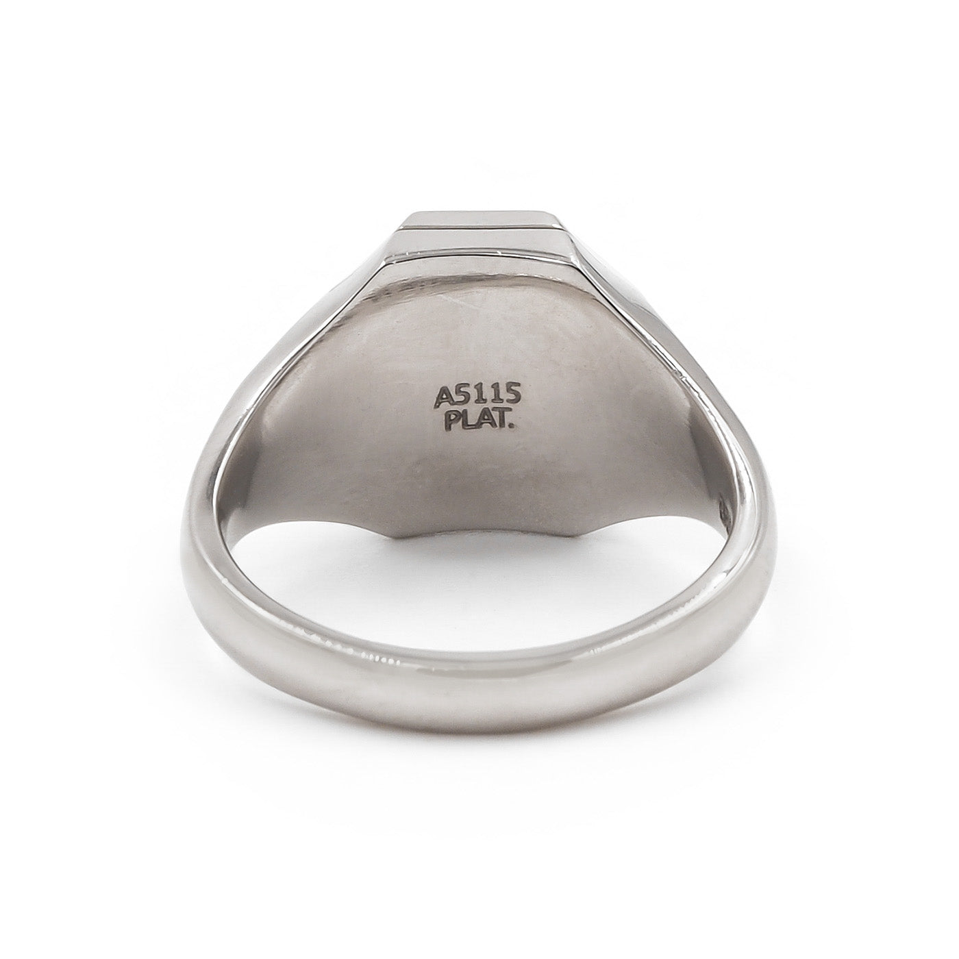 American Platinum Locket Signet Ring from Bespoke by Platt. With a locket compartment under the top of the ring, with space to allow for a small photo or keepsake; the locket snaps closed securely. The octagonal face of the ring measures approximately 11.7 mm tall measures by 11.2 mm wide; weighs 12.8 grams. American origin.