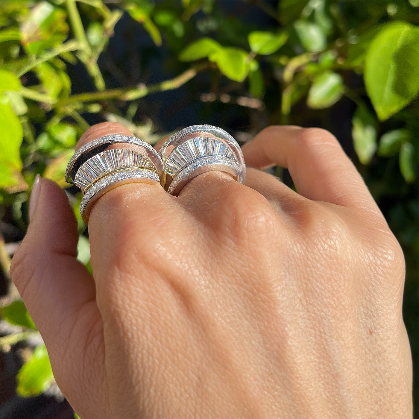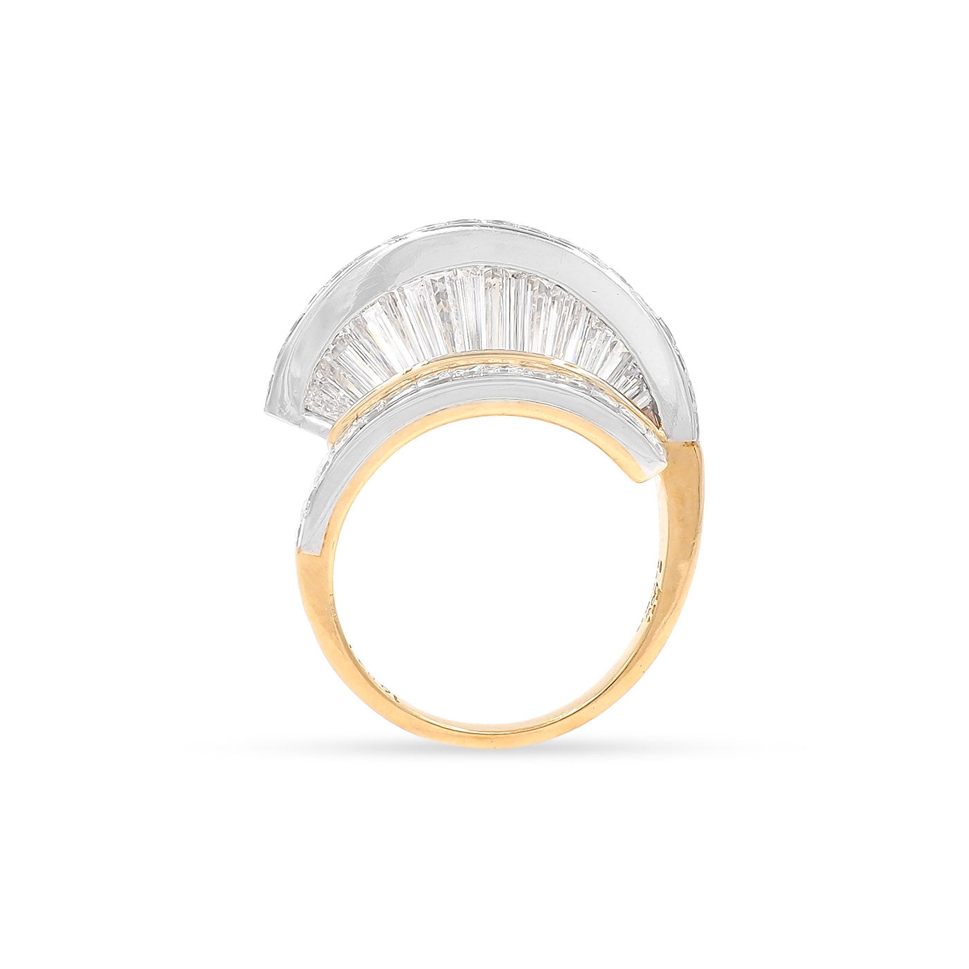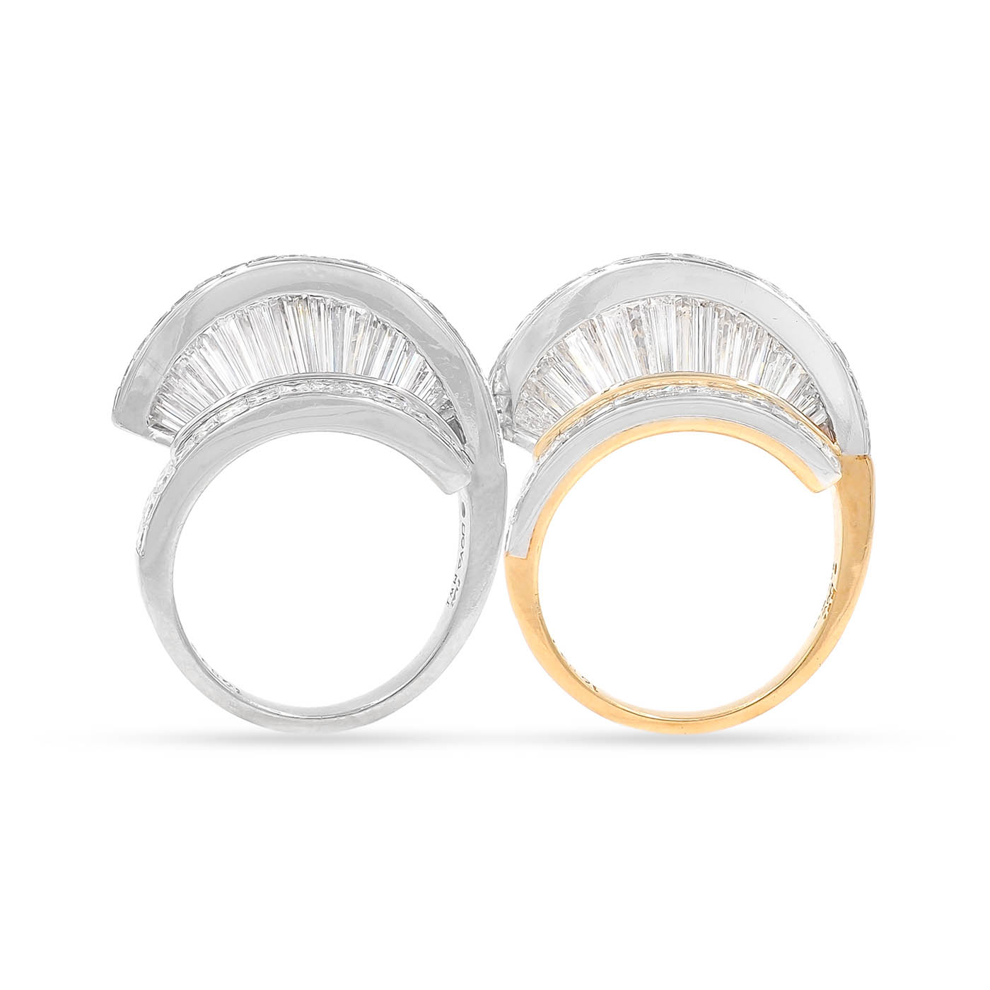 Vintage 8.00 Ctw. Baguette Cut & Princess Cut Diamond 'Fan' Ring Set by MWI ELOQUENCE. With one ring being composed of platinum and the other of platinum and 18k yellow gold. These two rings are being sold together as a set. Each ring has 54 diamonds, a combination of Baguette Cut, Tapered Baguette Cut, and Princess Cut diamonds, weighing approximately 4.00 carats in total per ring. All diamonds have colors estimated to range F-G and clarities estimated to range VS1-VS2. The diamonds are arranged in a vertical 'fan' type of motif, with the Baguette Cut and Tapered Baguette Cut diamonds standing vertically, with a row of Princess Cut diamonds above and below. Rings measure approximately 12 mm tall off the finger, and when stacked together look similar to a domed bombe ring. The all-platinum ring weighs 12.7 grams and the platinum/18k yellow gold ring weighs 9.6 grams. With an 'MWI' jewelry stamp. Circa 1980's-1990's.