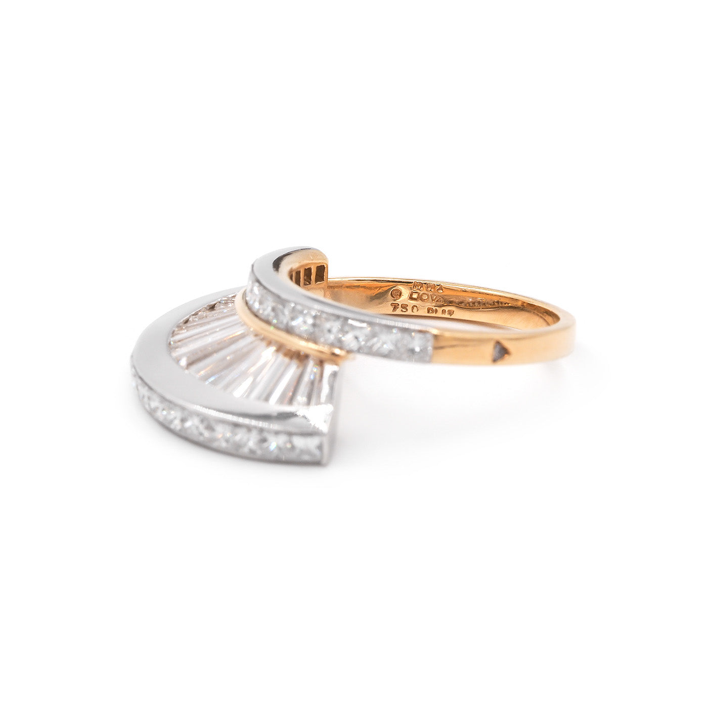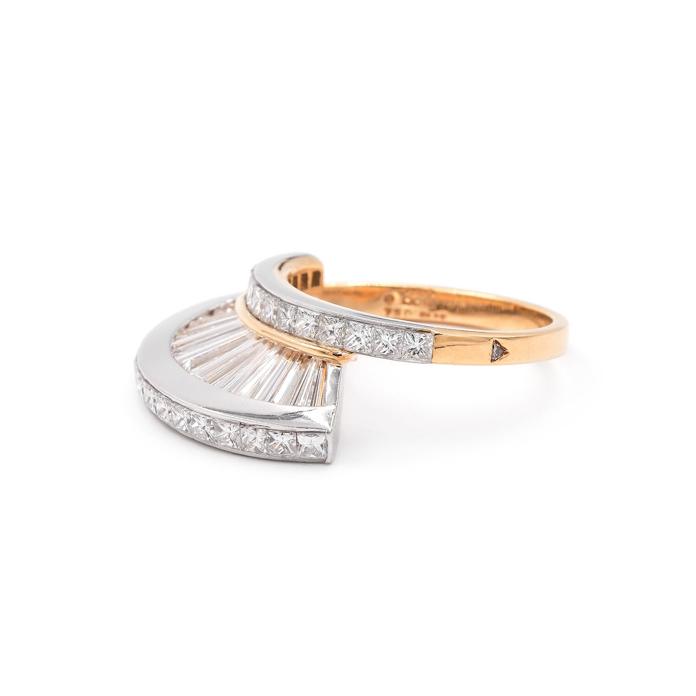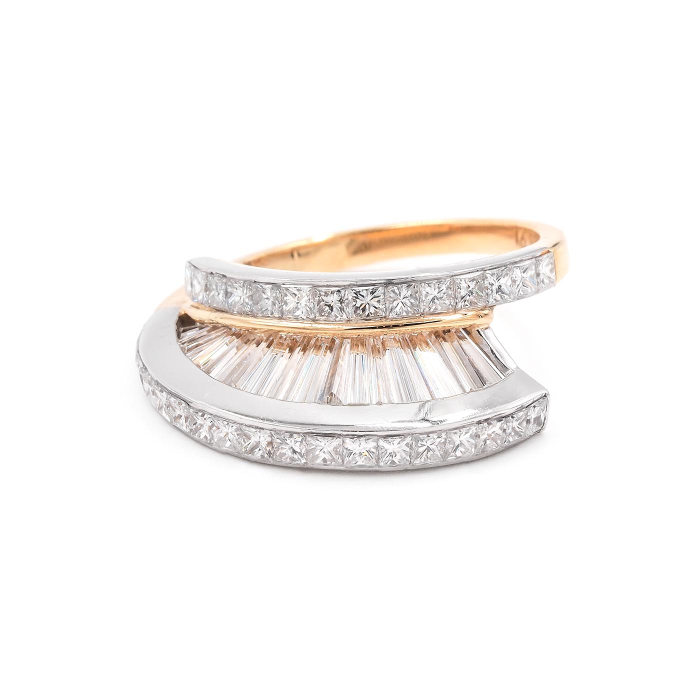 Vintage 8.00 Ctw. Baguette Cut & Princess Cut Diamond 'Fan' Ring Set by MWI ELOQUENCE. With one ring being composed of platinum and the other of platinum and 18k yellow gold. These two rings are being sold together as a set. Each ring has 54 diamonds, a combination of Baguette Cut, Tapered Baguette Cut, and Princess Cut diamonds, weighing approximately 4.00 carats in total per ring. All diamonds have colors estimated to range F-G and clarities estimated to range VS1-VS2. The diamonds are arranged in a vertical 'fan' type of motif, with the Baguette Cut and Tapered Baguette Cut diamonds standing vertically, with a row of Princess Cut diamonds above and below. Rings measure approximately 12 mm tall off the finger, and when stacked together look similar to a domed bombe ring. The all-platinum ring weighs 12.7 grams and the platinum/18k yellow gold ring weighs 9.6 grams. With an 'MWI' jewelry stamp. Circa 1980's-1990's.