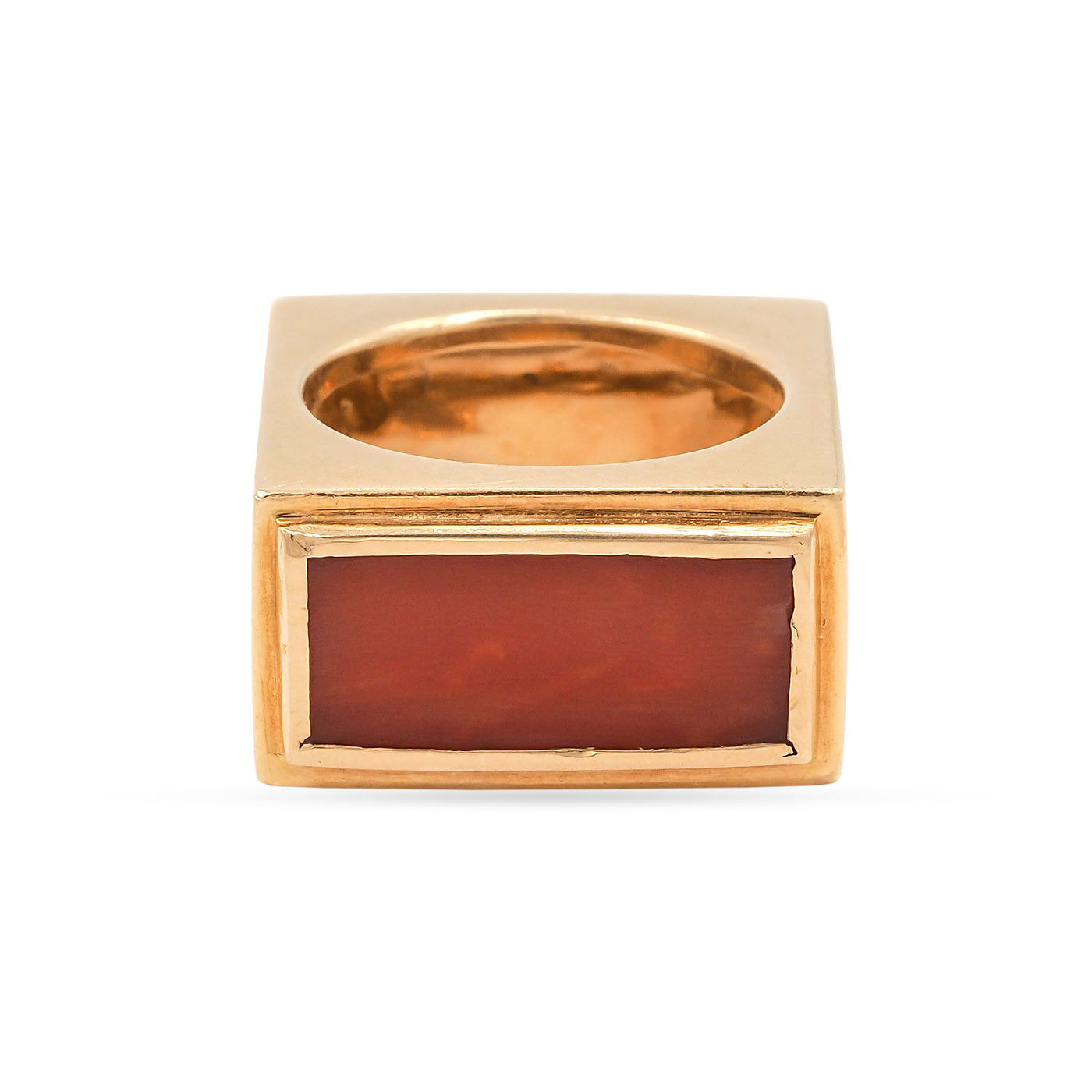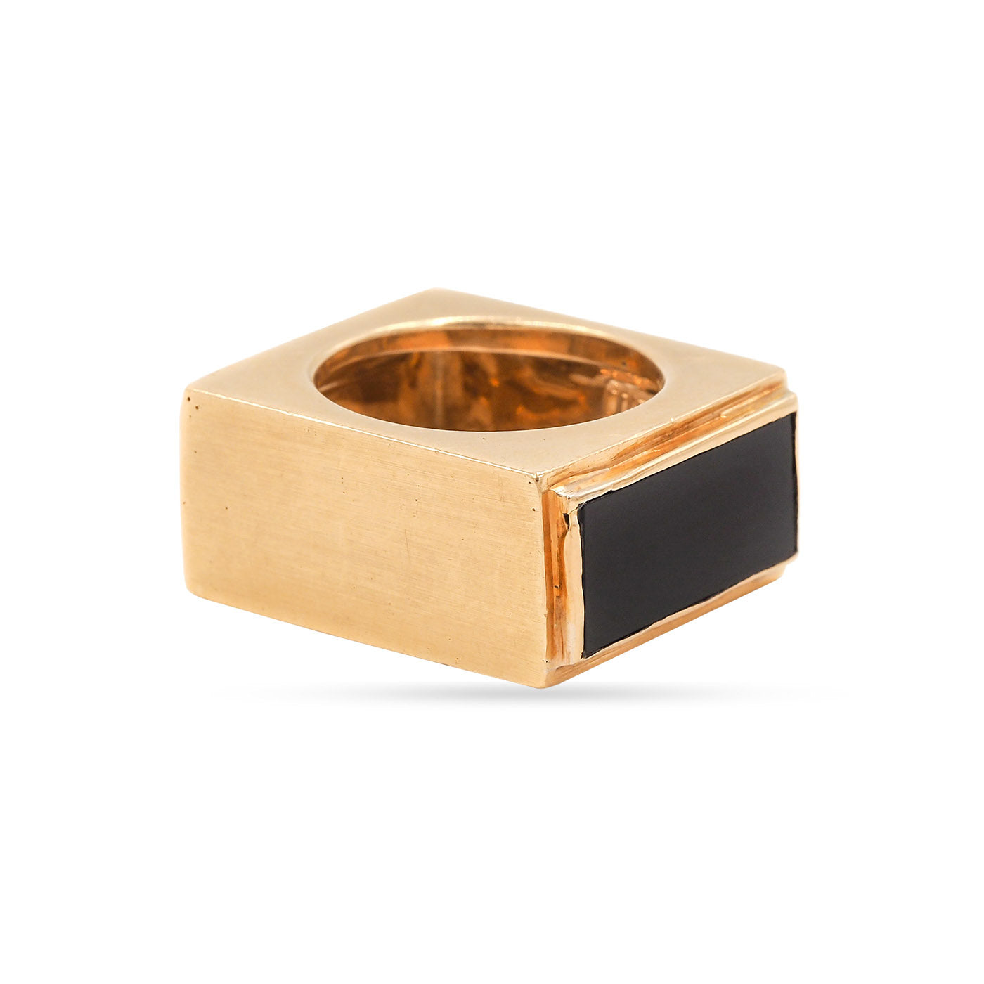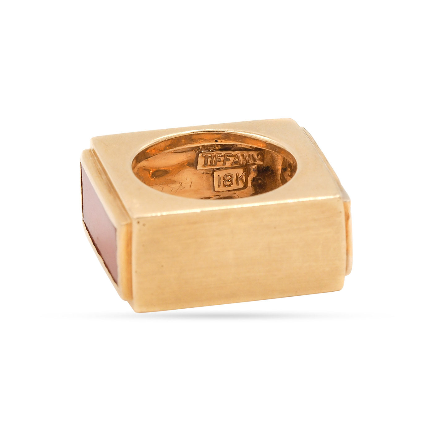 Vintage Coral & Black Jade Square Ring from Tiffany & Co. (attributed to Donald Claflin), composed of 18k yellow gold. Featuring inlaid red coral on one of the 4 rectangular sides and inlaid black jade on the opposite side. The ring has a square shape to it, The ring measures approximately 10.5 mm wide; weighs 16.6 grams. Stamped for 'Tiffany'. Circa 1970's.