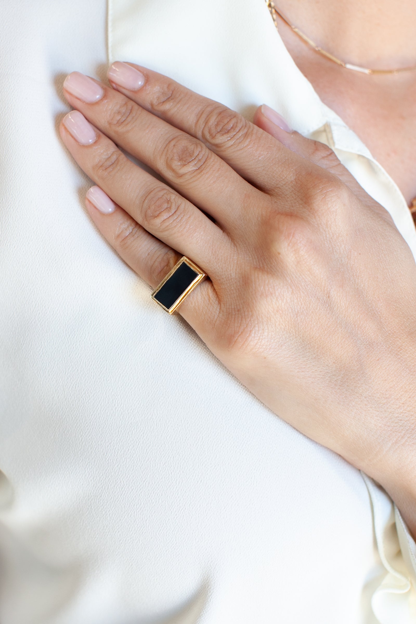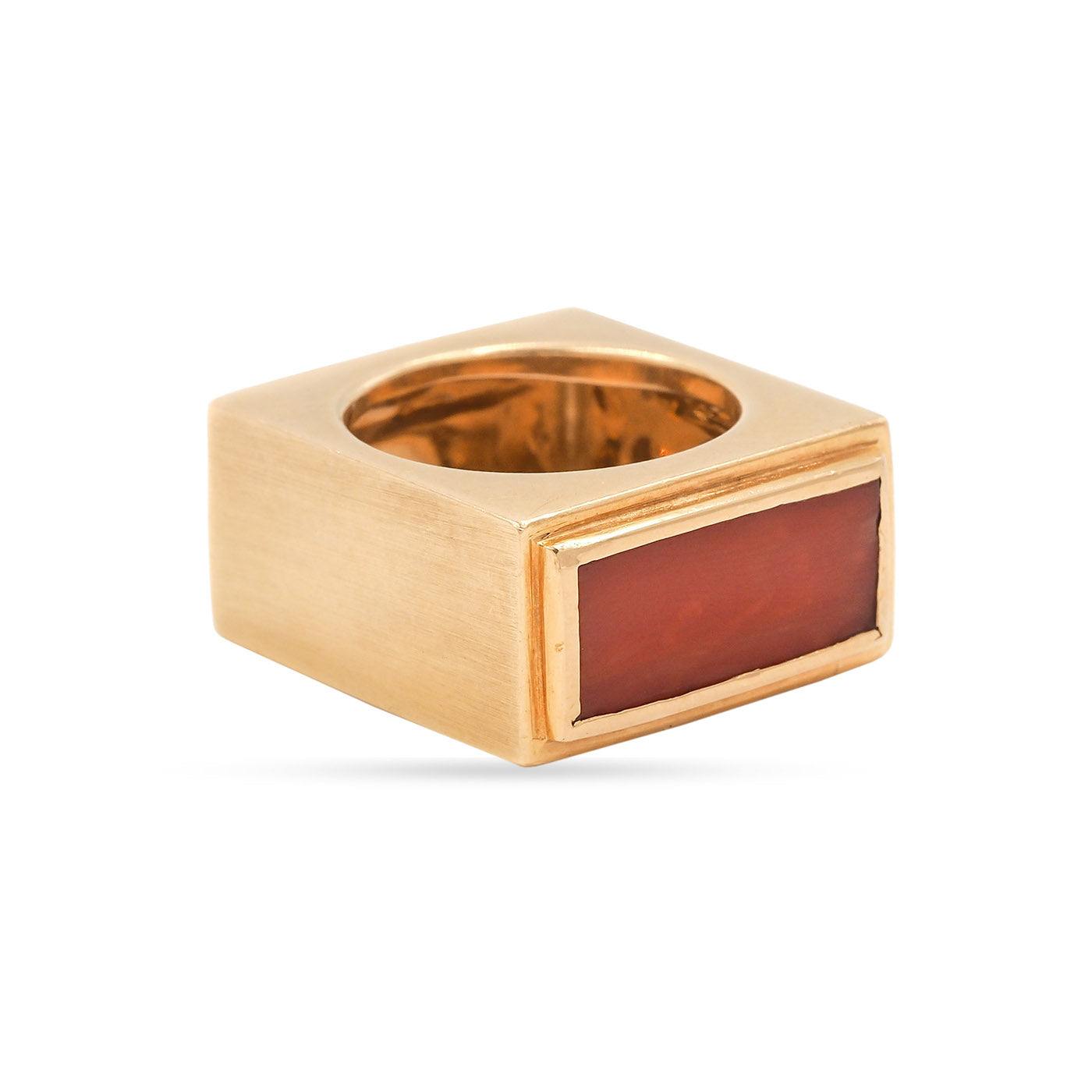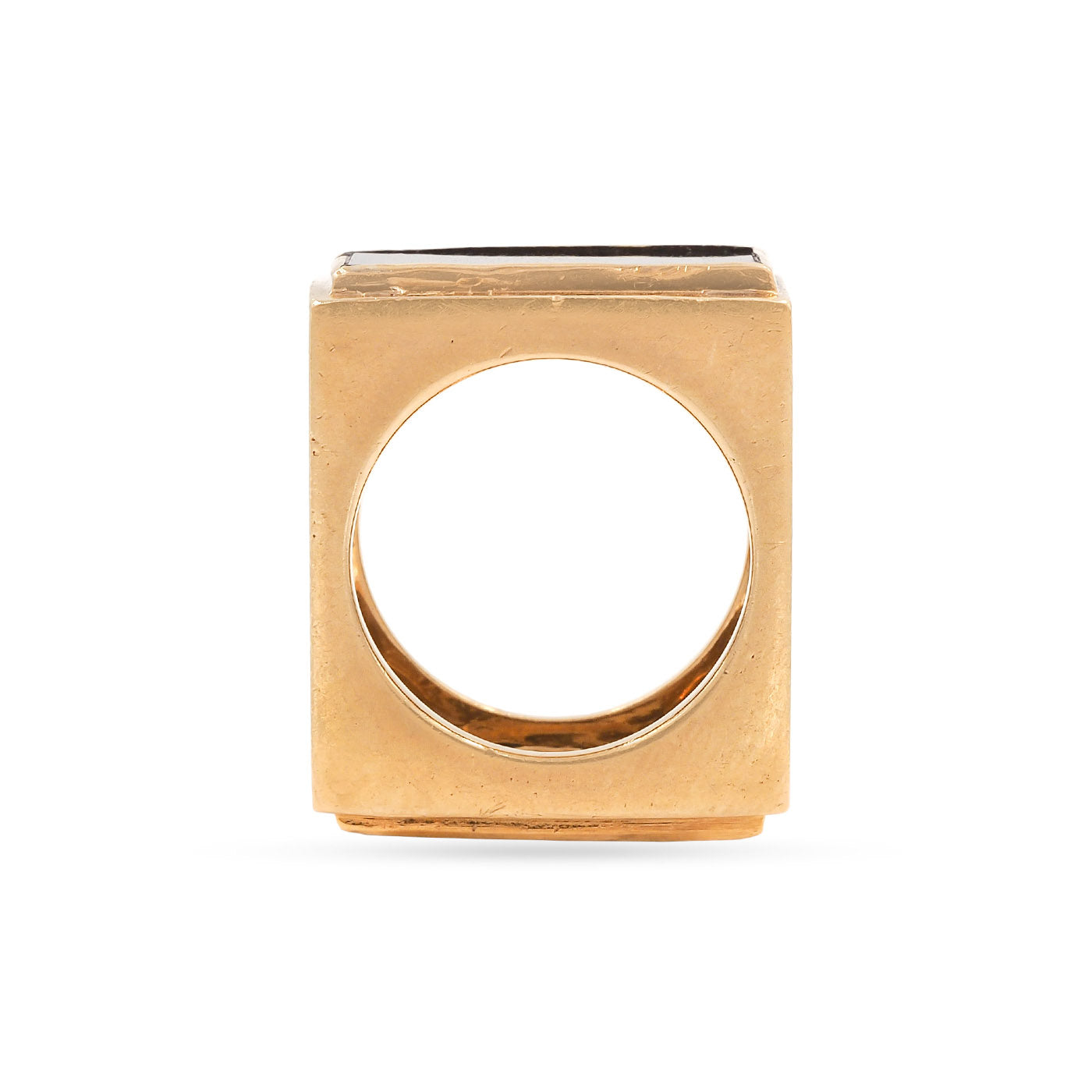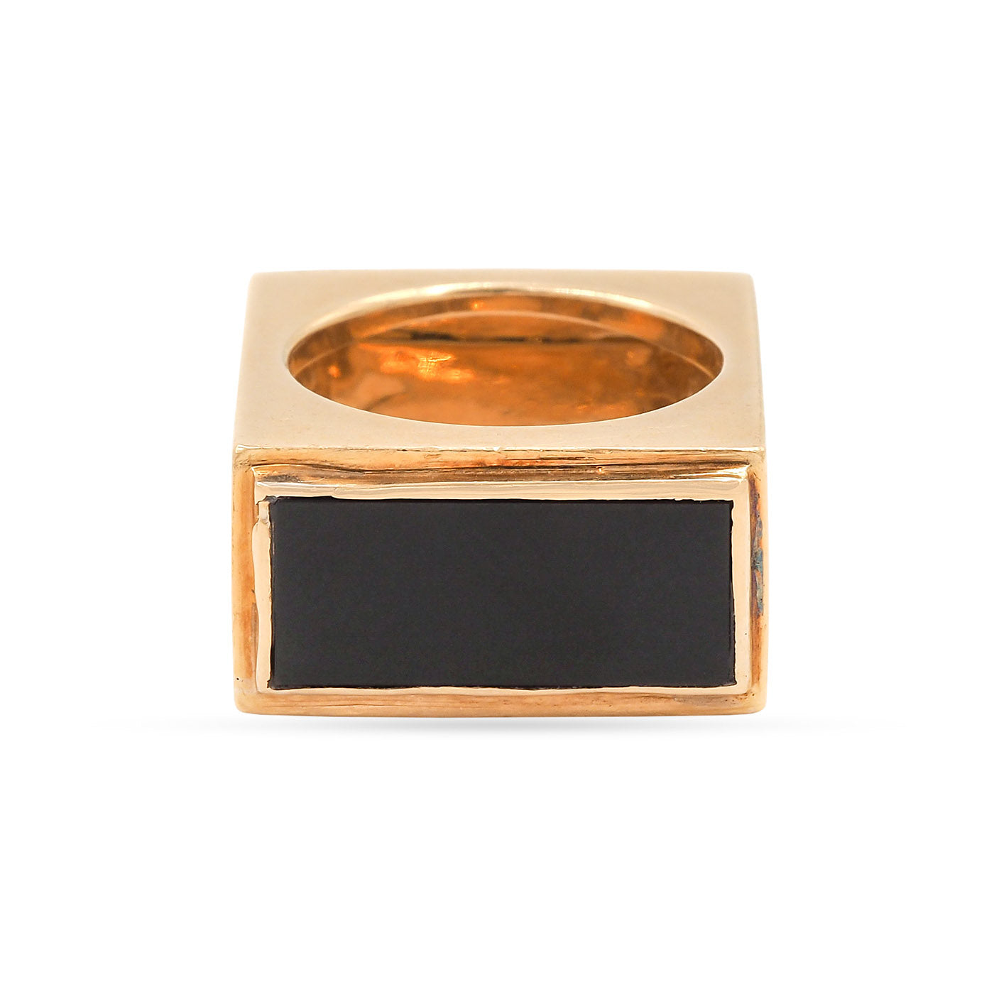 Vintage Coral & Black Jade Square Ring from Tiffany & Co. (attributed to Donald Claflin), composed of 18k yellow gold. Featuring inlaid red coral on one of the 4 rectangular sides and inlaid black jade on the opposite side. The ring has a square shape to it, The ring measures approximately 10.5 mm wide; weighs 16.6 grams. Stamped for 'Tiffany'. Circa 1970's.