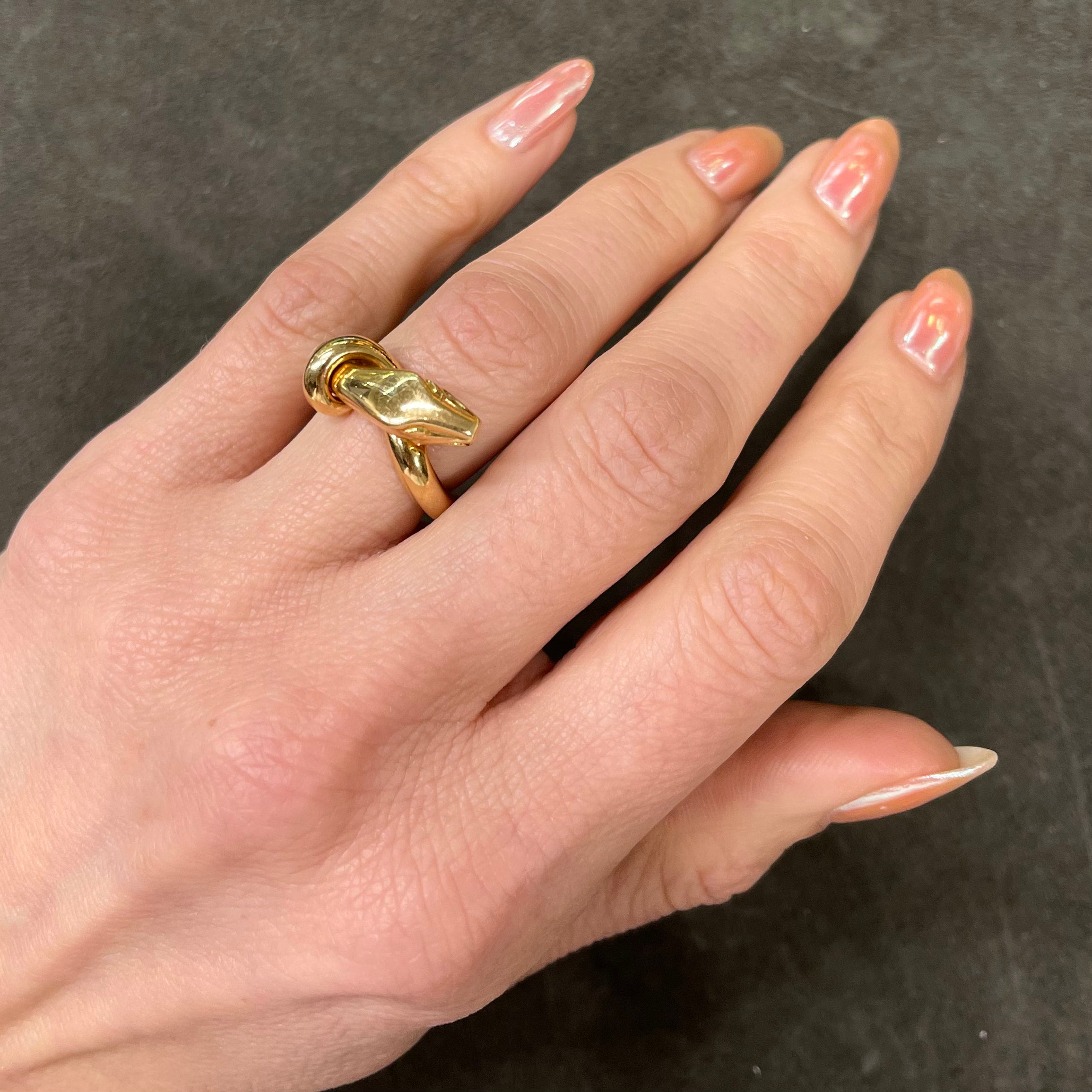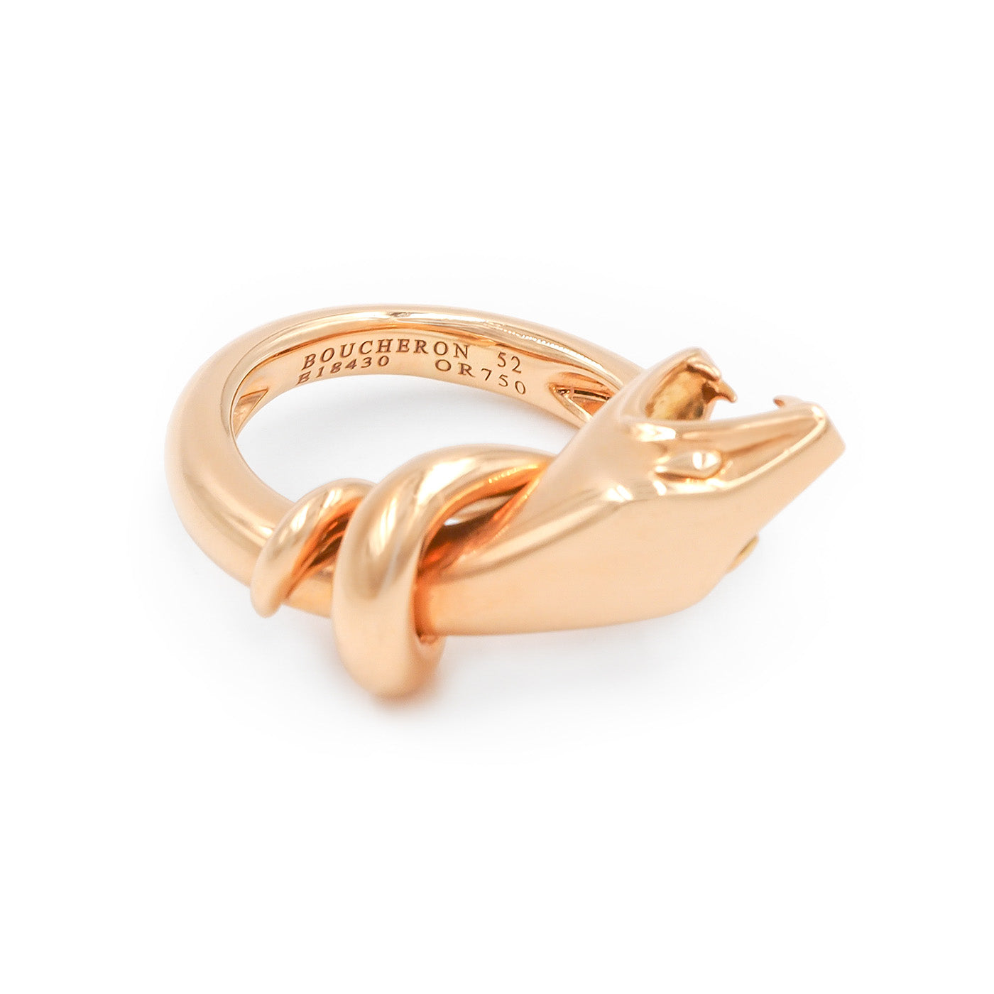 French Vintage Serpent 'Kaa' Ring from Boucheron, composed of 18k yellow gold. The snake is depicted with its mouth open, and coils once around the finger. The ring weighs 10.95 grams. Stamped with the serial numbers, 'Boucheron', & '52' indicating the size; French origin. Circa 2000's.