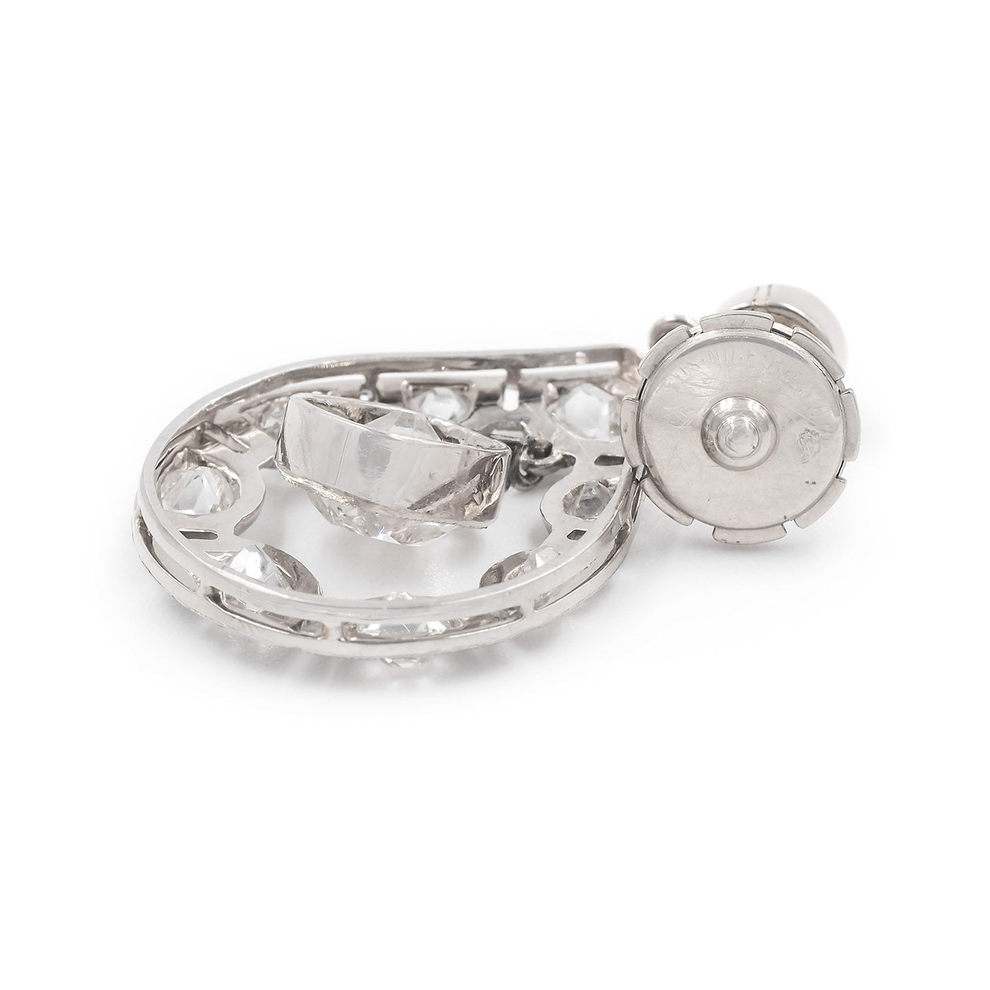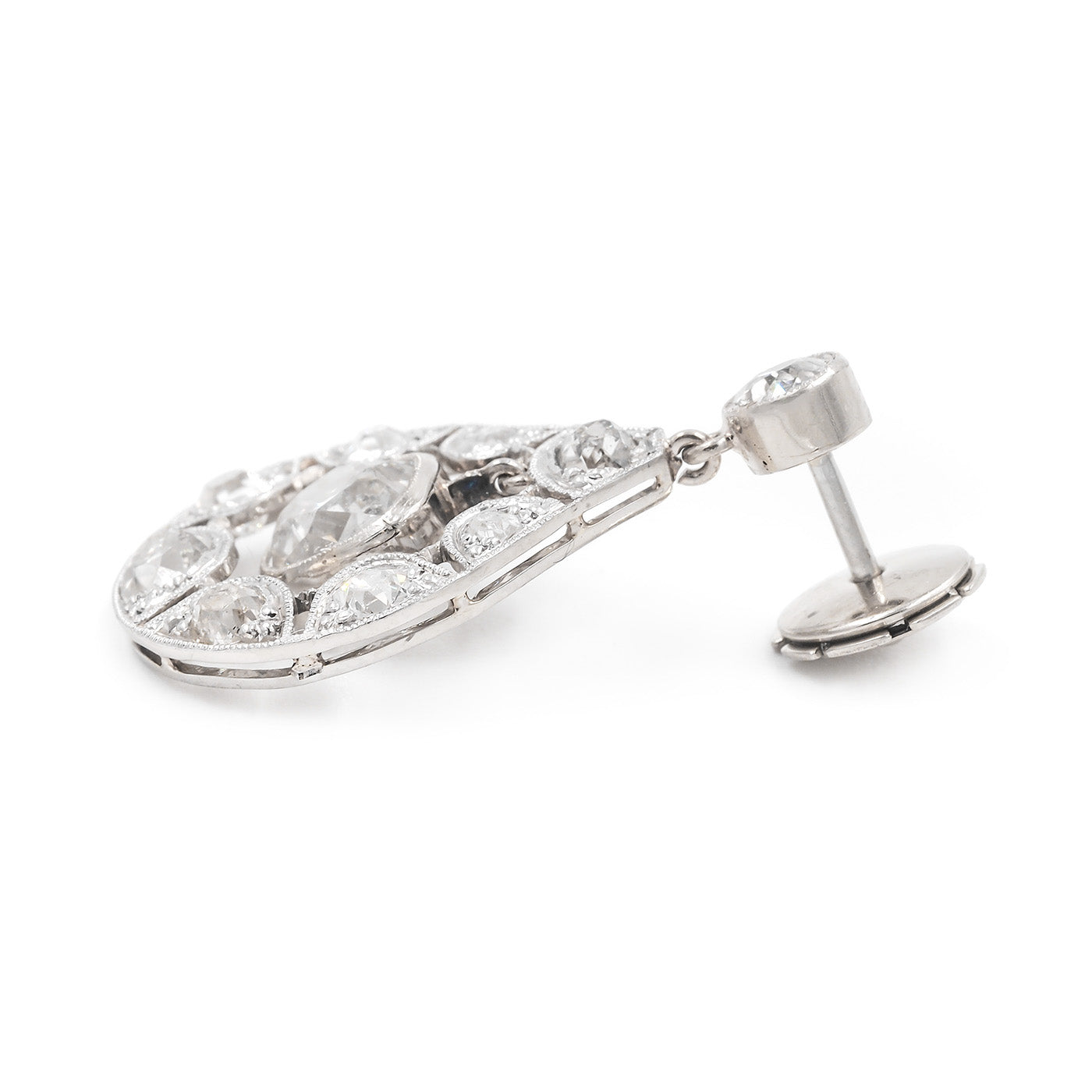 French Art Deco 2.35 Ctw. Old Mine Cut Diamond Geometric Drop Earrings composed of 18k white gold. These earrings are PGS certified; set with 2 Old Mine Cut diamonds at the centers weighing approximately 2.35 carats in total, estimated to be 1.20 carats and 1.15 carats and have J-K colors and SI1-SI2 clarities. With an additional 18 accent Old Mine Cut diamonds, weighing approximately 2.55 carats in total, estimated to have J-K colors and VS-SI clarities. Earrings measure approximately 1 1/8″ tall by 5/8″ wide; weigh 7.42 grams in total. With post backs. Hallmarked for French origin. Circa 1925.
