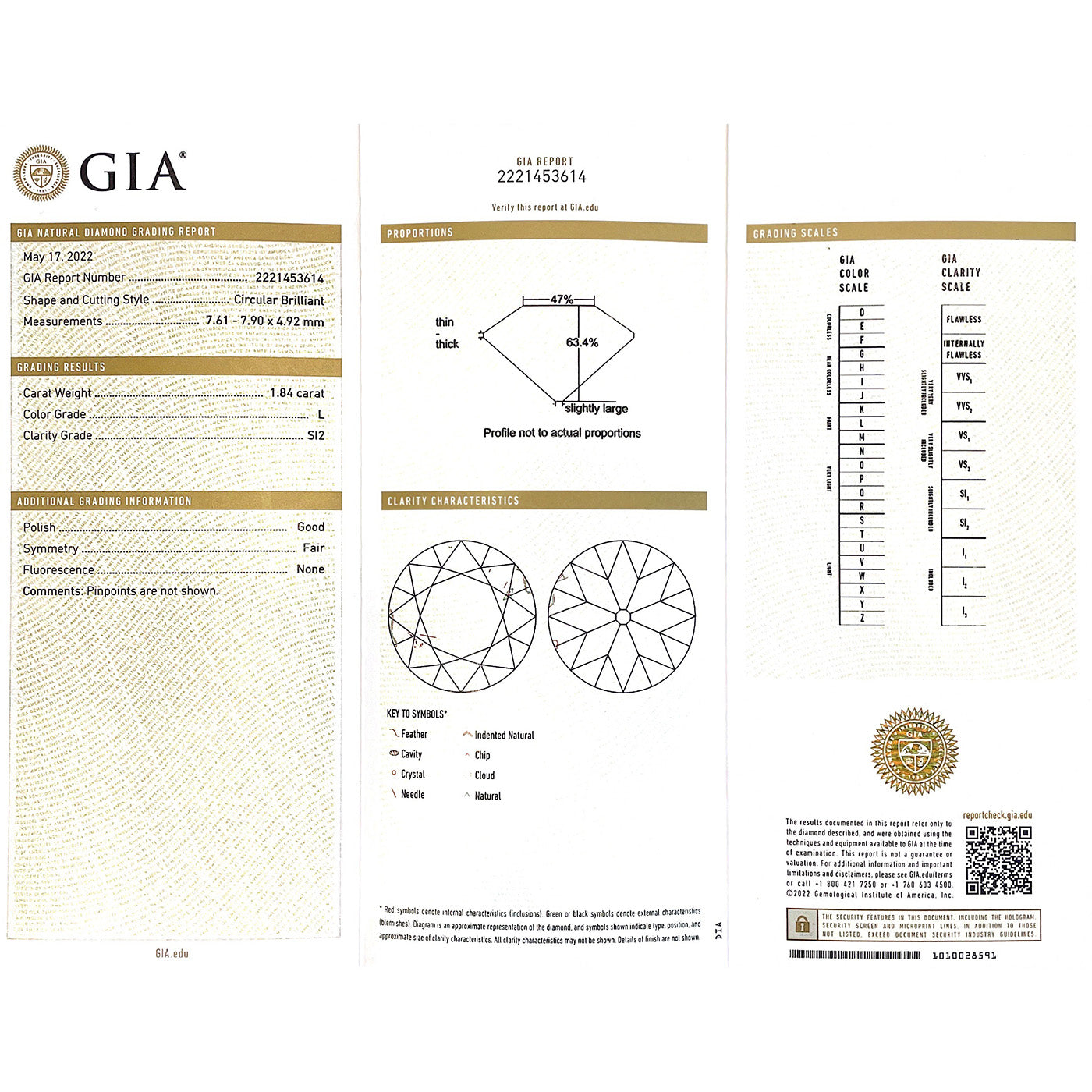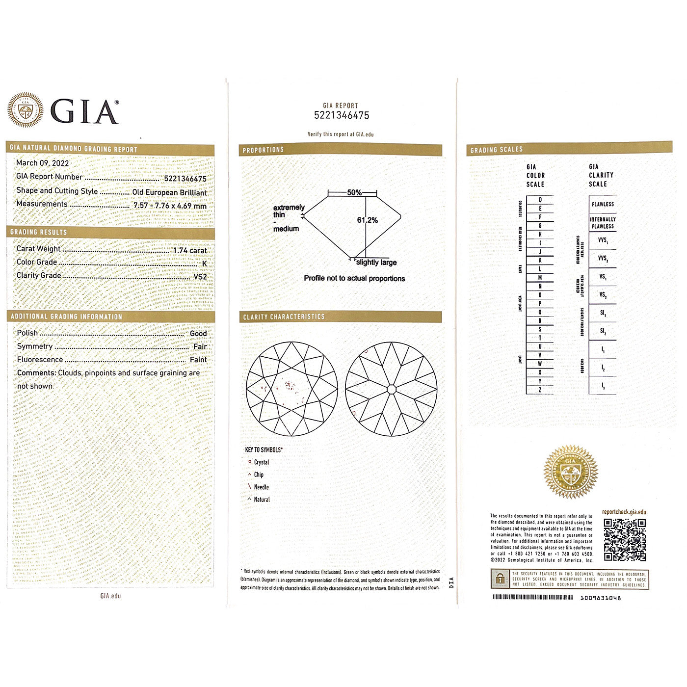 Stones: 1.84 Ct. Old European Cut Diamond (GIA certified L color/SI2 clarity, see photo), 1.74 Ct. Old European Cut Diamond (GIA certified K color/VS2 clarity, see photo)