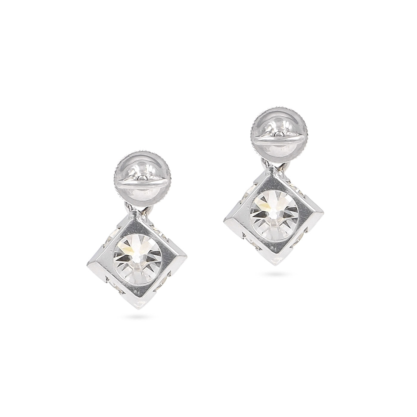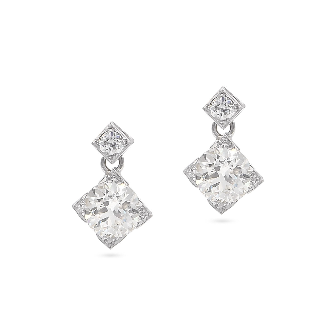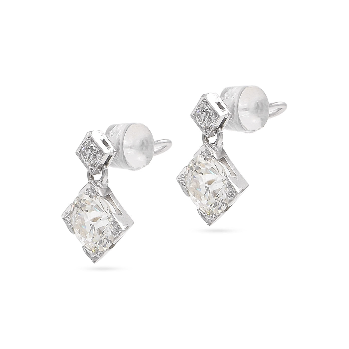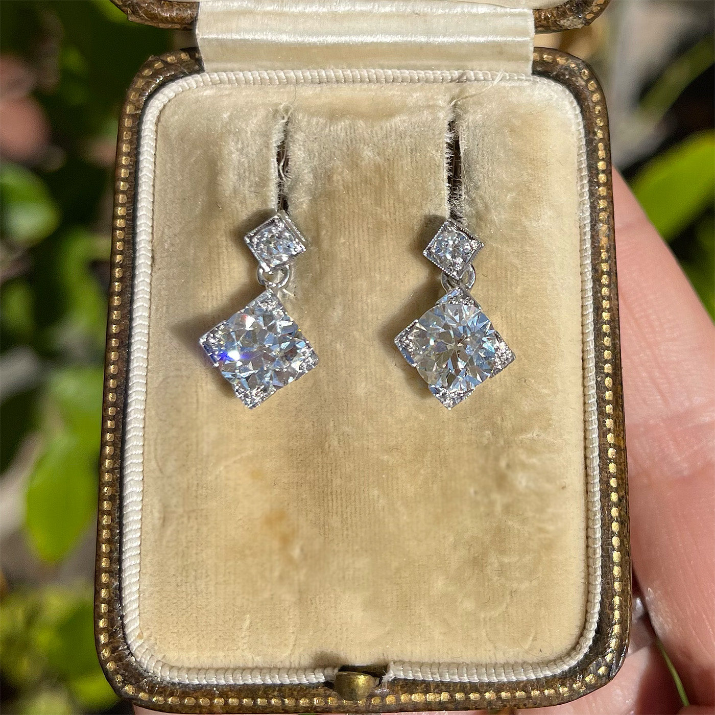 Art Deco era 3.58 Ctw. Old European Cut Diamond Earrings composed of platinum. Set with four diamonds – the two larger Old European Cut diamonds are GIA certified, one is 1.84 carats with L color/SI2 clarity and the other is 1.74 carats with K color/VS2 clarity. The two top diamonds are also Old European Cut diamonds and have a combined weight of 0.30 carats. The diamonds are set into angled, square-shaped geometric settings, with the lower two diamonds swinging from the top two. Earrings measure approximately 17.1 mm tall by 10.8 mm wide and weigh 5 grams in total, with screw-on post backs. Circa 1925.