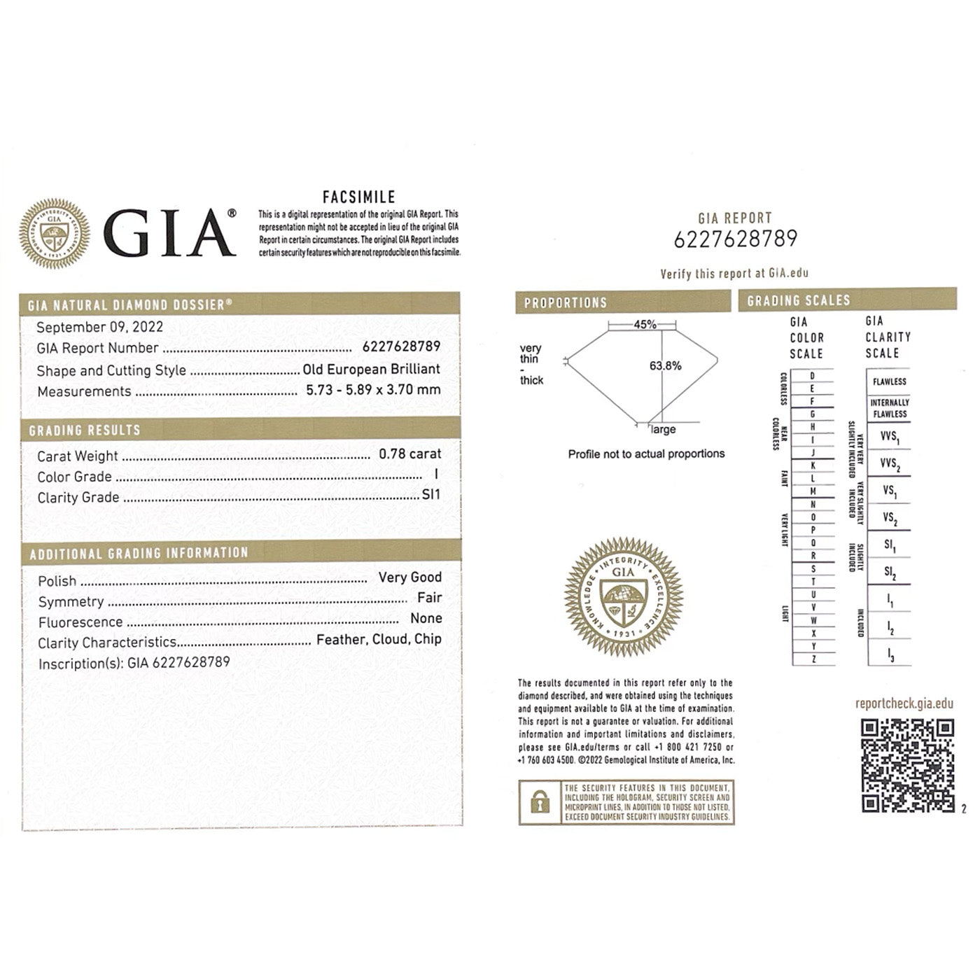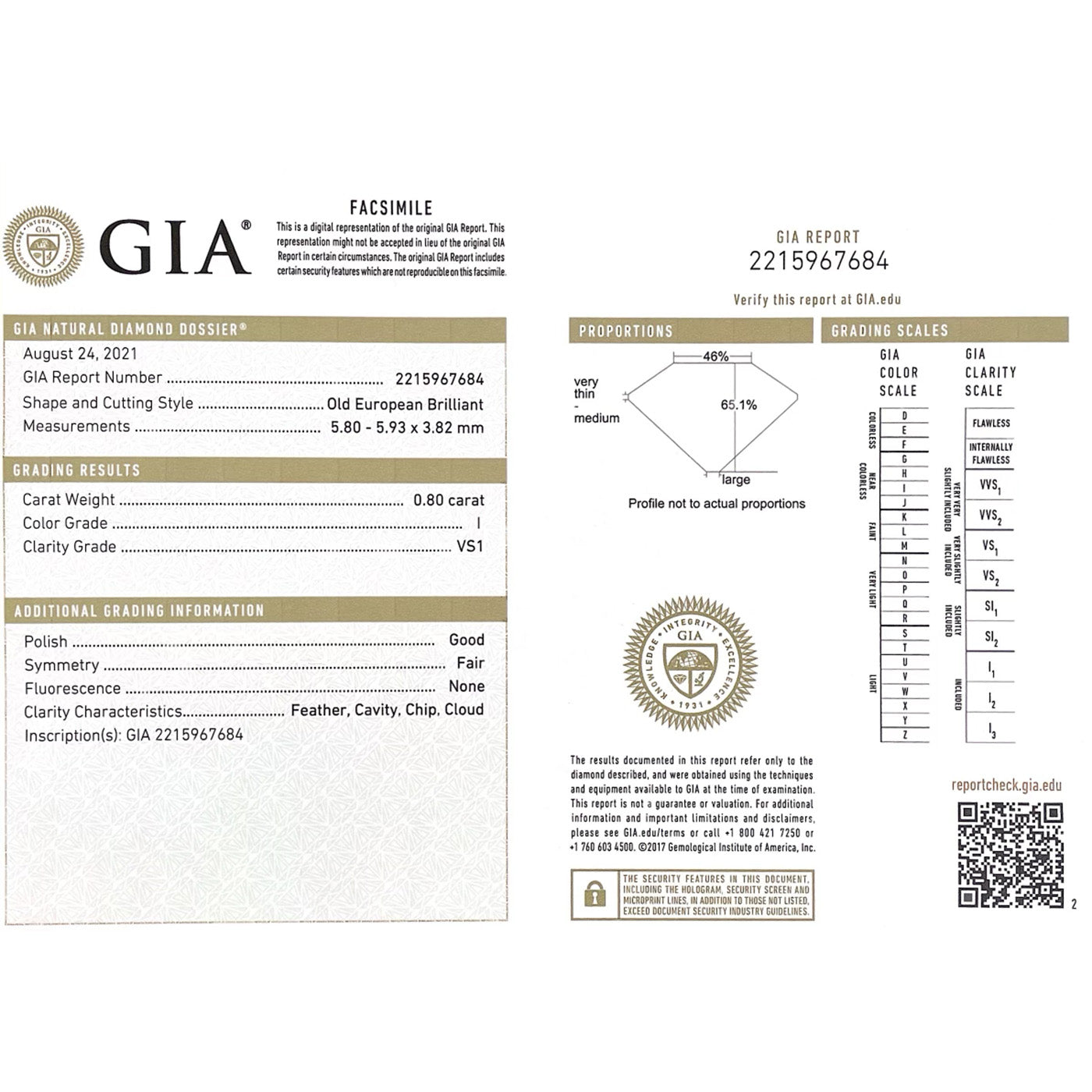 Stones: 0.80 Ct. Old European Cut Diamond (GIA certified I color/VS1 clarity, see photo); 0.78 Ct. Old European Cut Diamond (GIA certified I color/SI1 clarity, see photo); Old Mine Cut Diamonds; Rose Cut Diamonds
