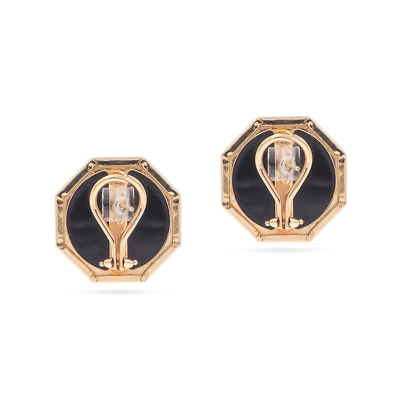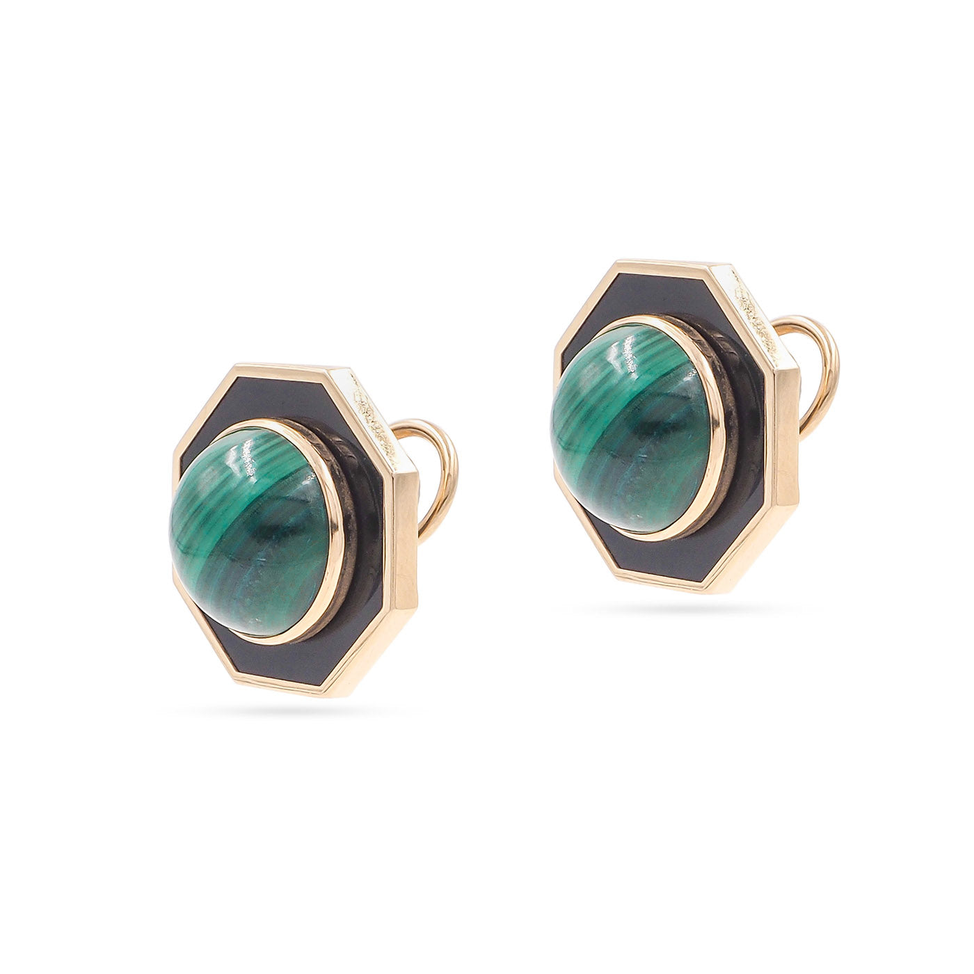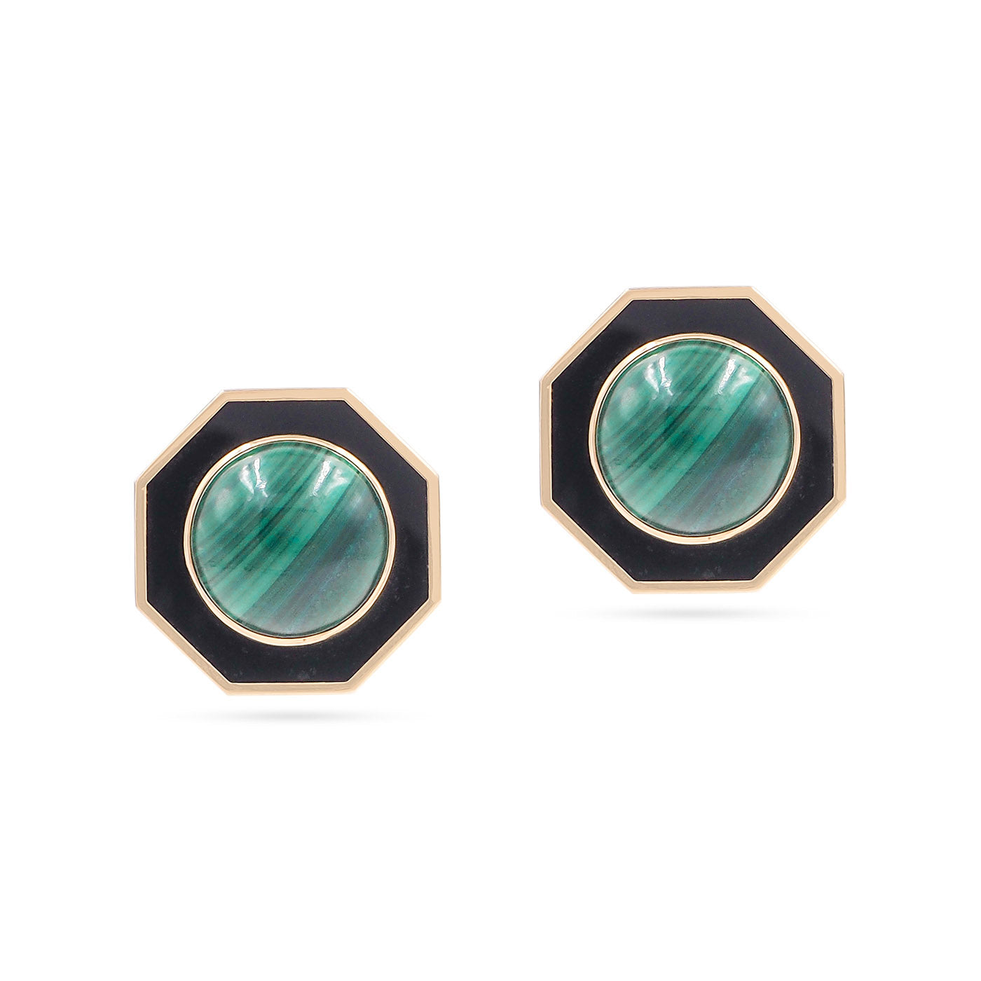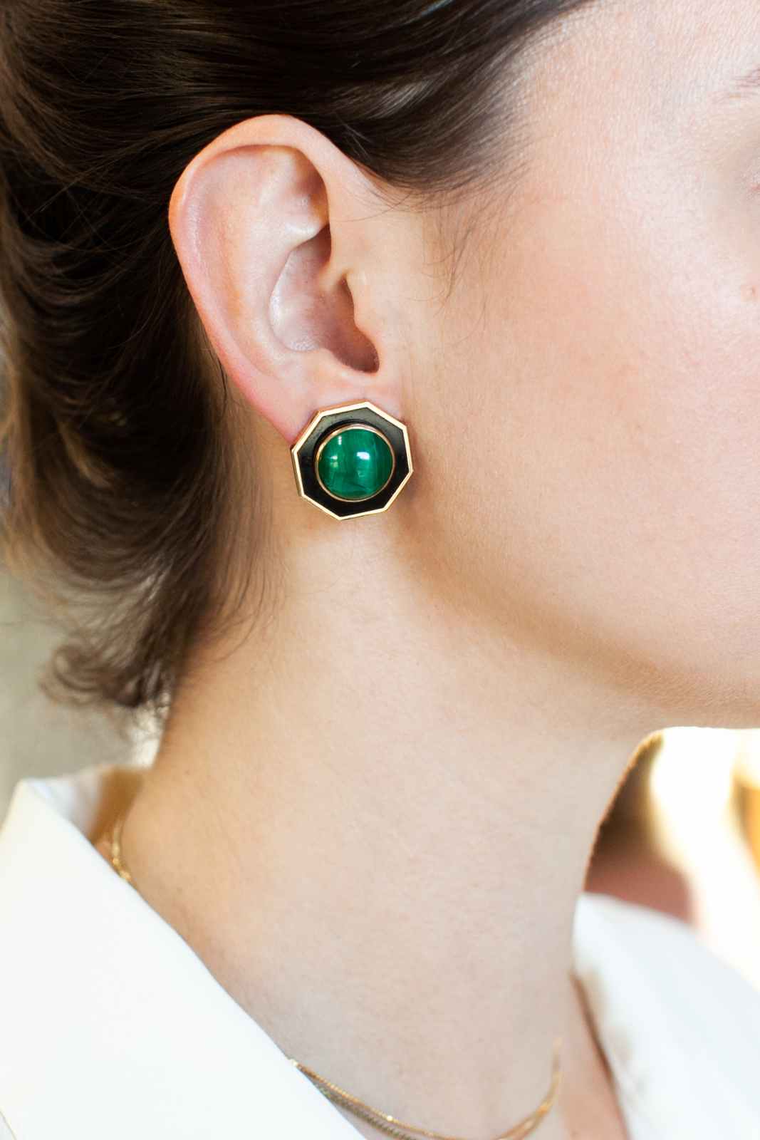 Vintage Malachite & Onyx Octagonal Earrings composed of 14k yellow gold. The earrings have round cabochon malachite at the centers bezel-set within onyx. The earrings measure approximately 22.7 mm tall by 22.6 mm wide & weigh 16.7 grams in total; with hinging lever post backs. Circa 1970’s.