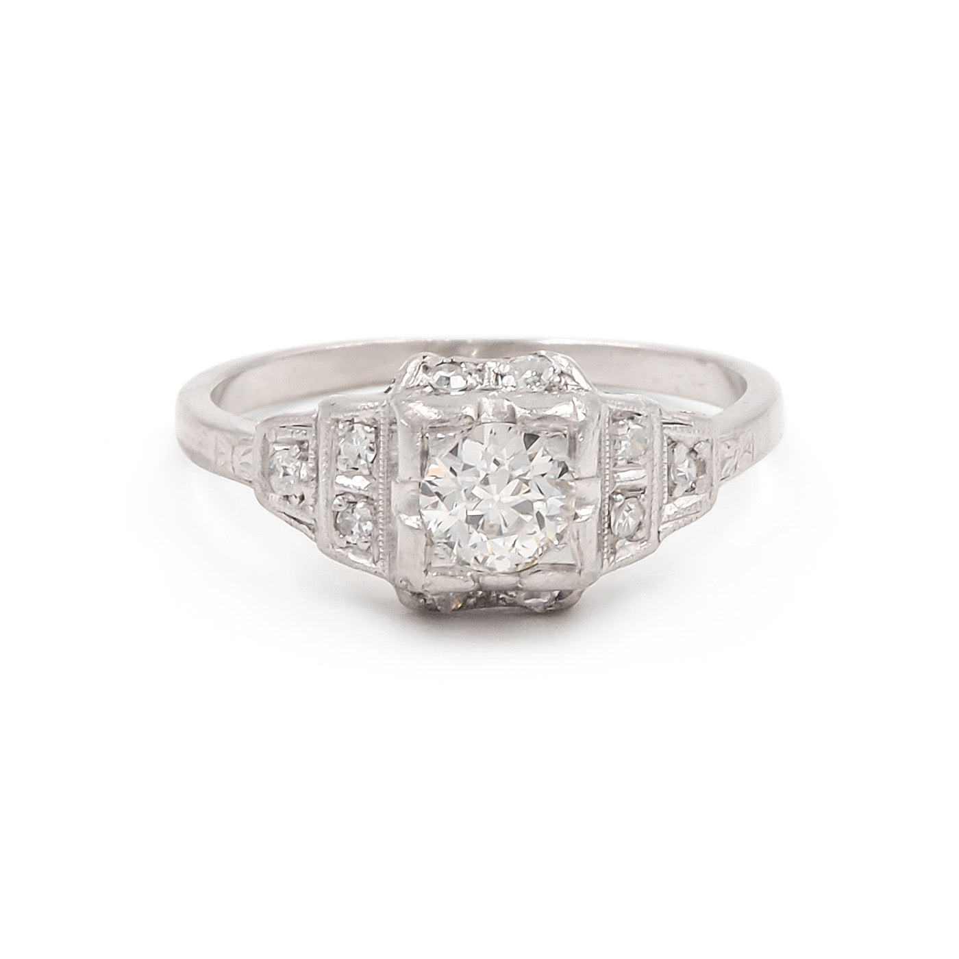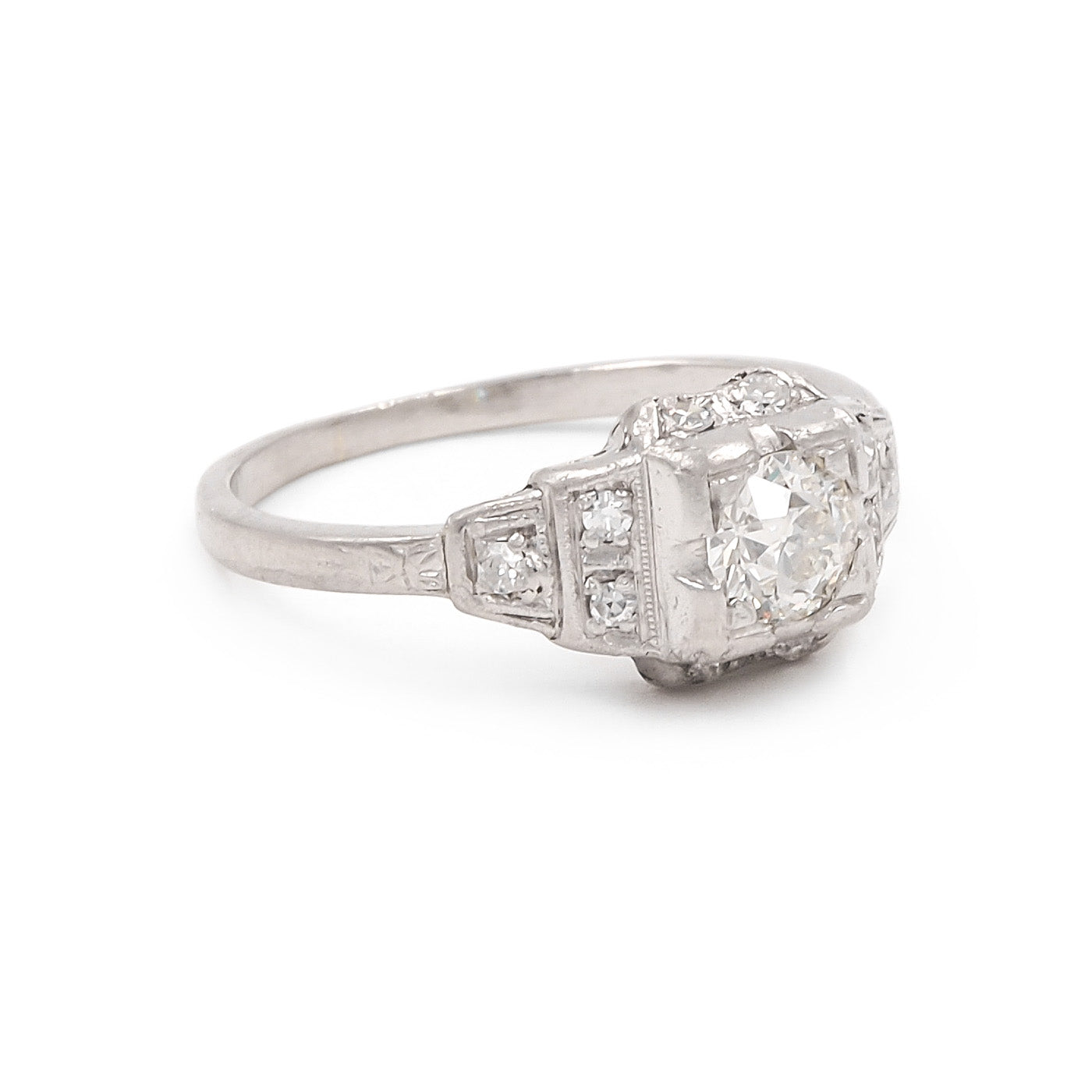 Art Deco era 0.50 Ct. Old European Cut Diamond Engagement Ring composed of platinum. The 0.50 carat Old European Cut diamond is estimated to have K-L color/VS2 clarity. With an additional 10 Single Cut diamonds accenting the setting, weighing approximately 0.10 carats in total. With a square shape to the setting, as well as geometric and engraved details to the shoulders; fine milgrain throughout. Circa 1925.