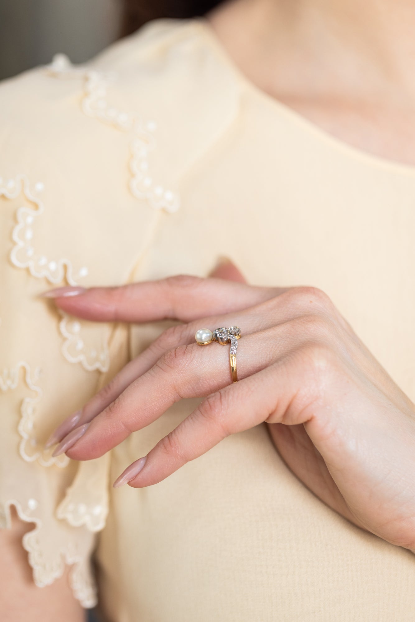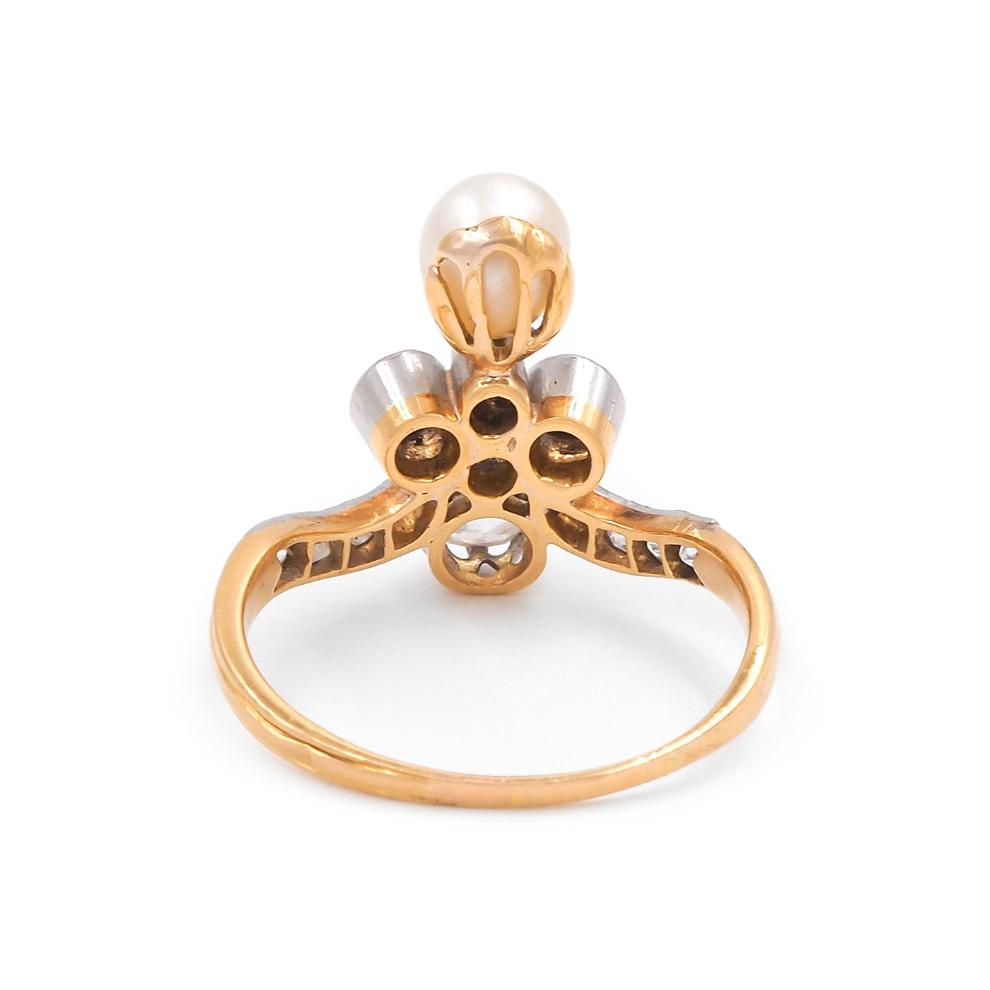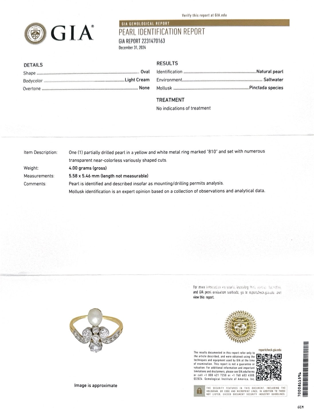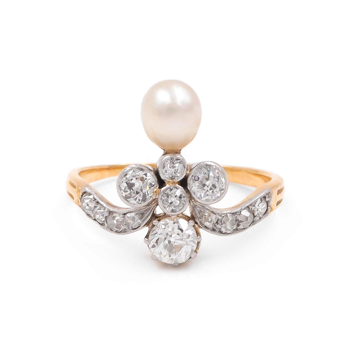 French Edwardian era Natural Pearl & Diamond Tiara Ring composed of 18k yellow gold & platinum. The setting is stylized as a 'tiara' motif, featuring a pearl sitting atop diamonds. The pearl is GIA certified to be Natural; the ring is also set with 12 diamonds, a combination of Old Mine Cut and Old European Cut diamonds, weighing approximately 1.00 carat in total. The front of the ring measures approximately 16.8 mm tall; with the diamonds set into platinum upon an 18k yellow gold shank. Hallmarked for French origin. Circa 1905.