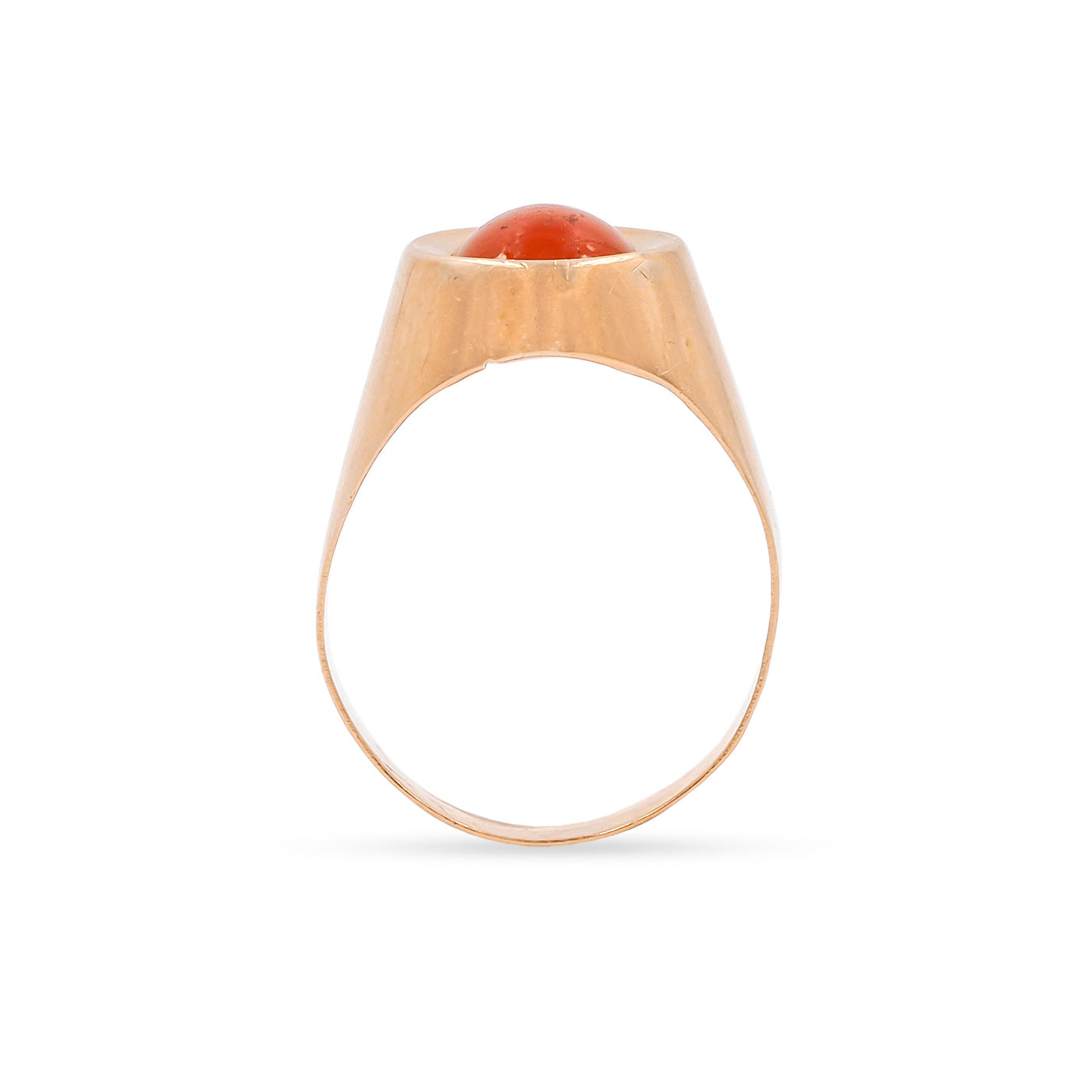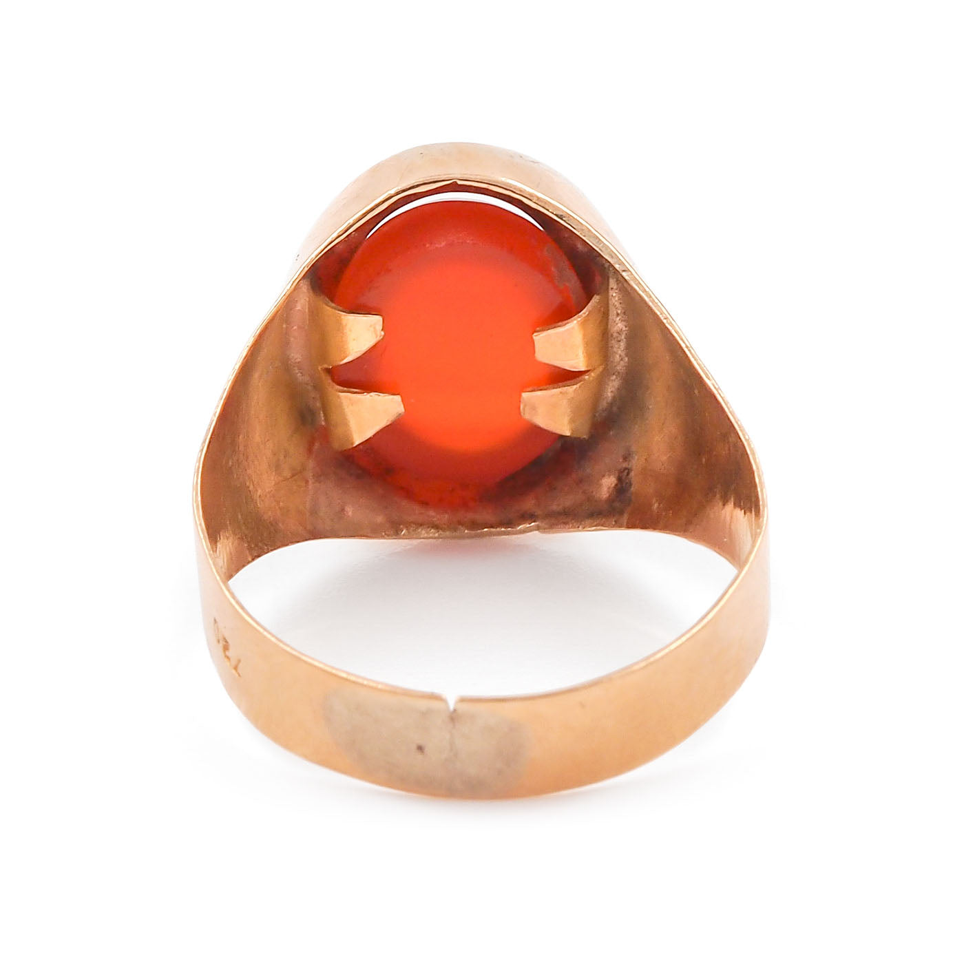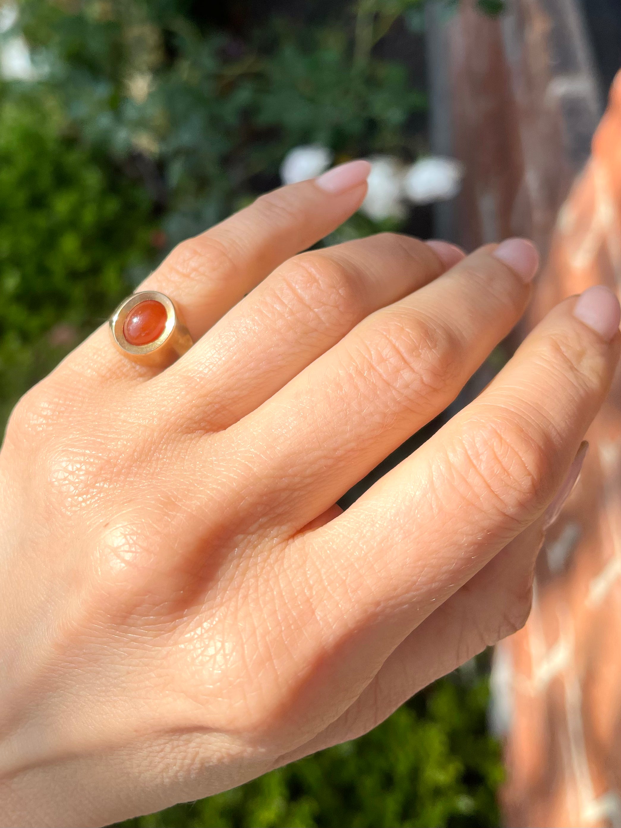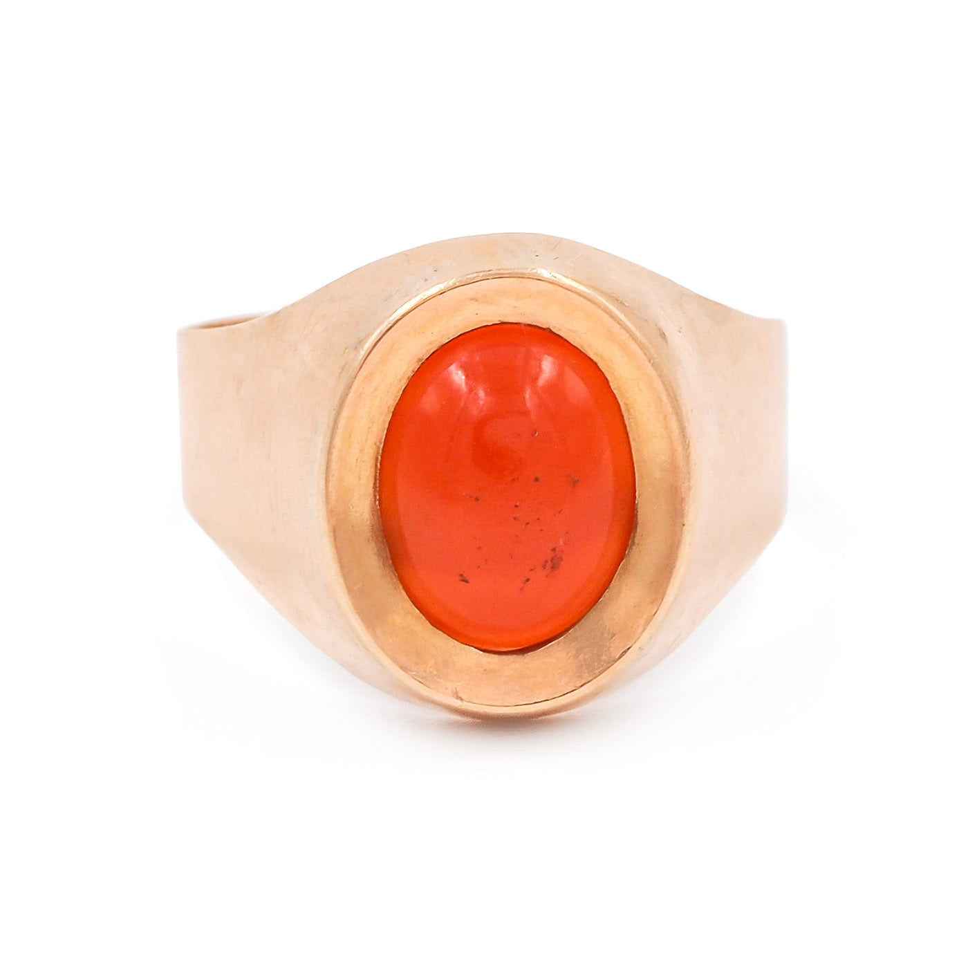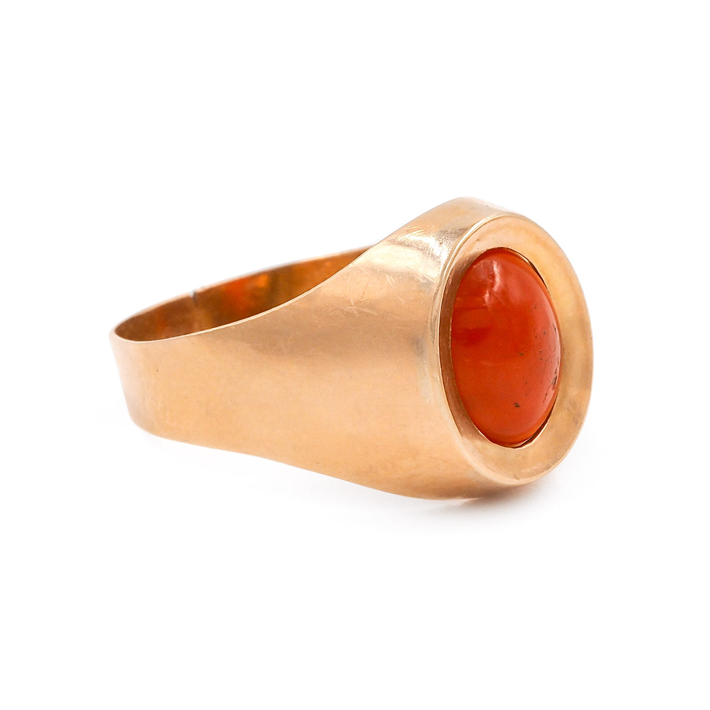 Vintage Oval Carnelian Signet Ring composed of 18k light yellow gold. The oval carnelian is set within a lowered gold bezel.