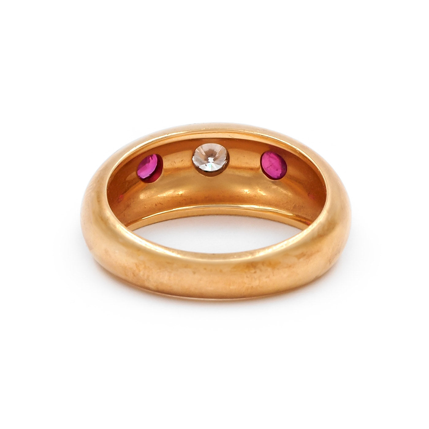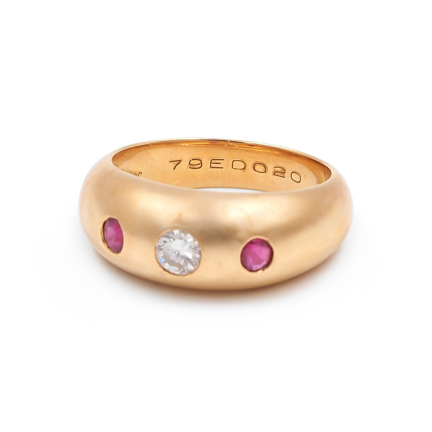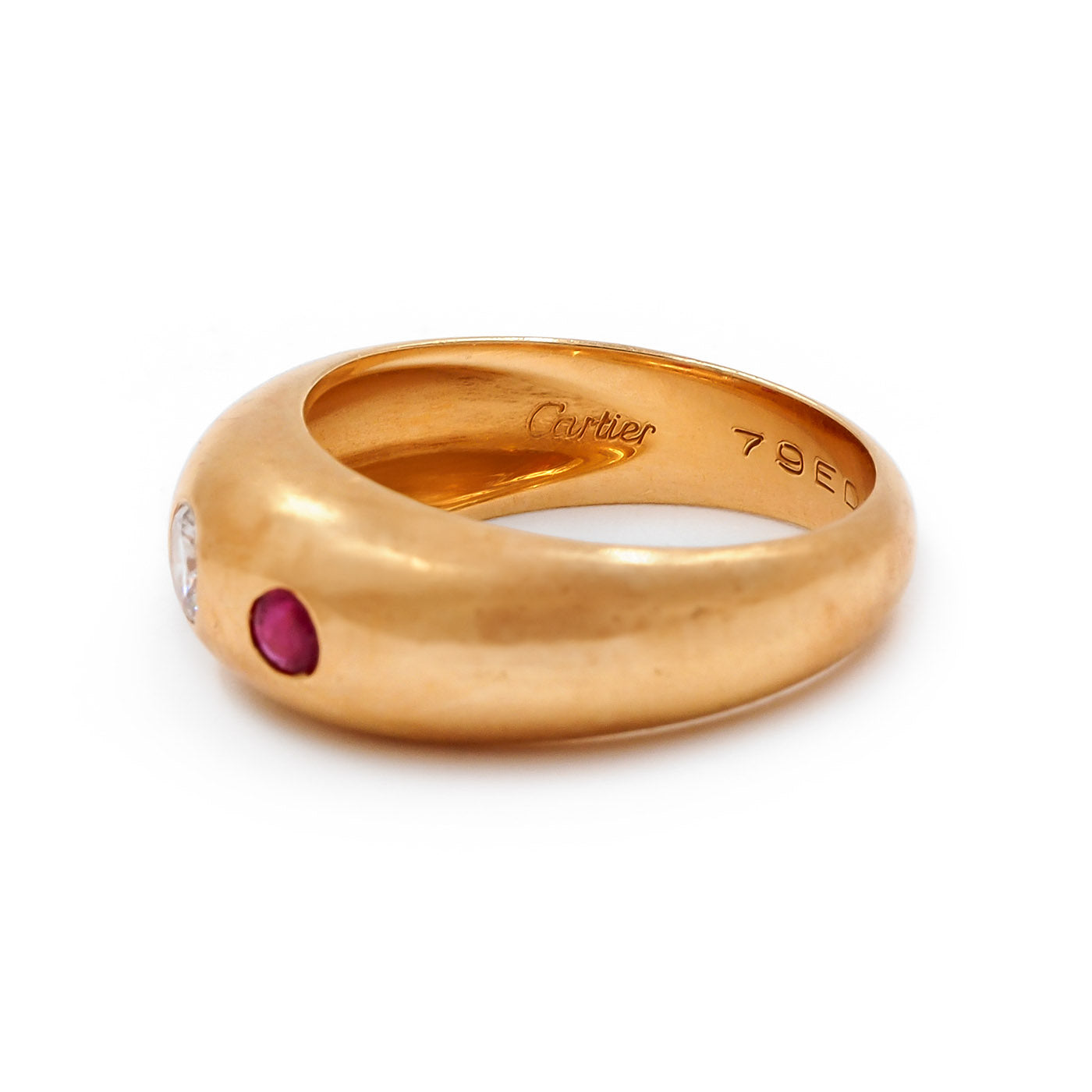 Vintage 'Daphne' Diamond & Ruby Ring By Cartier, composed of 18k yellow gold. With a central 0.20 carat Round Brilliant Cut diamond, flanked by 2 Round Cut natural rubies weighing approximately 0.24 carats in total. The ring measures approximately 7.9 mm wide at the front and weighs 8.07 grams. Stamped & signed ‘Cartier’, & ’54’ (for the ring’s size); also with a serial number. Circa 1990’s.