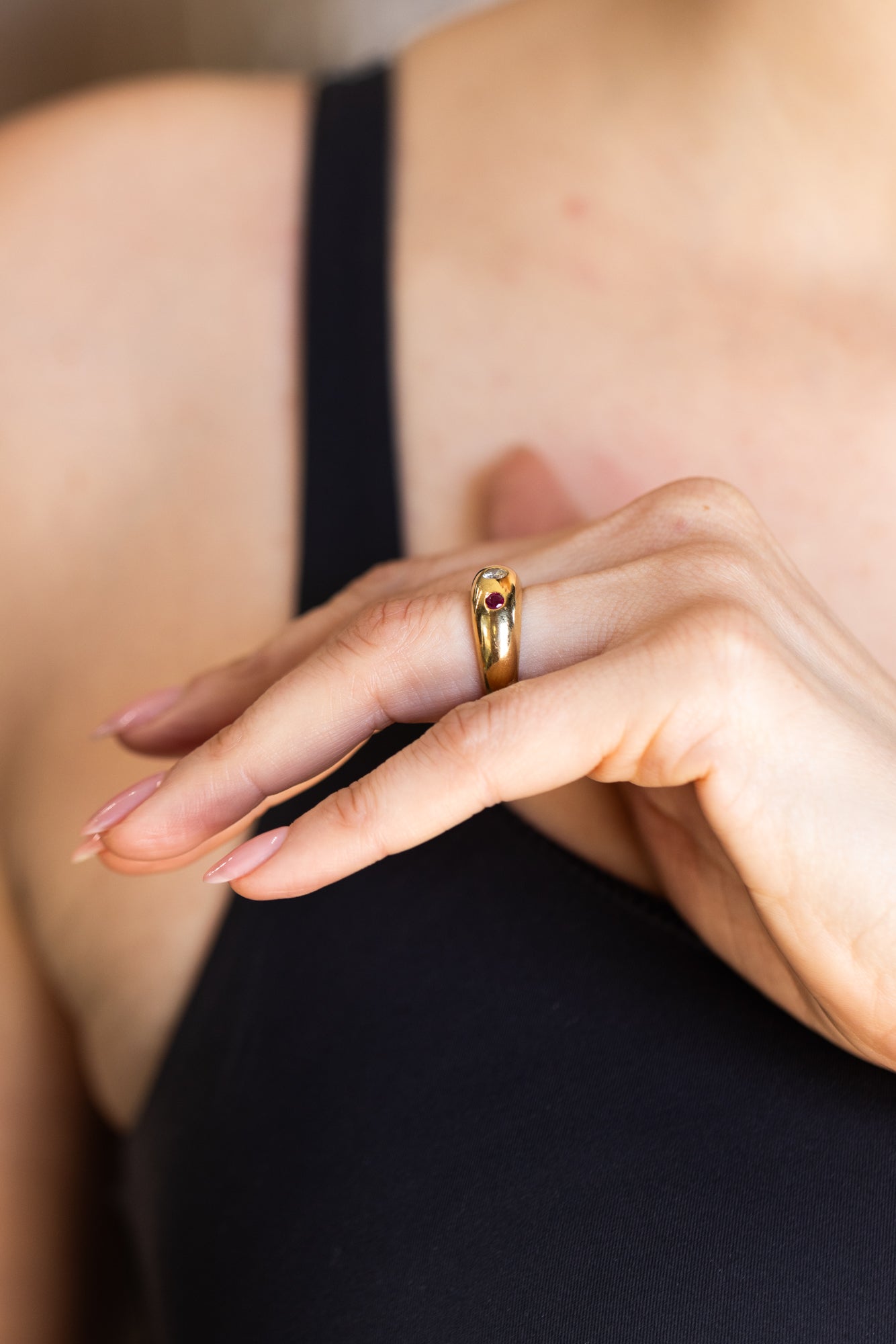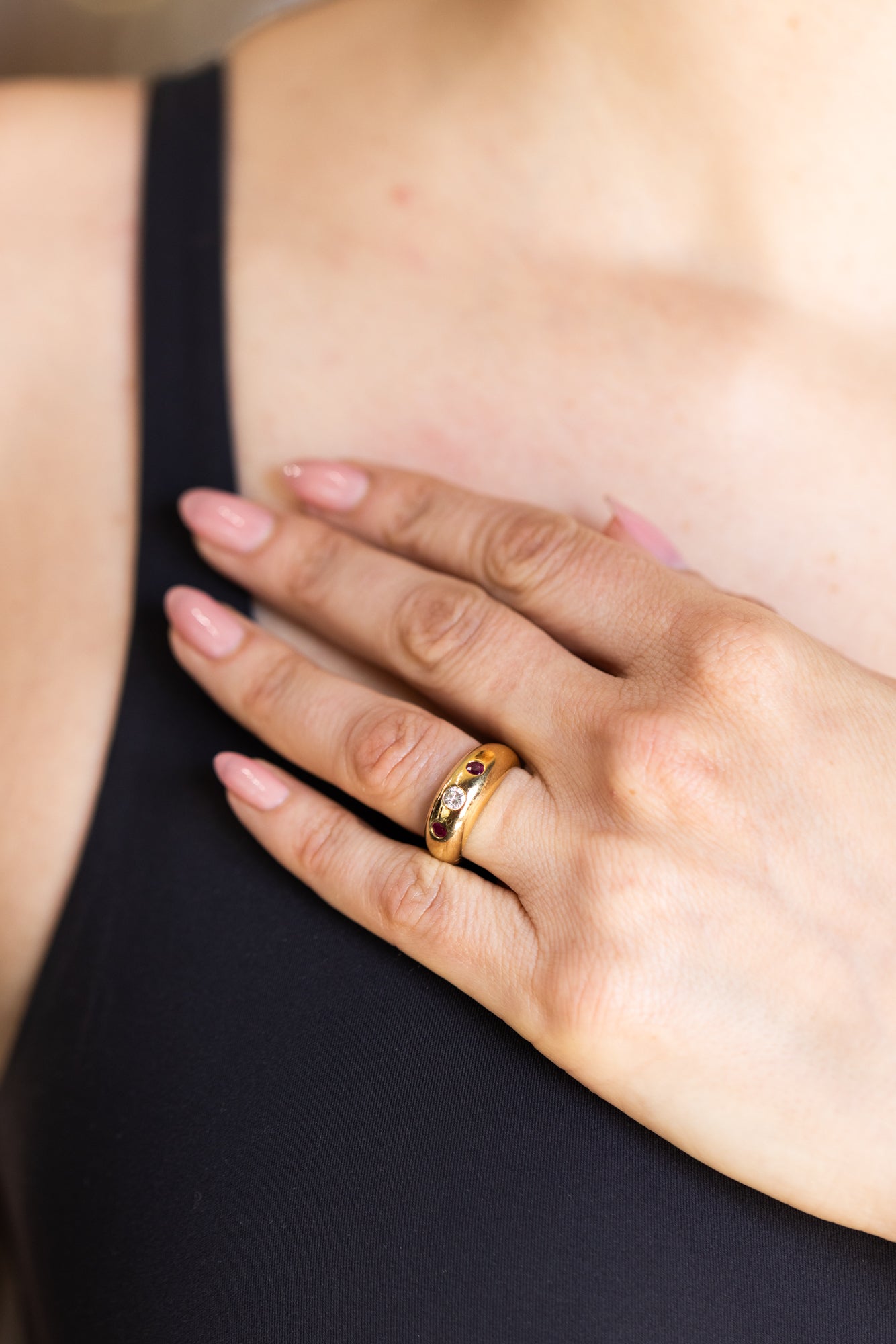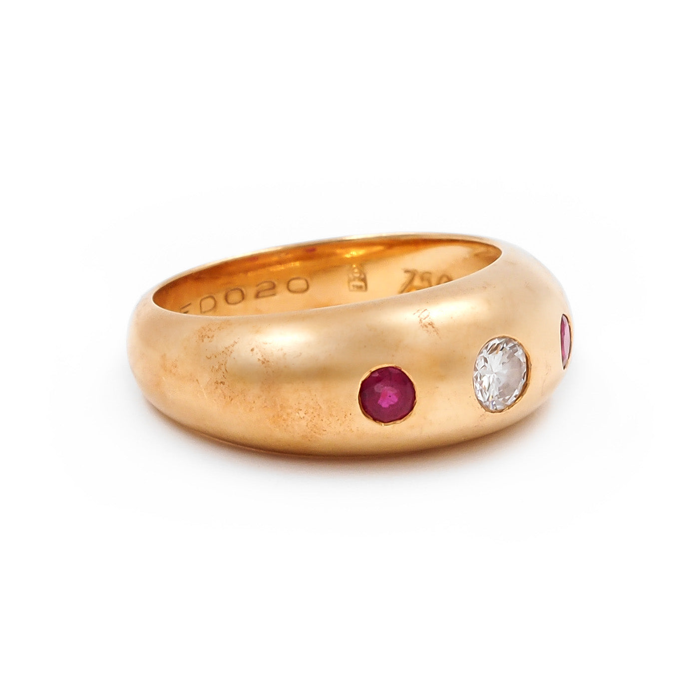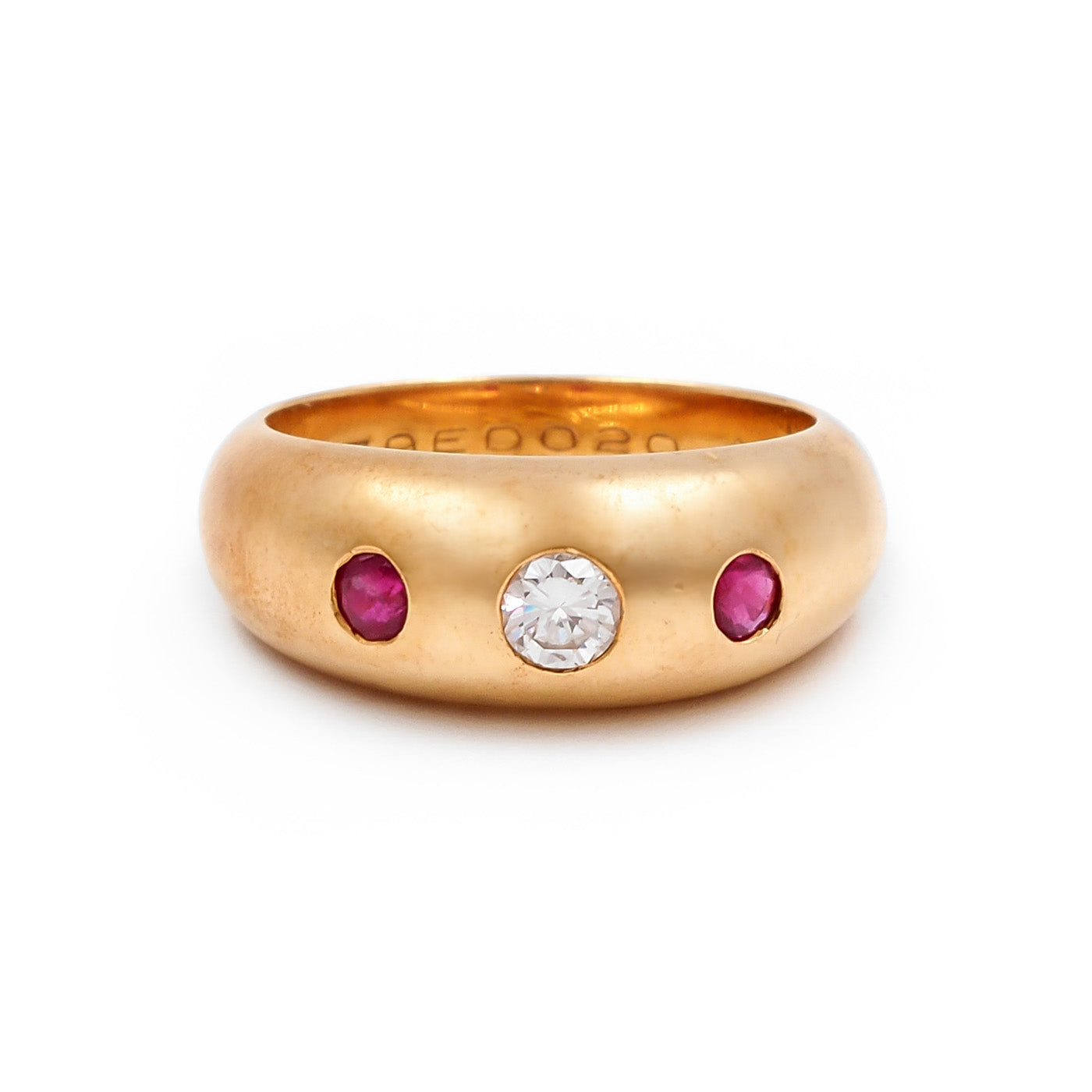 Vintage 'Daphne' Diamond & Ruby Ring By Cartier, composed of 18k yellow gold. With a central 0.20 carat Round Brilliant Cut diamond, flanked by 2 Round Cut natural rubies weighing approximately 0.24 carats in total. The ring measures approximately 7.9 mm wide at the front and weighs 8.07 grams. Stamped & signed ‘Cartier’, & ’54’ (for the ring’s size); also with a serial number. Circa 1990’s.