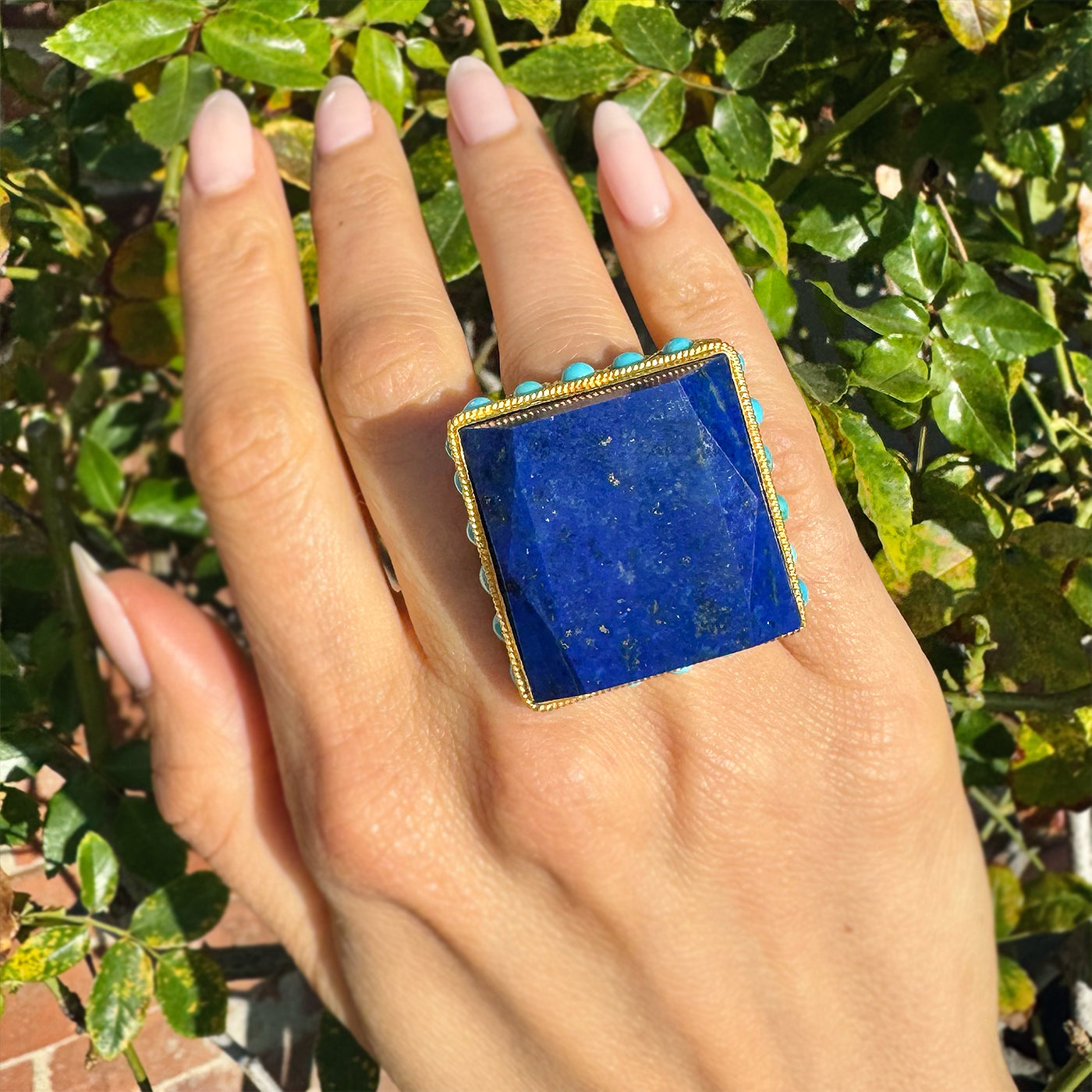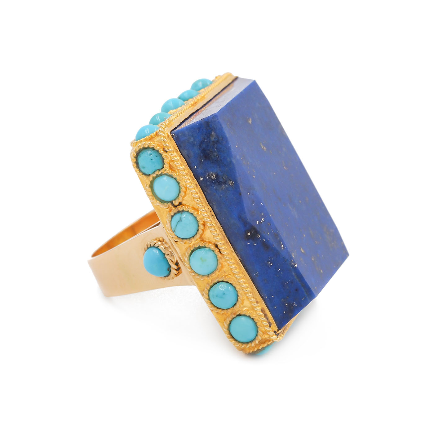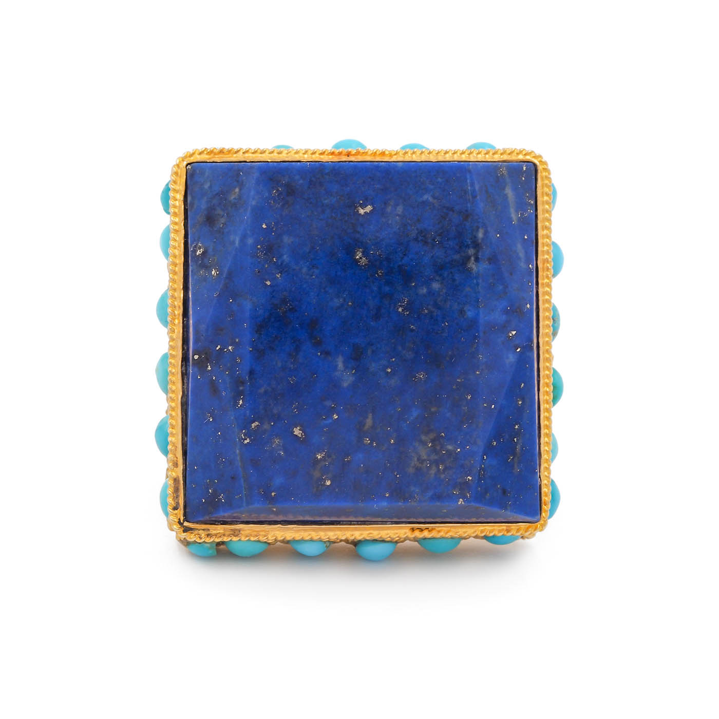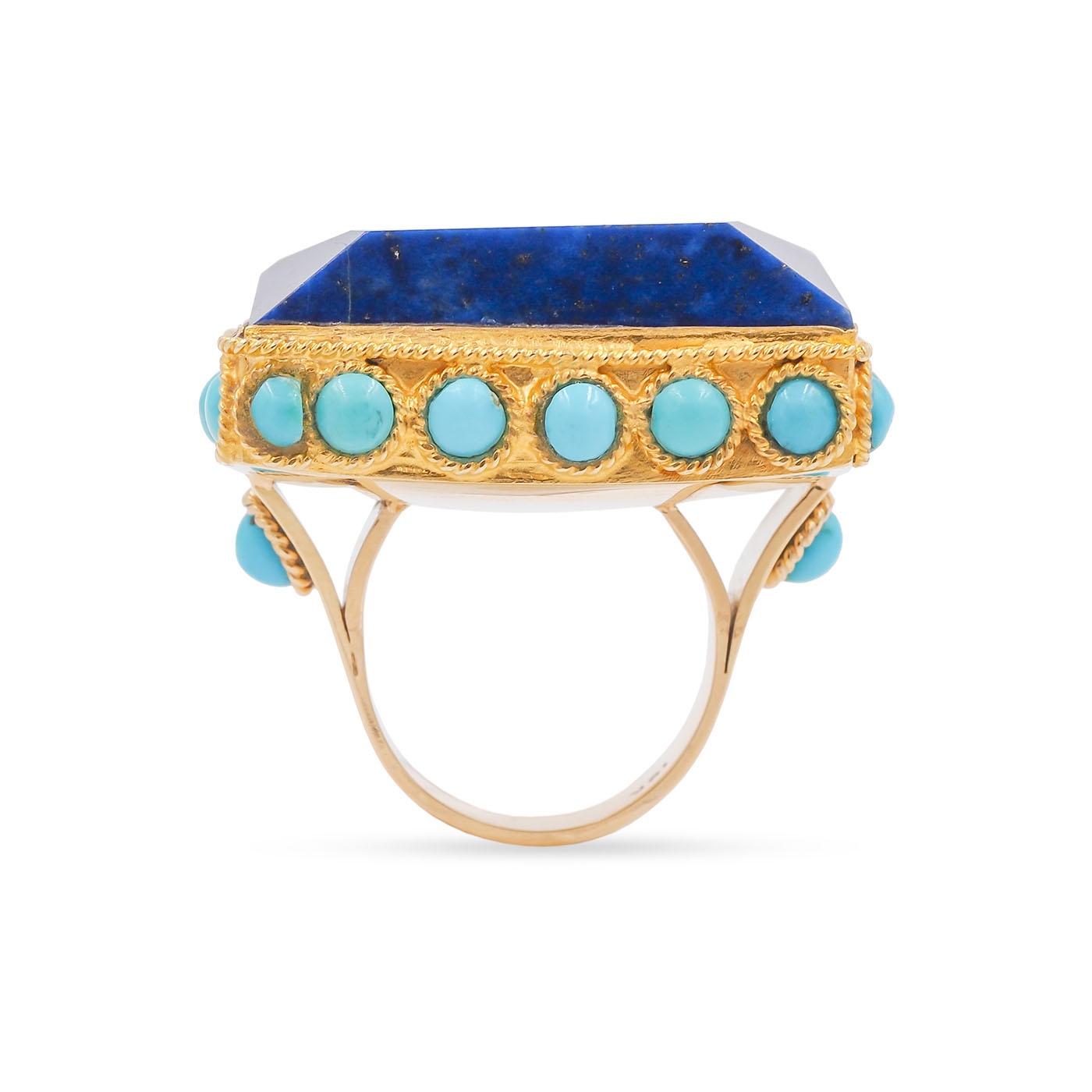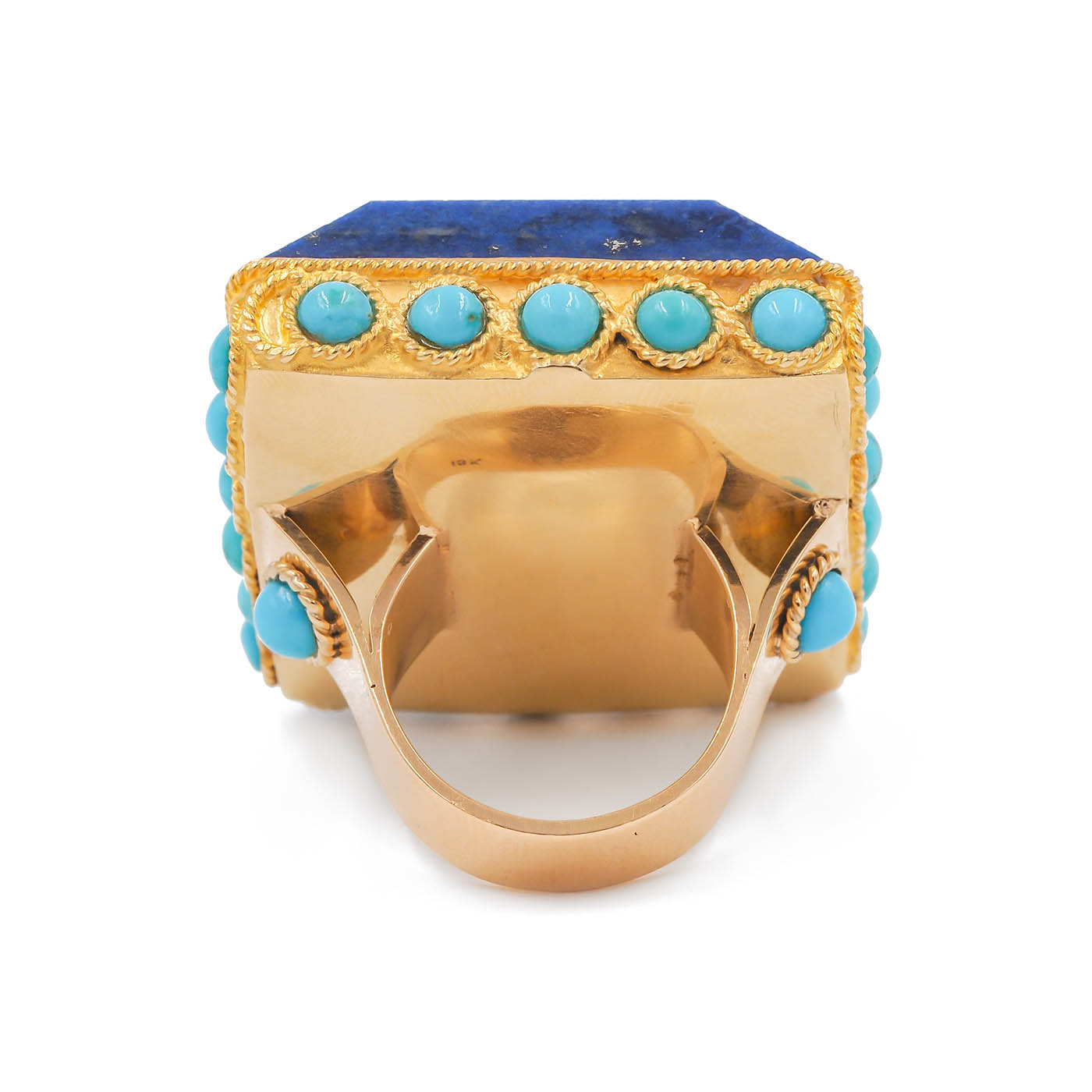 Vintage Lapis Lazuli & Turquoise XL Cocktail Ring composed of 18k gold. With a large square cabochon lapis lazuli at the center, surrounded by bezel-set cabochon turquoise along the 4 sides of the setting; with gold bead and twisted rope details throughout. The front of the ring measures approximately 1 1/4″ tall by 1 1/4″ wide; the ring weighs 41.21 grams. Circa 1970’s.
