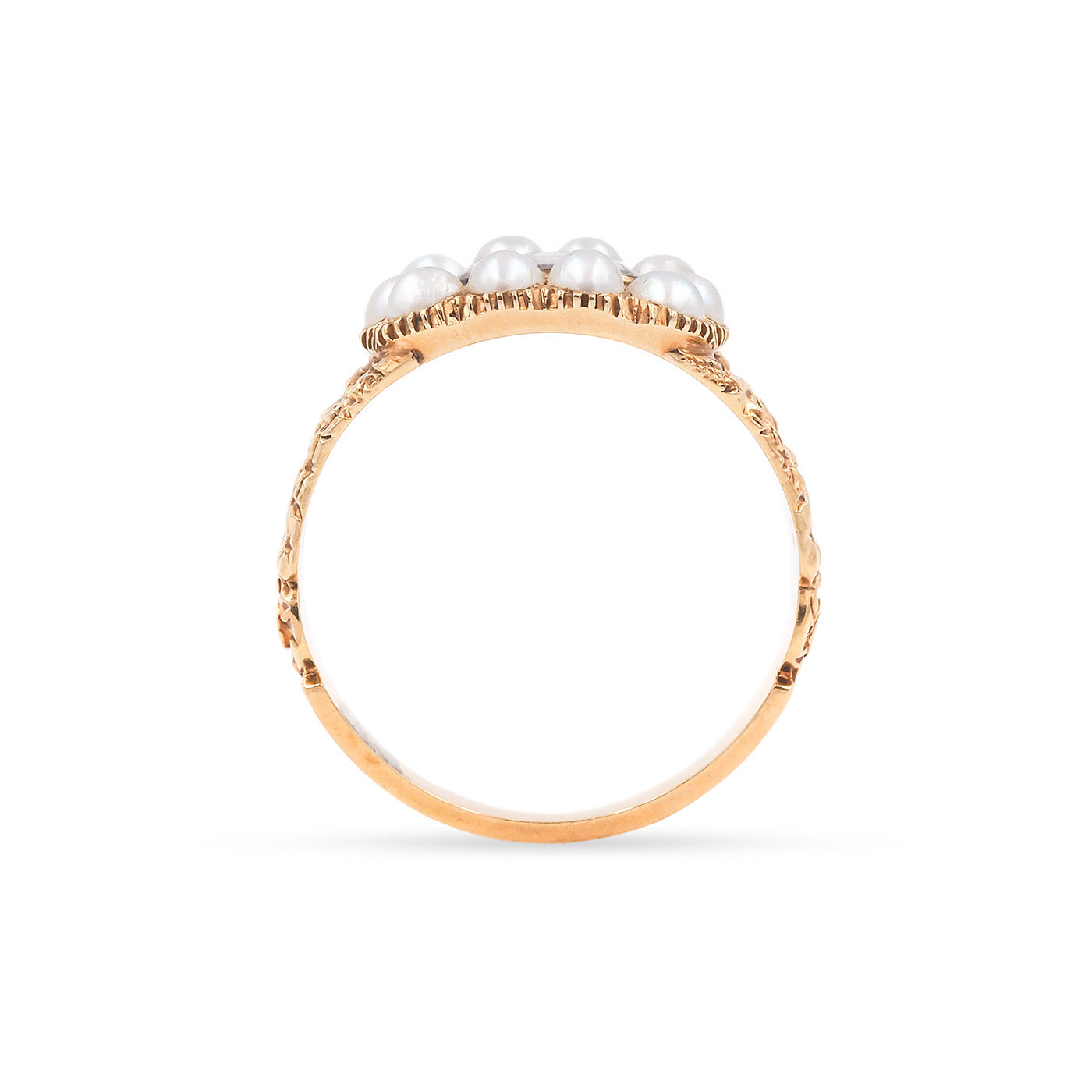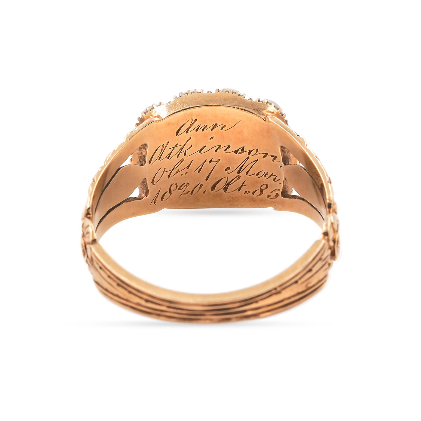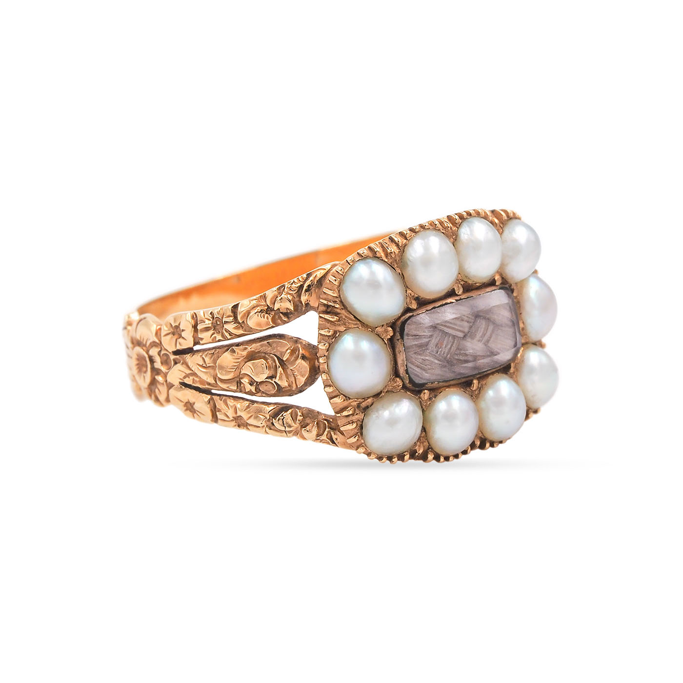 Georgian era Pearl Memorial Ring composed of 15k yellow gold. With woven hair at the glass-covered center, framed by pearls. The setting and shoulders have hand-chased and engraved details. Ring measures approximately 12.5 mm wide at the front. Engraved with ‘Ann Atkinson Obt 17 Mar 1820…Oct 85’ (see photo). Circa 1885.