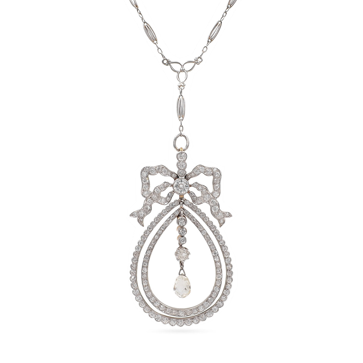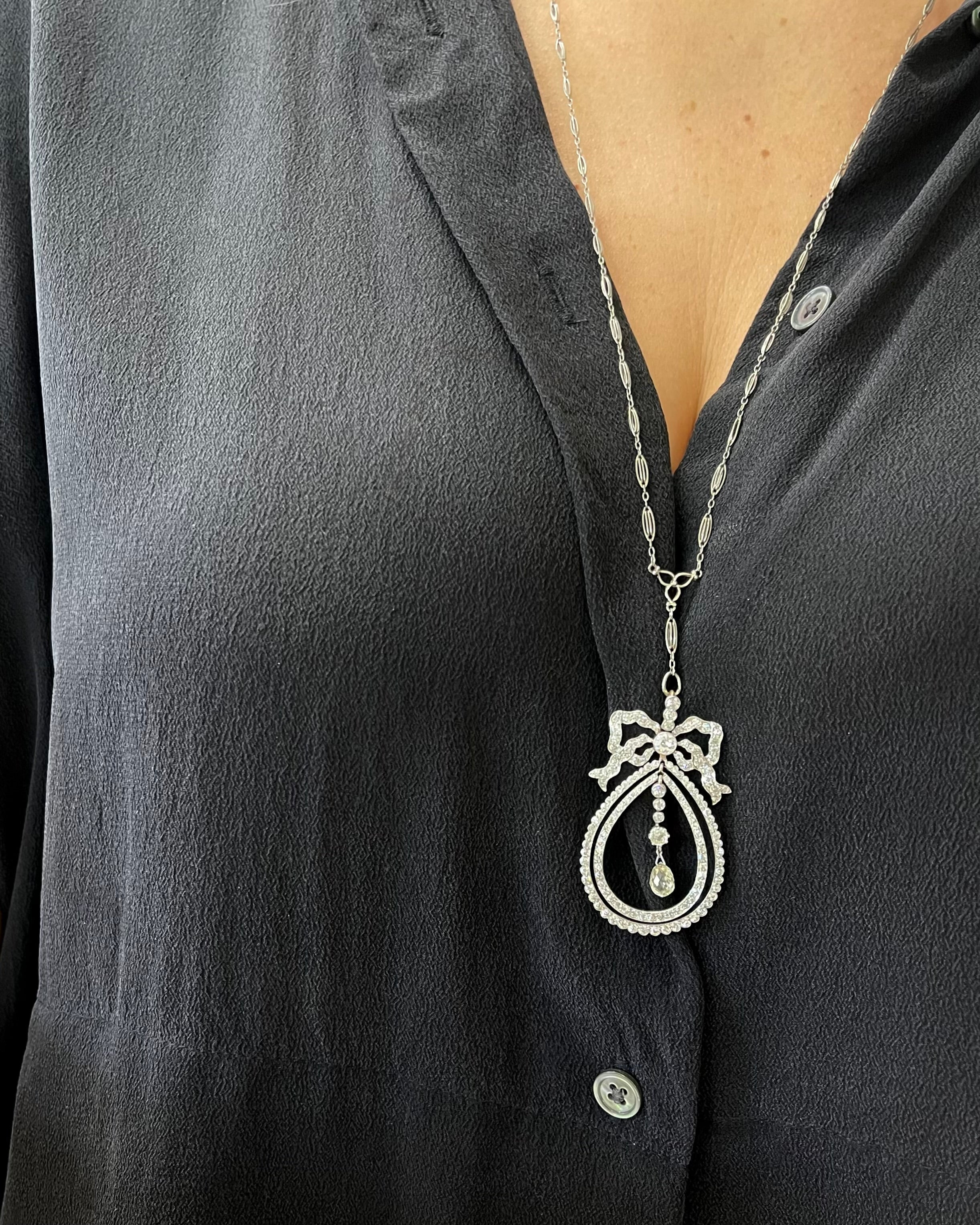 Edwardian 0.75 Ct. Briolette Cut Diamond Bow-Motif Pendant Necklace