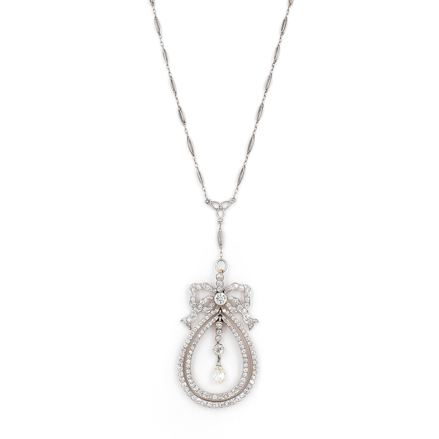 Edwardian era 0.75 Ct. Briolette Cut Diamond Bow-Motif Pendant Necklace composed of platinum and 18k white gold. Featuring a 0.75 carat Briolette Cut diamond as the center component of this pendant, estimated to have N-O color/SI1 clarity. The pendant has an ornate bow-motif design featuring an additional 153 diamonds, a combination of Old European and Old Mine Cut diamonds, weighing approximately 3.07 carats in total. The pendant measures approximately 1 3/4" tall by 1 3/4" wide. The pendant weighs approximately 7.9 grams. Circa 1910.
