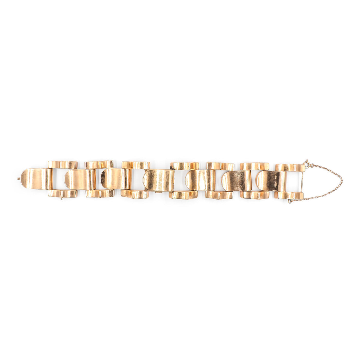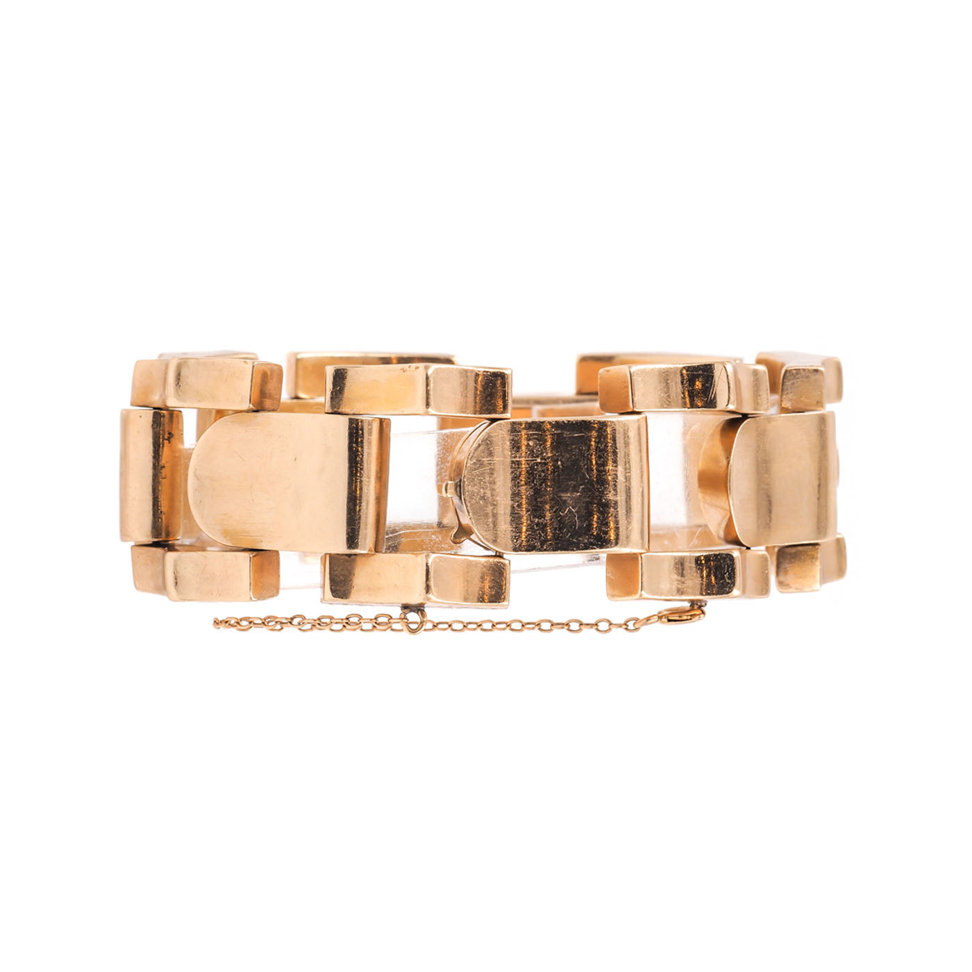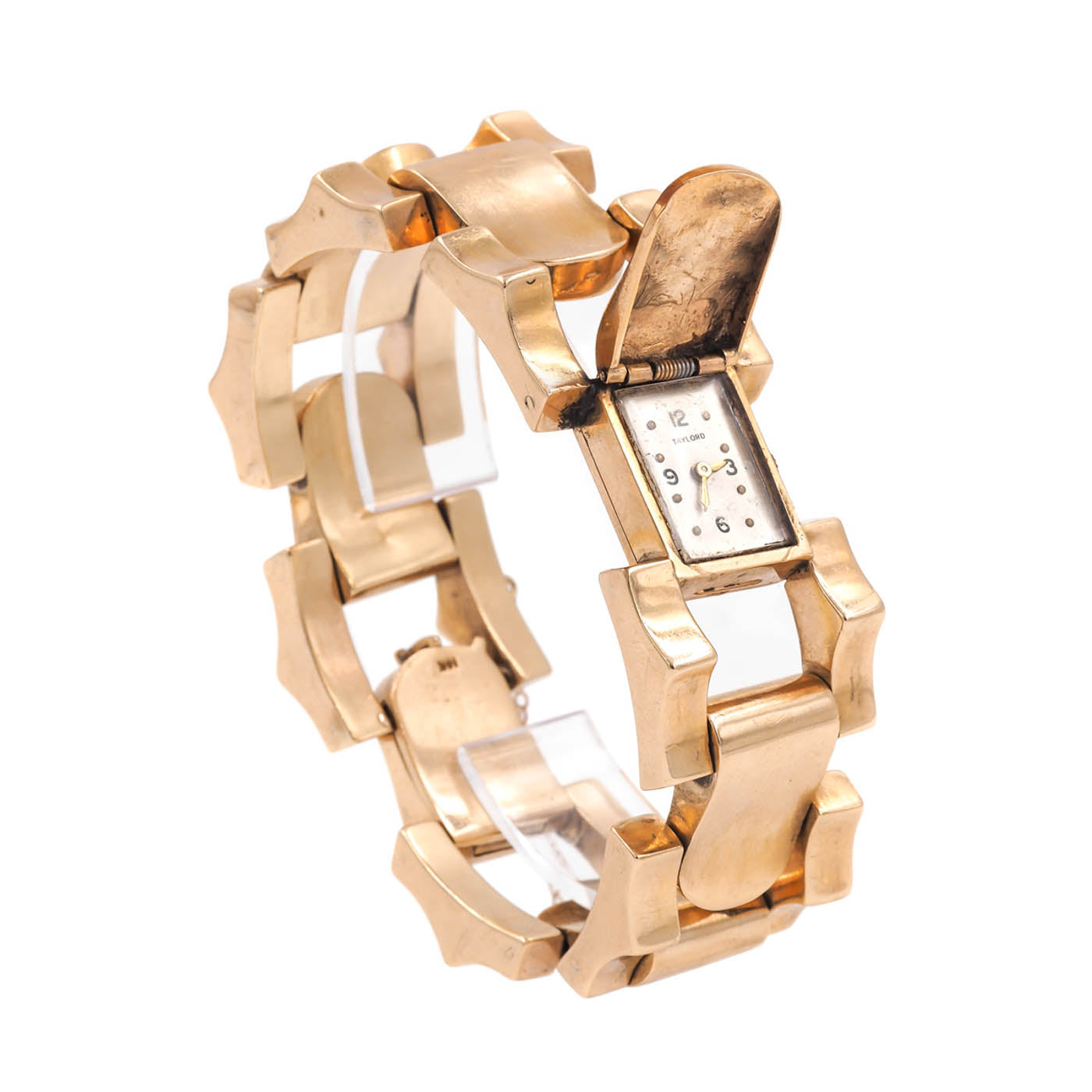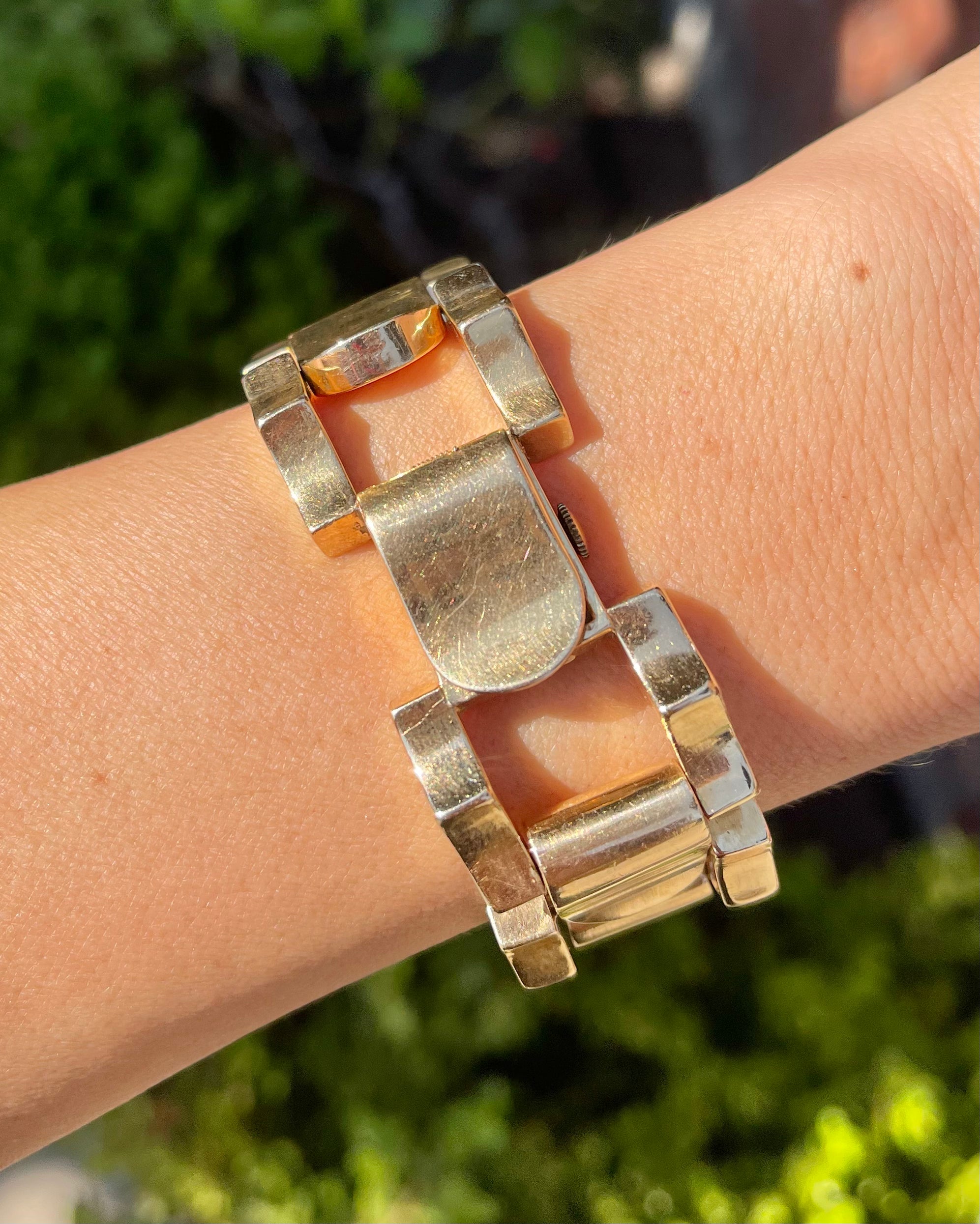 Retro Tank Bracelet Watch, composed of 14k yellow gold. This bracelet watch has a tank-style to its design, with a hidden watch component at the center. The bracelet measures approximately 7 1/4" long and 1" wide; weighs 70.7 grams. With a hidden clasp and guard chain. The rectangular center watch is manual wind. Circa 1935-1940’s.