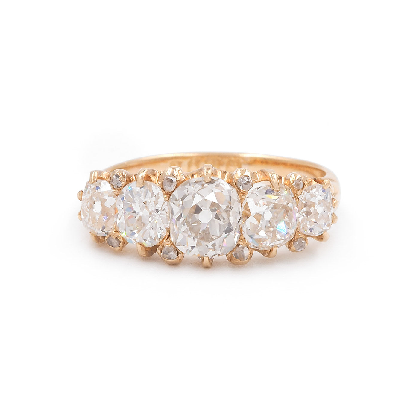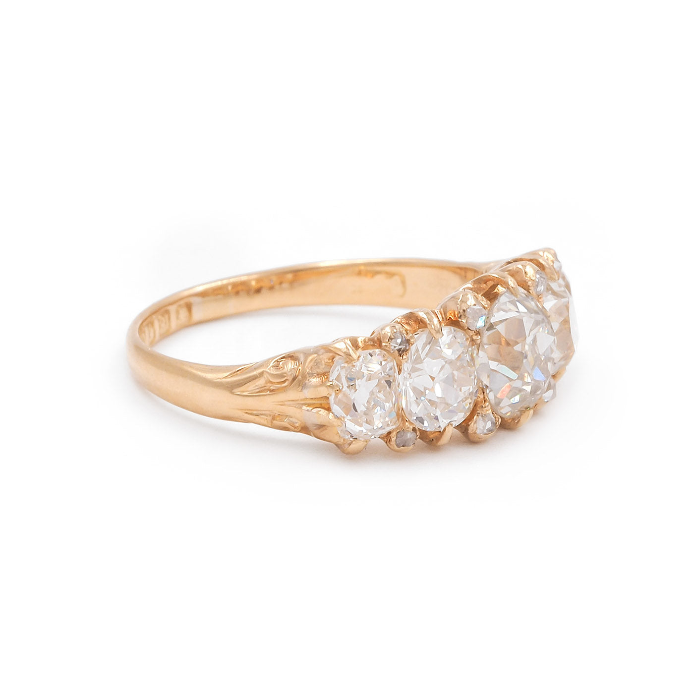 English Victorian era 3.39 Ctw. Old Mine Cut Diamond 5-Stone Ring composed of 18k yellow gold. With a center 1.22 carat Old Mine Cut diamond that is GIA certified to have L color/SI1 clarity. Flanked by 4 Old Mine Cut diamonds in total: one of the larger side stones is 0.69 carats and GIA certified to have K color/SI1 clarity, the other larger side stone is 0.84 carats and GIA certified to have J color/VS2 clarity; with the remaining 2 Old Mine Cut diamonds weighing approximately 0.64 carats in total. With 8 smaller Rose Cut diamonds accenting the multi-claw prong mounting. Circa 1890-1900.